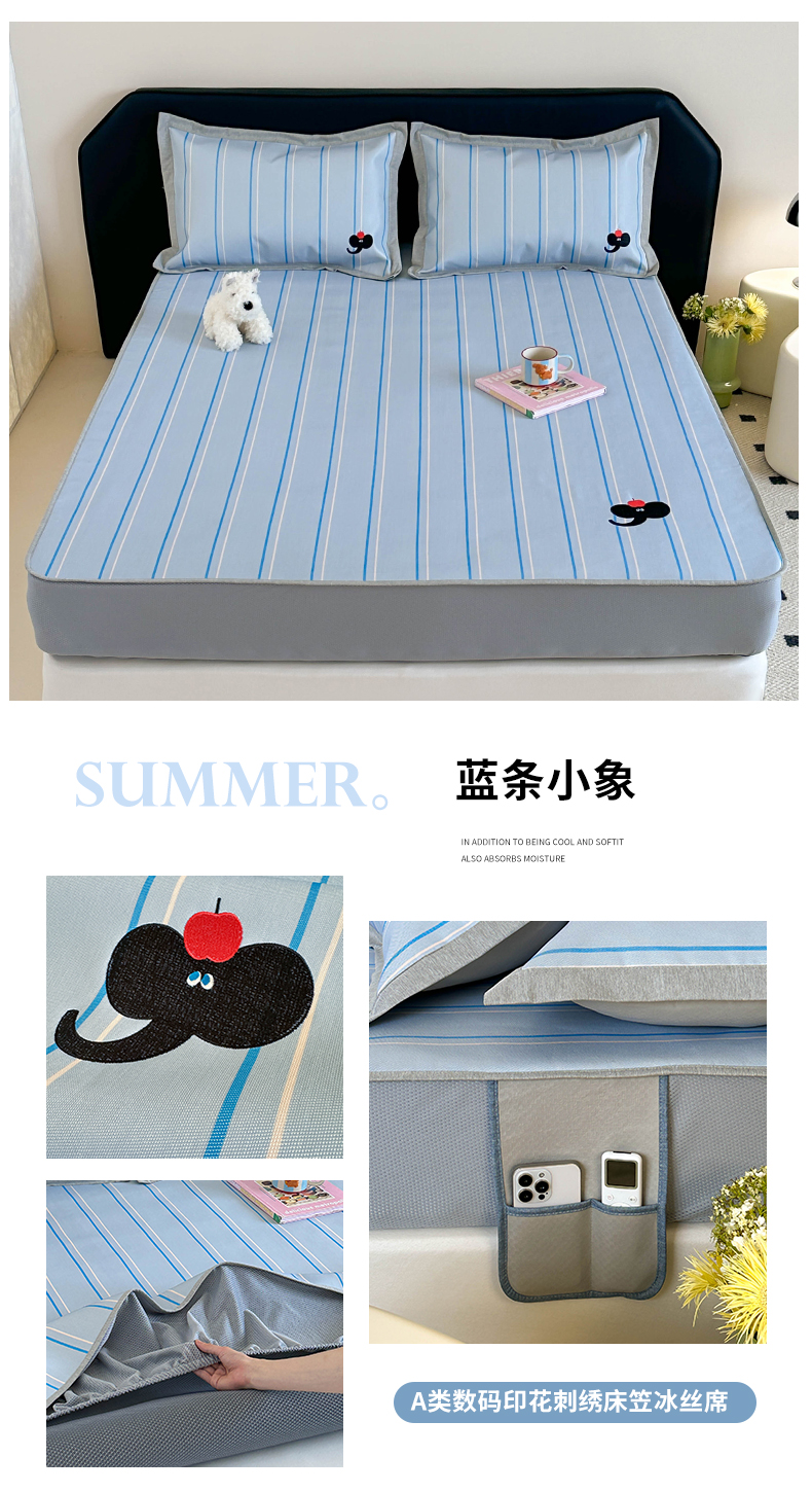昔可家纺 2024新款A类900D数码印花刺绣床笠款冰丝席 蓝条小象