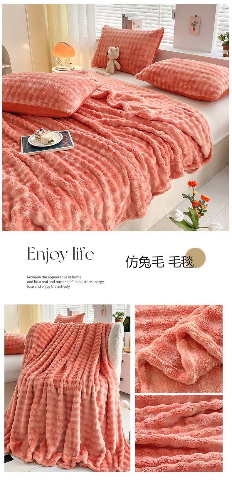 商品名称:芸锦豪 2024新款仿兔毛泡泡绒毛毯-卷边款毛毯海棠粉-卷边