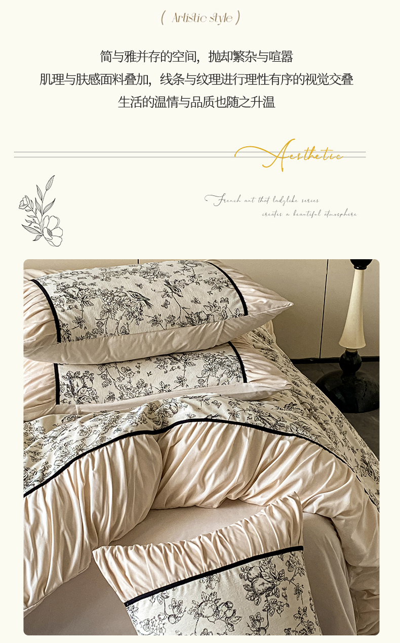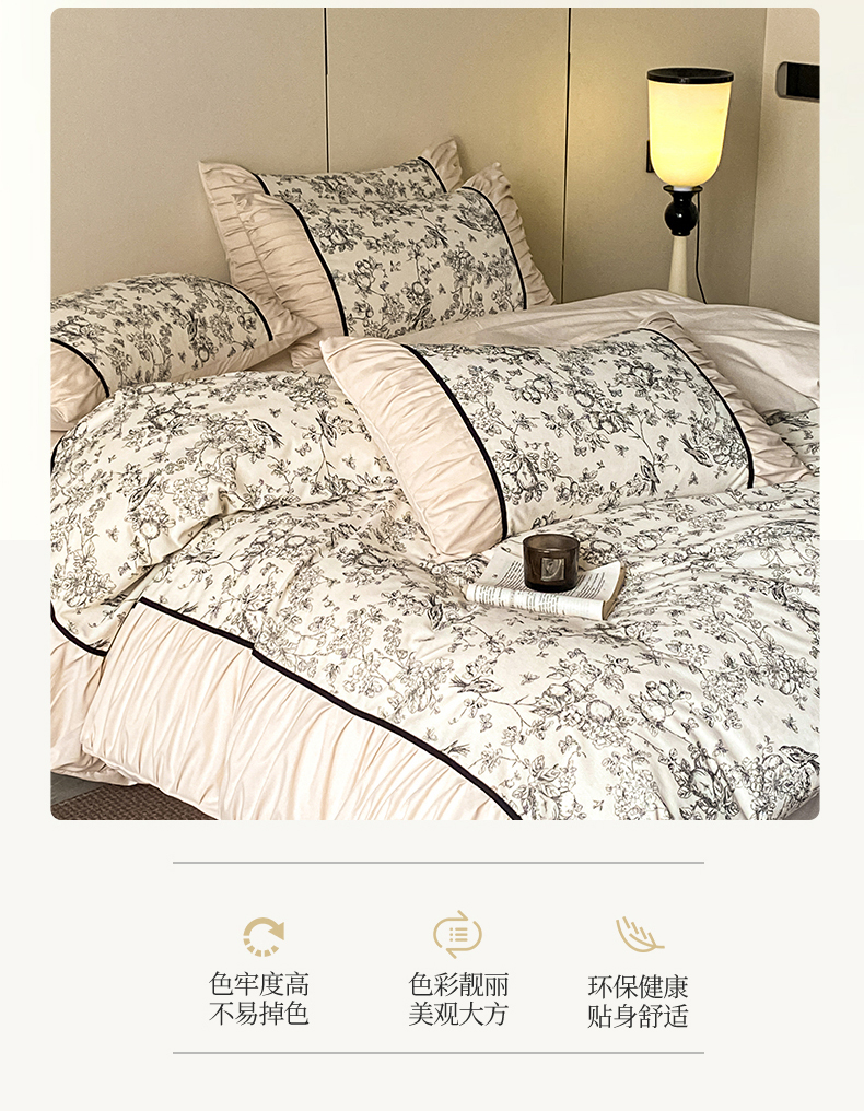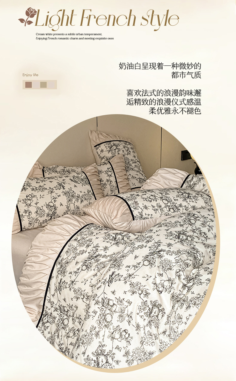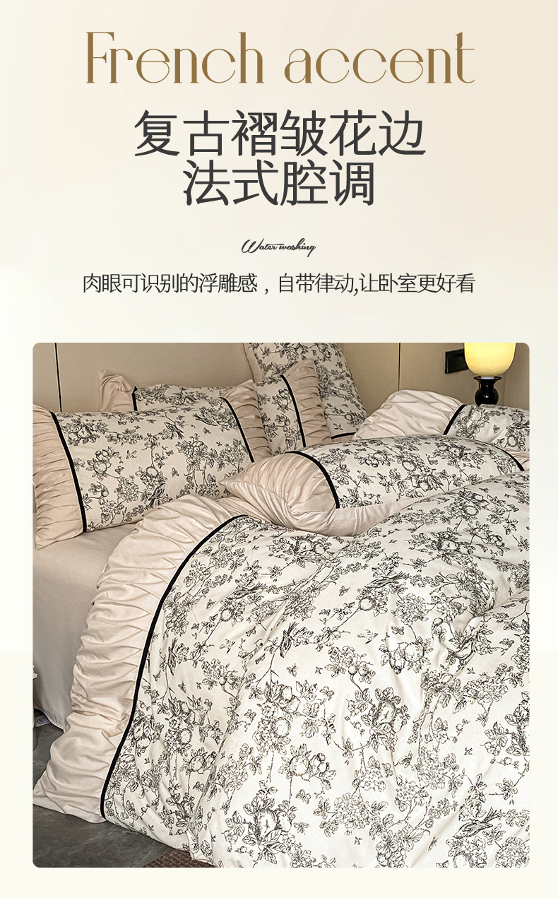 一左一右 2024秋冬新款法式复古印花褶皱花边水洗磨毛四件套-场景一(提供买家秀) 奶油白