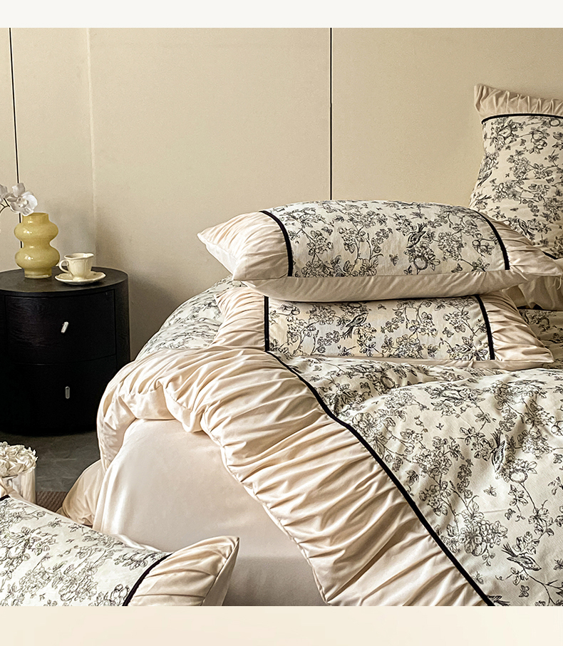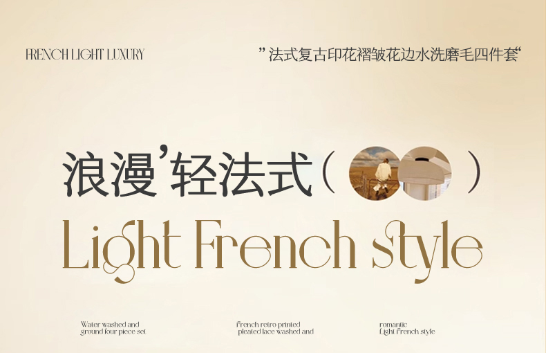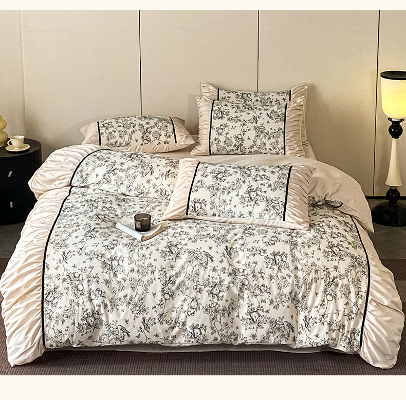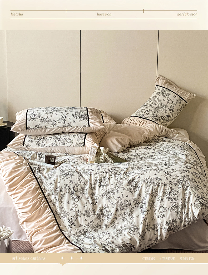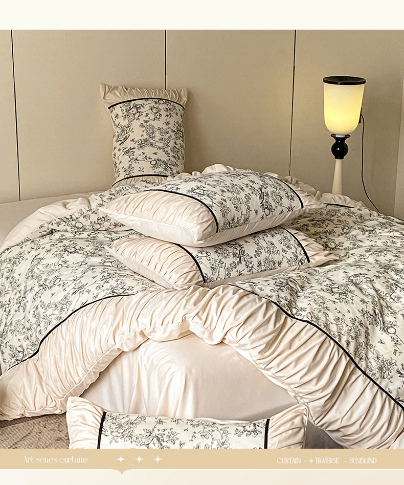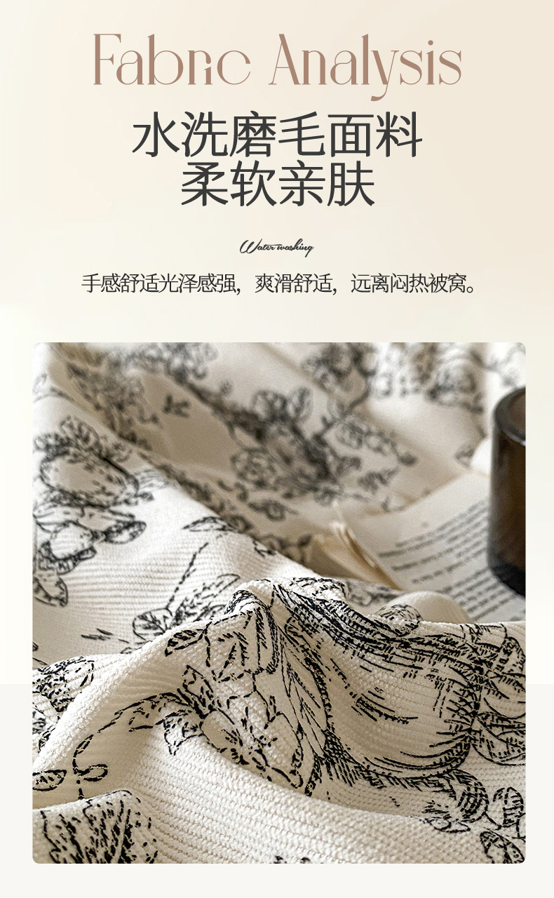 一左一右 2024秋冬新款法式复古印花褶皱花边水洗磨毛四件套-场景一(提供买家秀) 奶油白