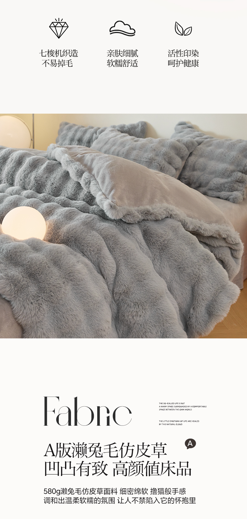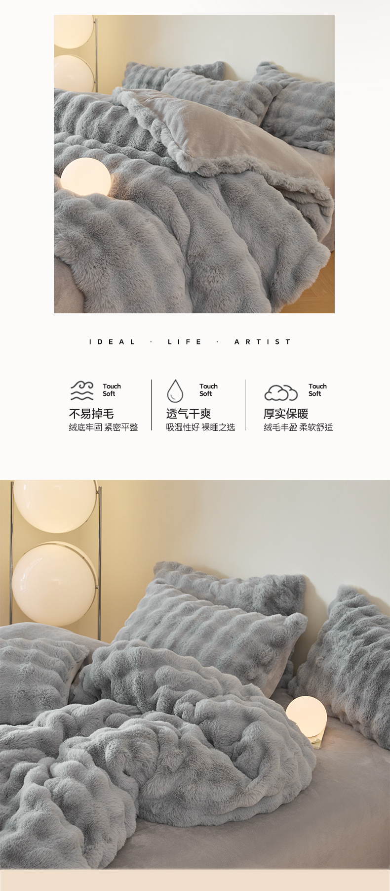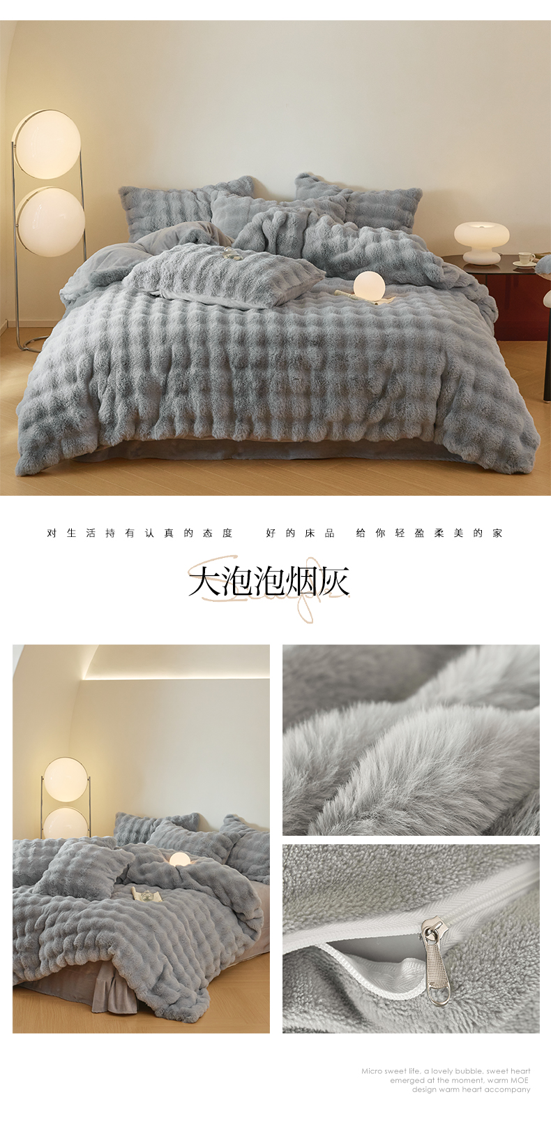 当前位置: 91家纺网 > 商品网购 > 床品套件 > 四件套 > 牛奶绒四件套 > 铠畅家纺 2024新款直播爆款高端A类獭兔毛立体剪花牛奶绒四件套 纯色大泡泡烟灰