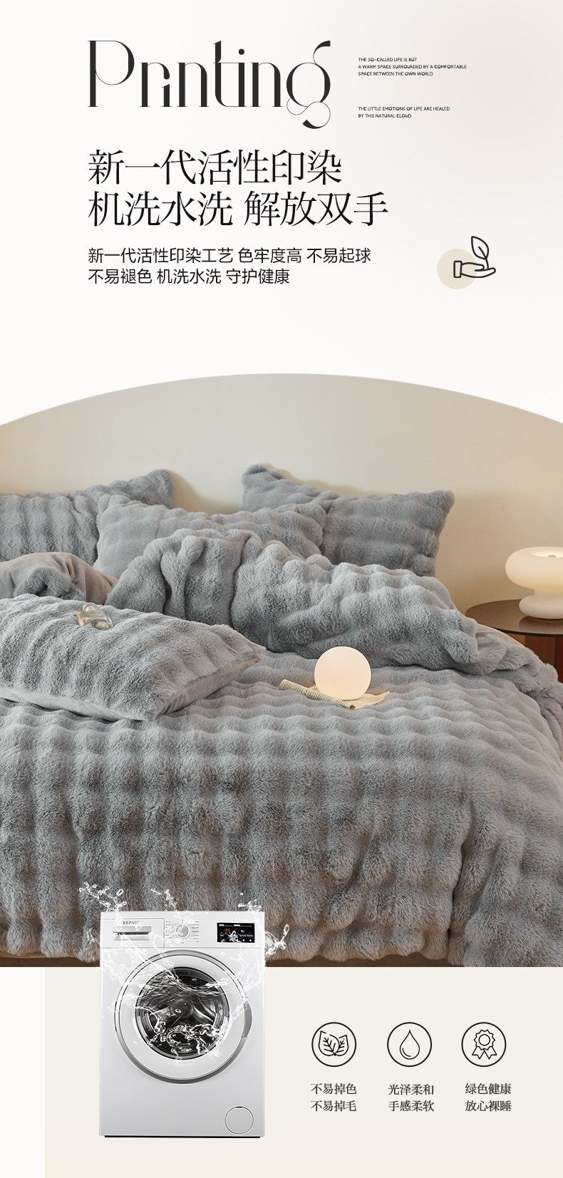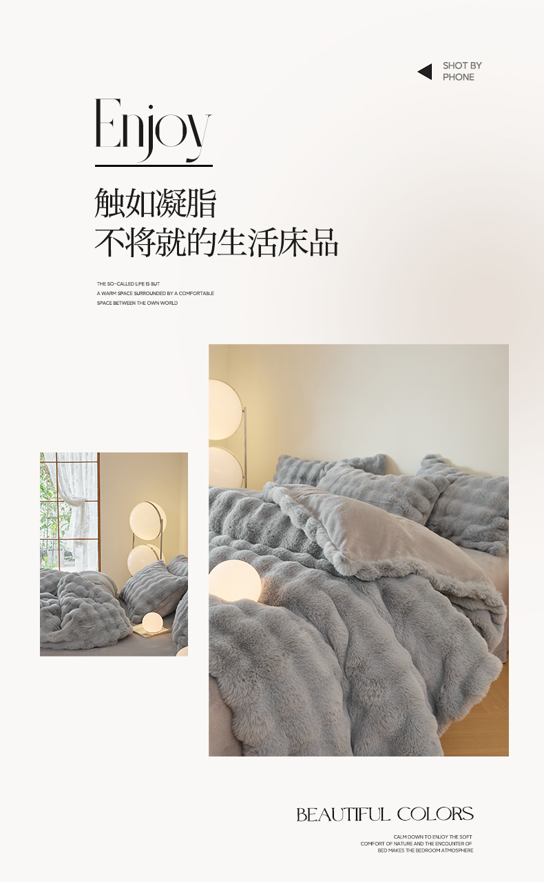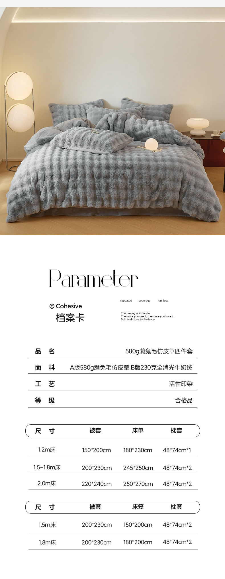 当前位置: 91家纺网 > 商品网购 > 床品套件 > 四件套 > 牛奶绒四件套 > 铠畅家纺 2024新款直播爆款高端A类獭兔毛立体剪花牛奶绒四件套 纯色大泡泡烟灰