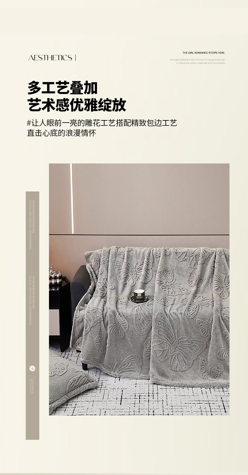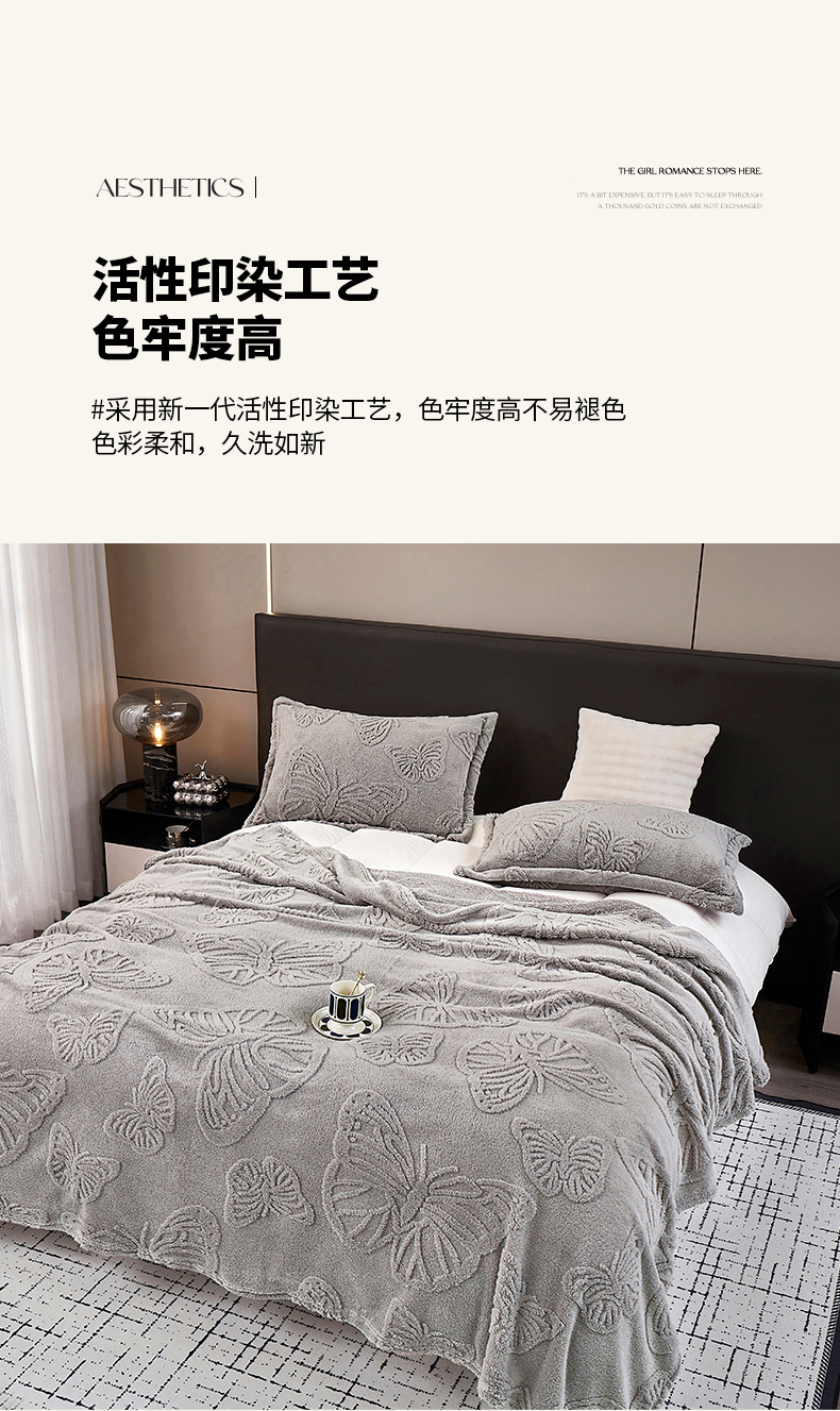 商品名称:肖恩毯业 2025新款加厚高克重塔芙绒提花毛毯-蝴蝶系列 蝴蝶-浅灰色
