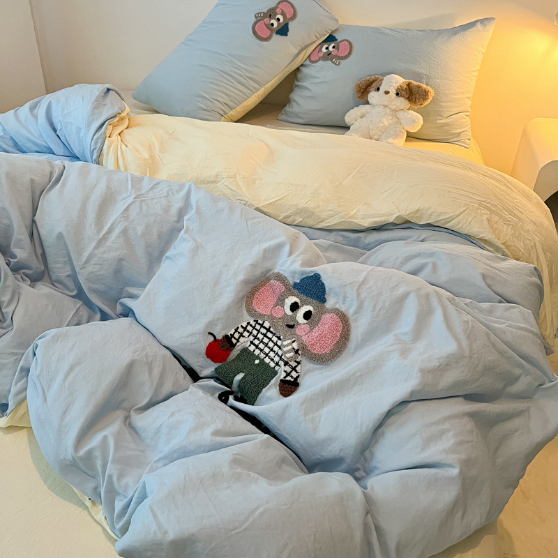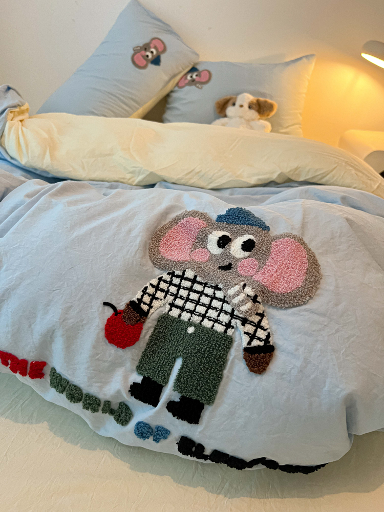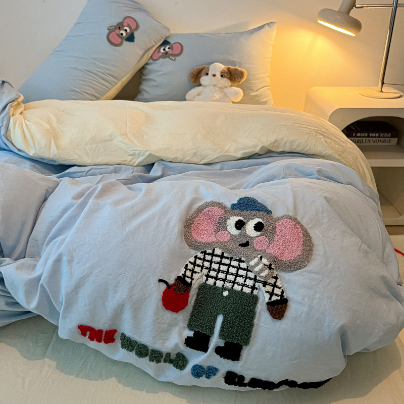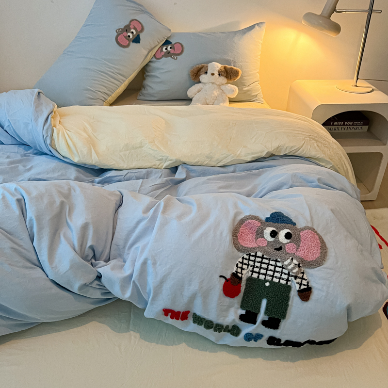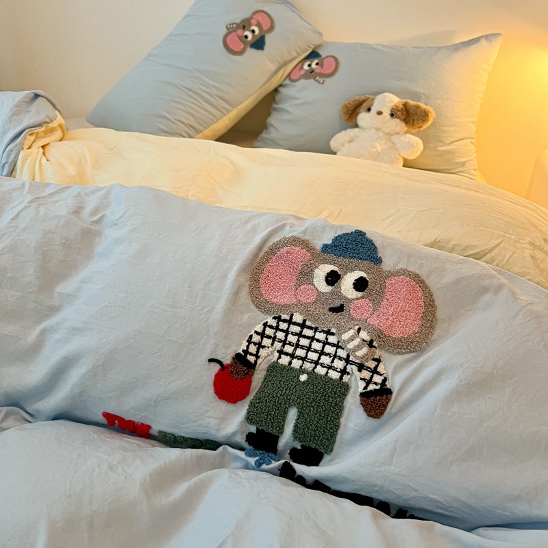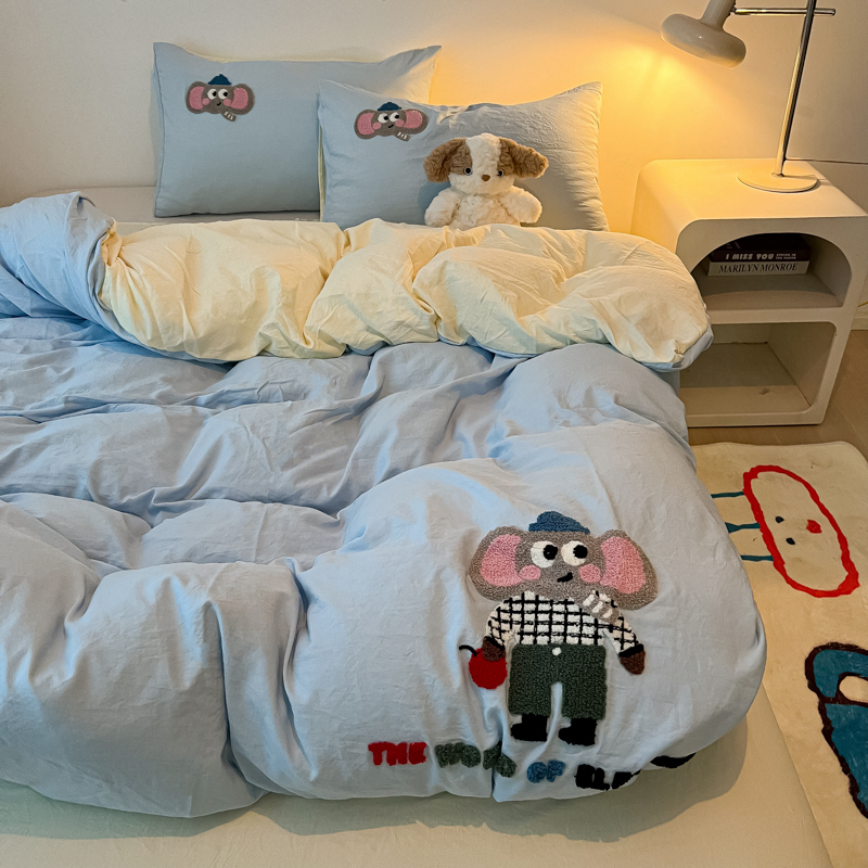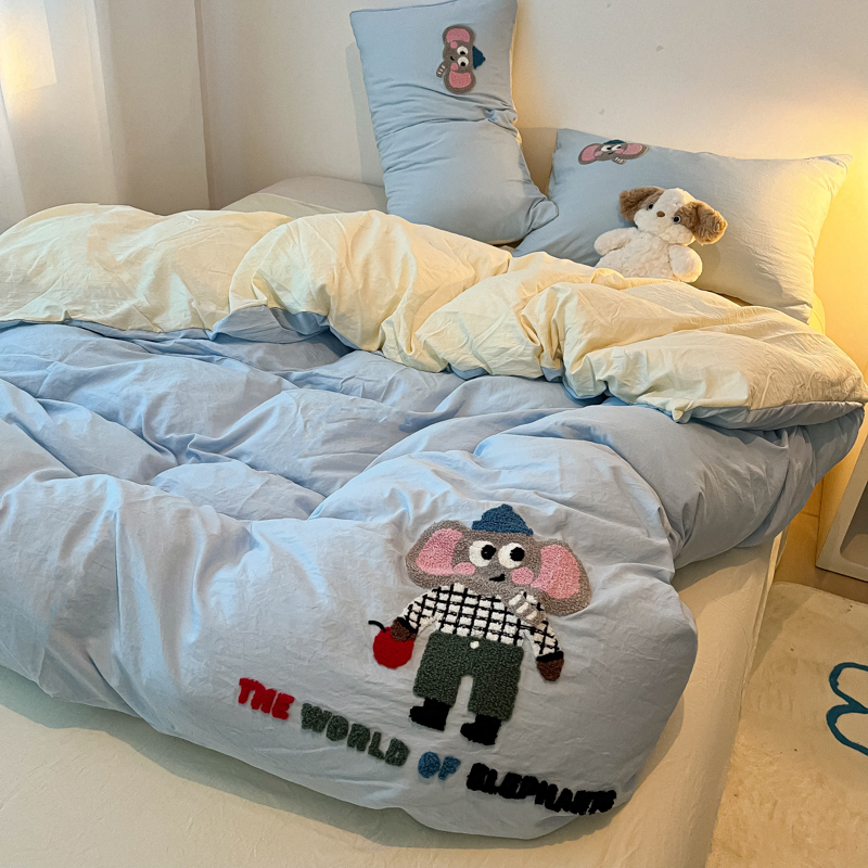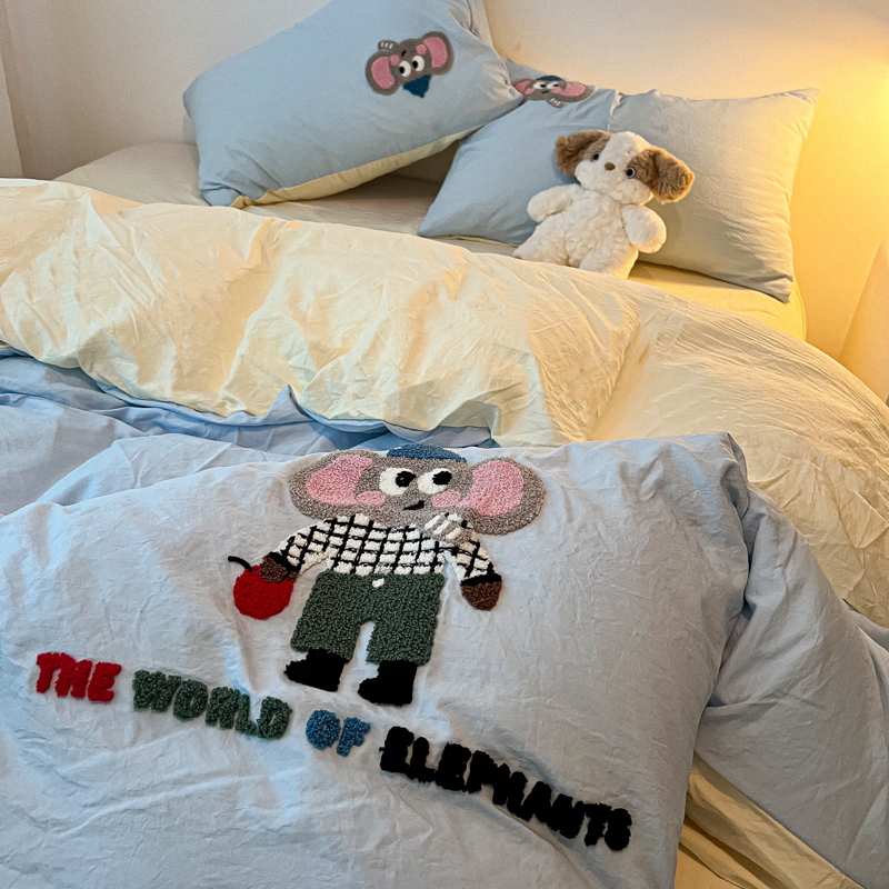 盼季家纺 2024年新款大版可爱毛巾绣超柔水洗棉床上用品四件套 大象先生-奶蓝黄