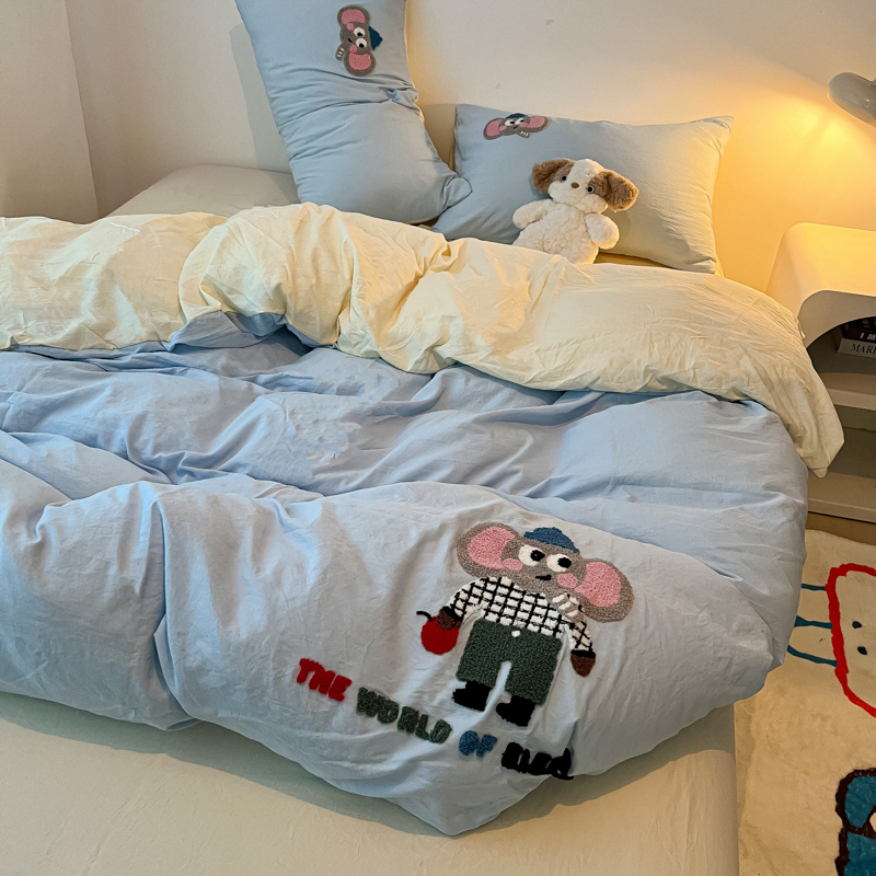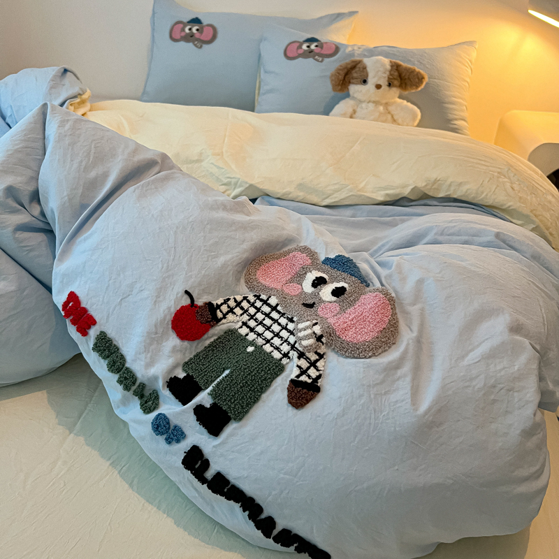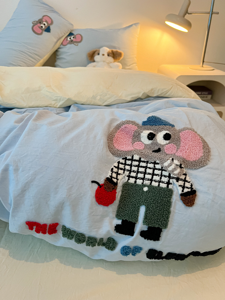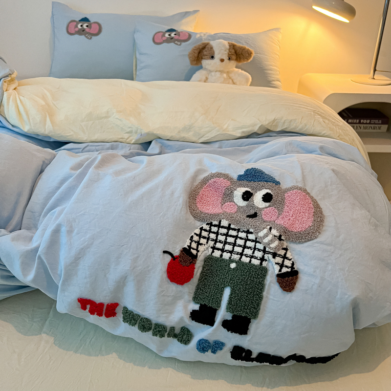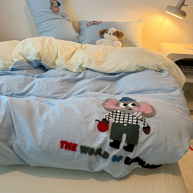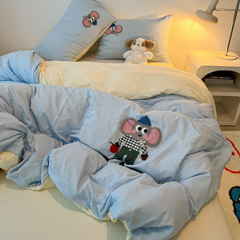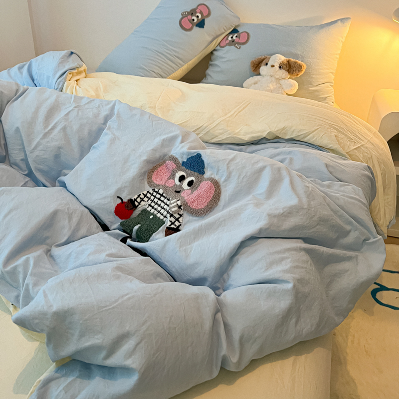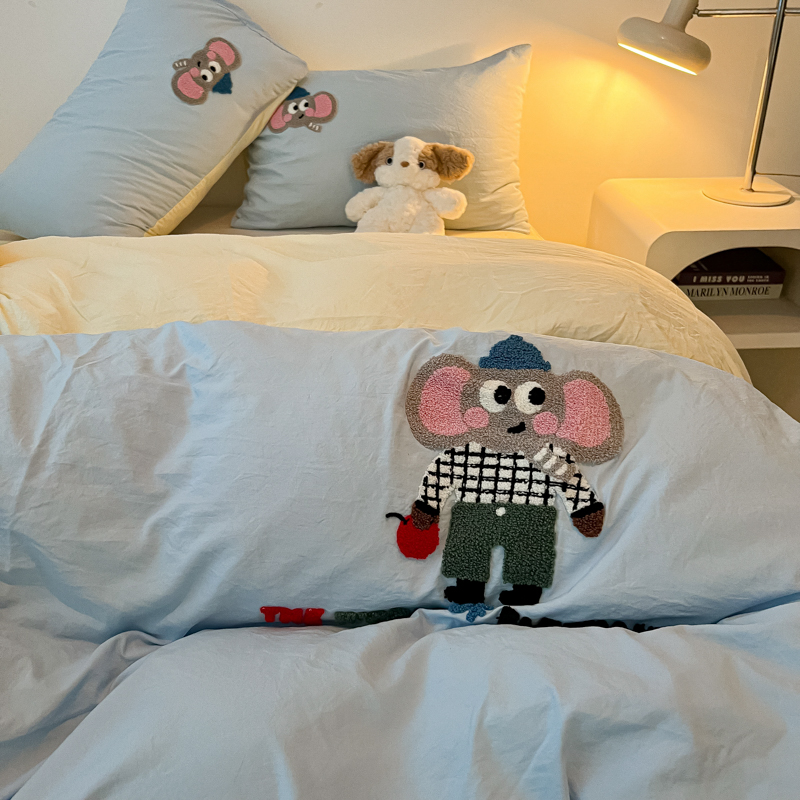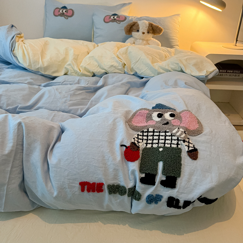 盼季家纺 2024年新款大版可爱毛巾绣超柔水洗棉床上用品四件套 大象先生-奶蓝黄