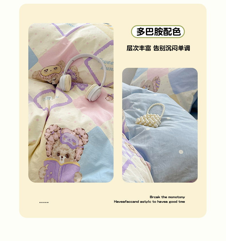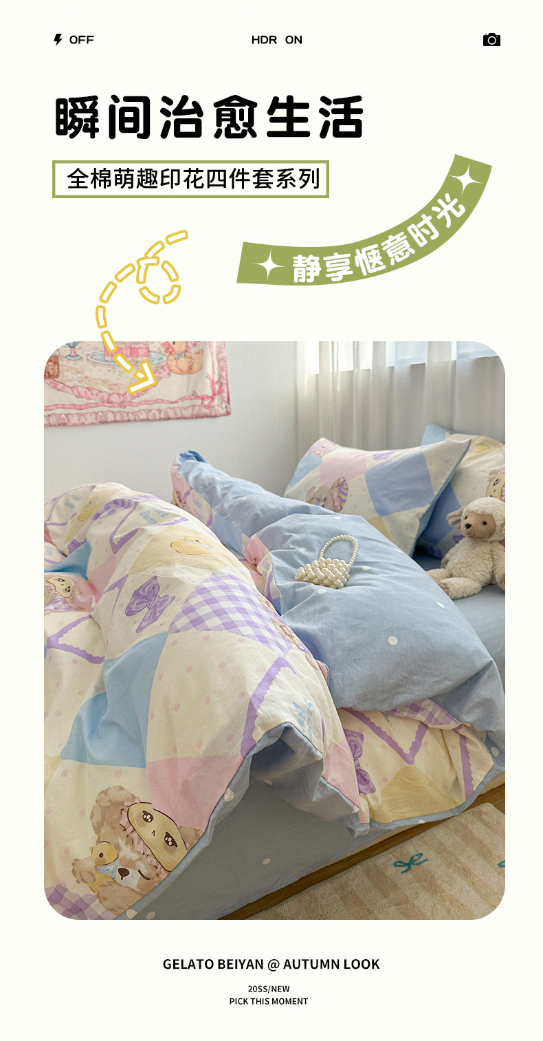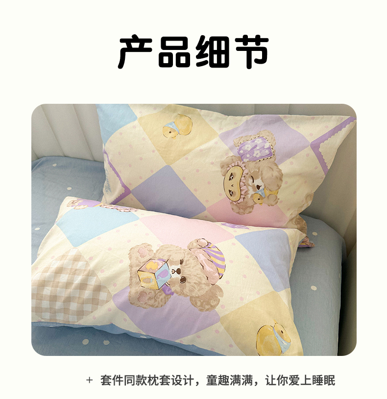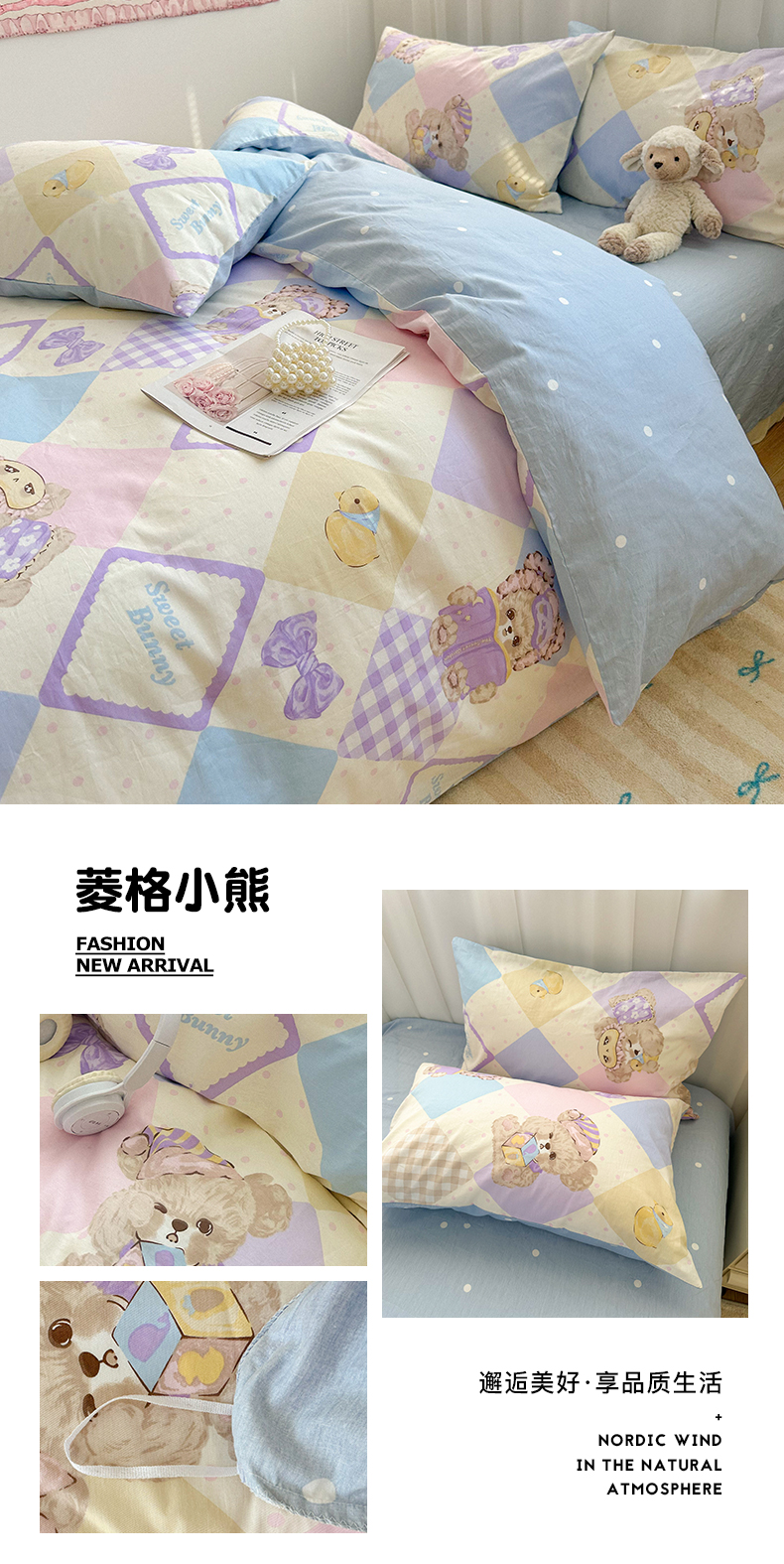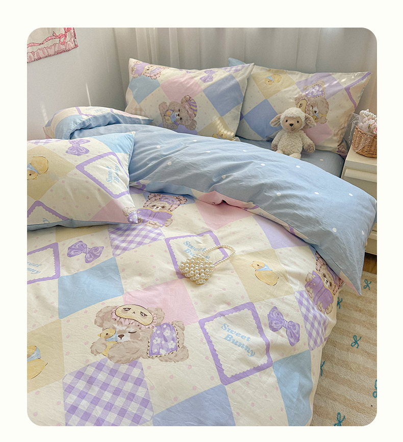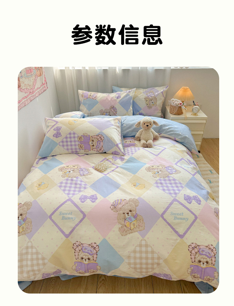 商品名称:瑞莱 2024新款洛丽塔风全棉印花四件套 菱格小熊