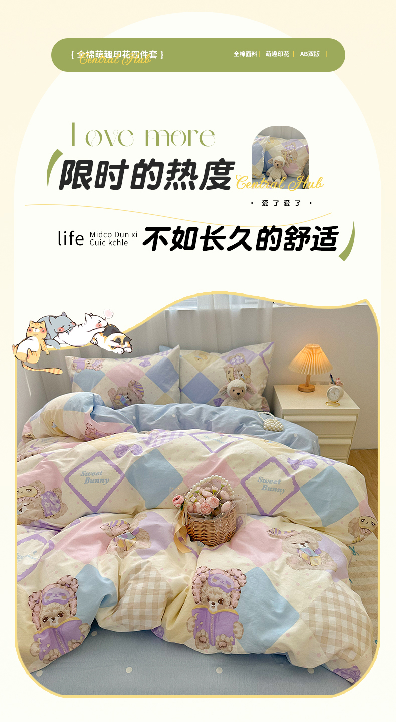(总)瑞莱 2026春季新款全棉纯棉印花小清新萌趣系列四件套,小懒猫,KT猫,可爱猫咪,蓝花兔,路灯影院,莓果小萌,帕丁顿兔兔,企鹅家族,趣味涂鸦,甜梦日记,甜梦小精灵,甜心KT,小镇漫游记