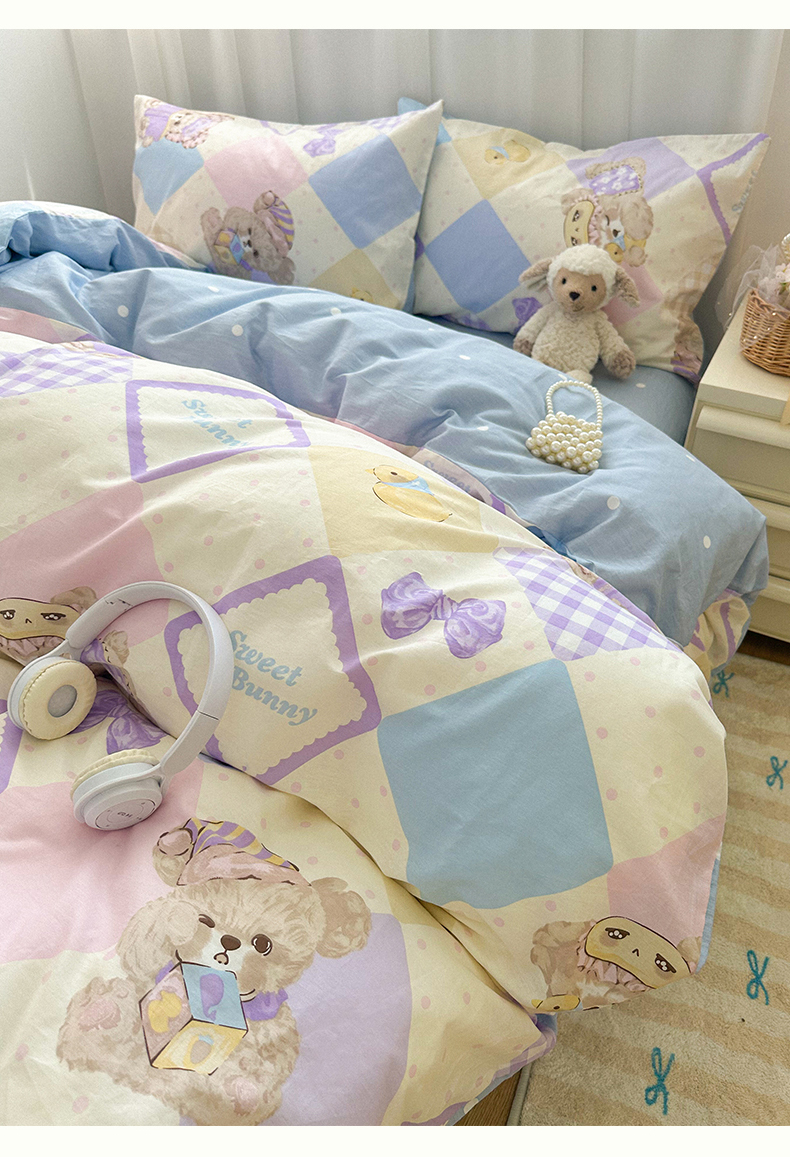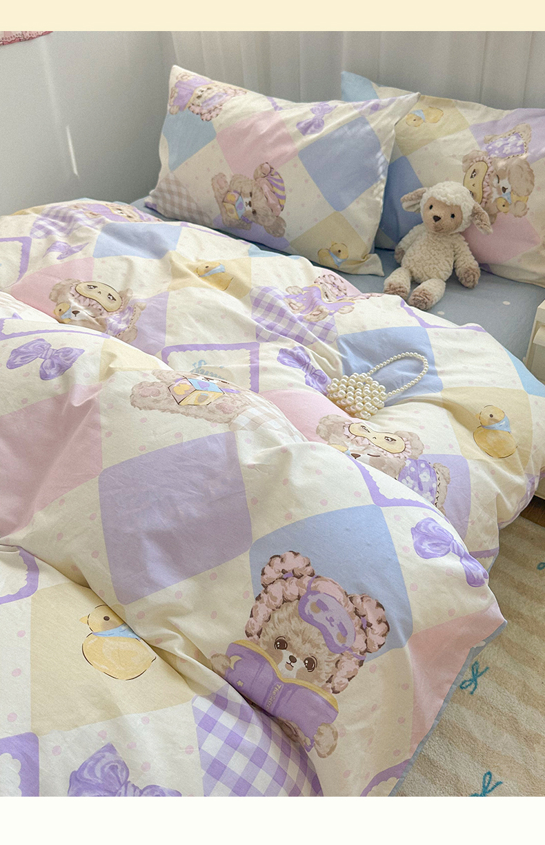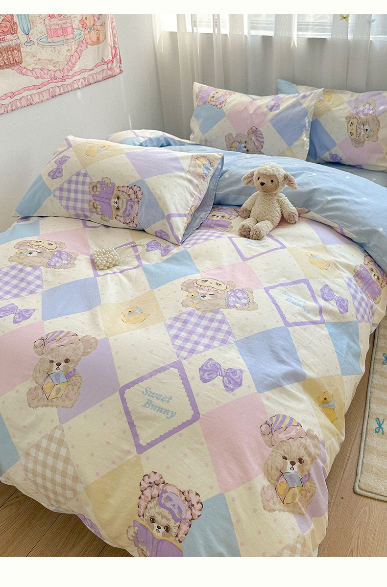 瑞莱 2024新款洛丽塔风全棉印花四件套 菱格小熊