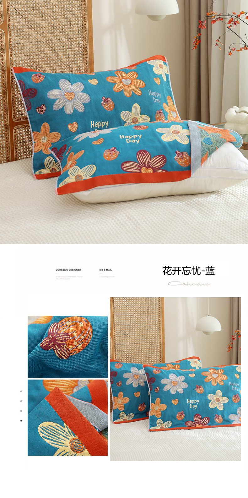 • 91家纺网 家纺一手货源 找家纺 朴尔家纺-毛巾被 2024新款色织定位提花纯棉四层纱布枕巾 花开忘忧-蓝