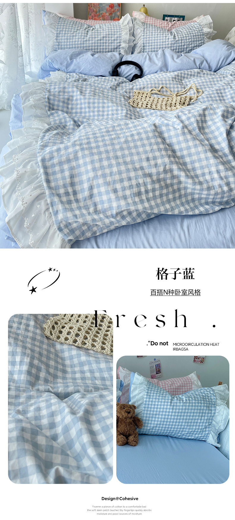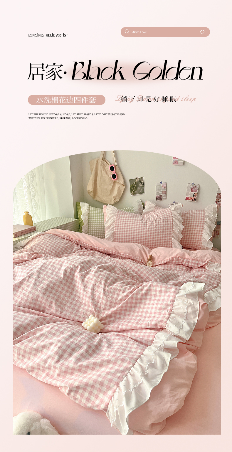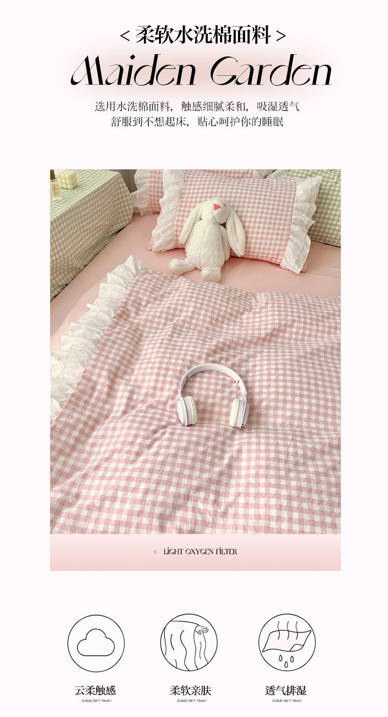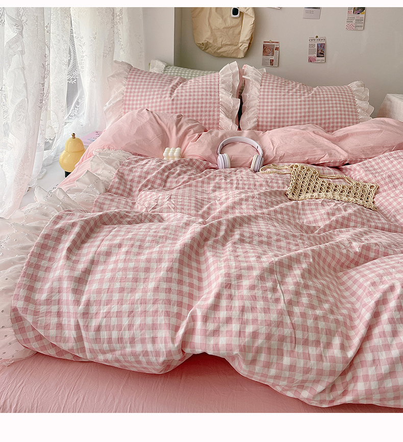 (总)山茶 2024新款格子水洗棉花边款四件套