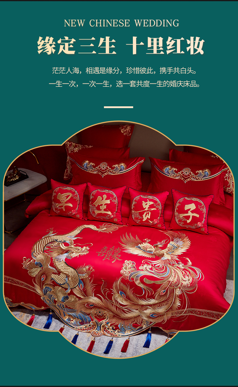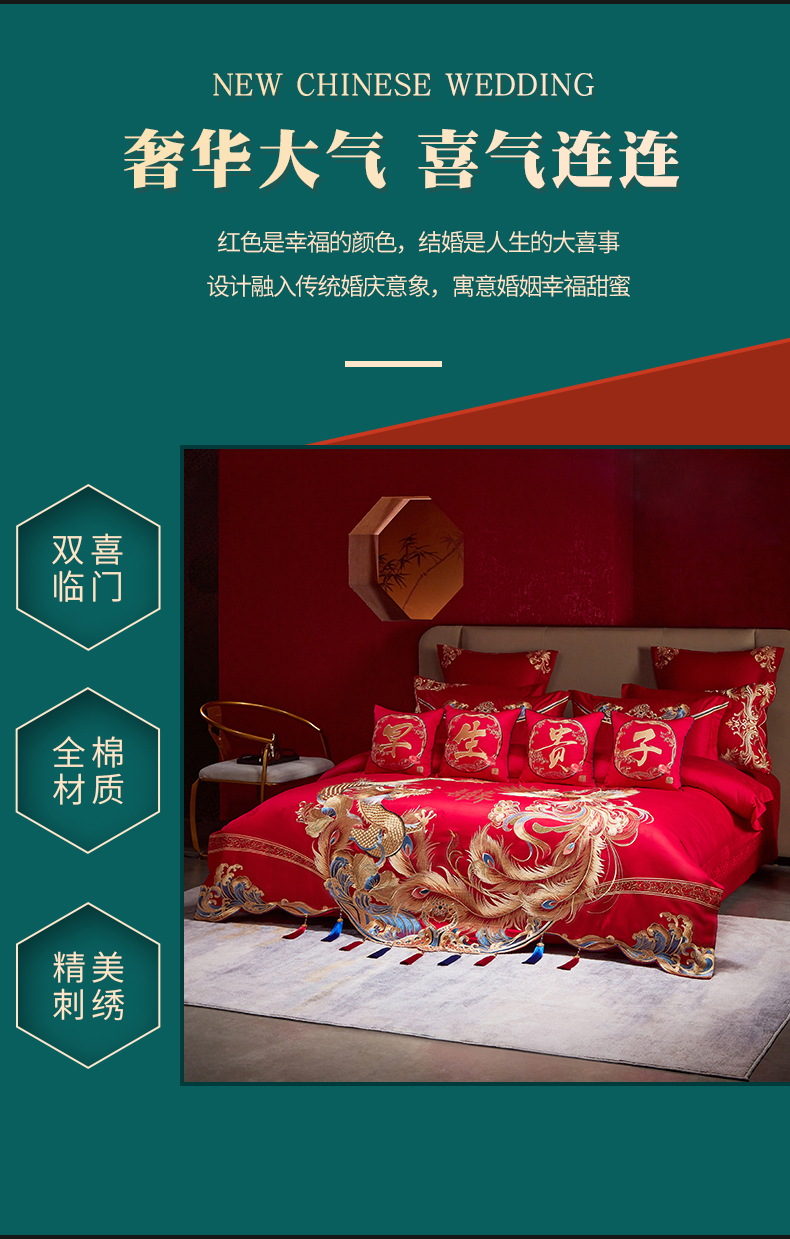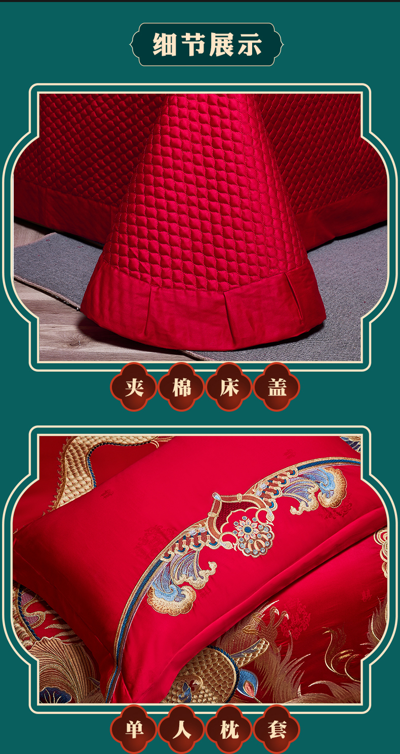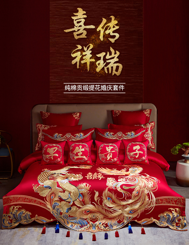当前位置: 91家纺网 > 商品网购 > 床品套件 > 四件套 > 婚庆四件套 > 宏羽纺家纺 2024新款高支高密纯棉提花婚庆套件系列(控价680)喜传祥瑞