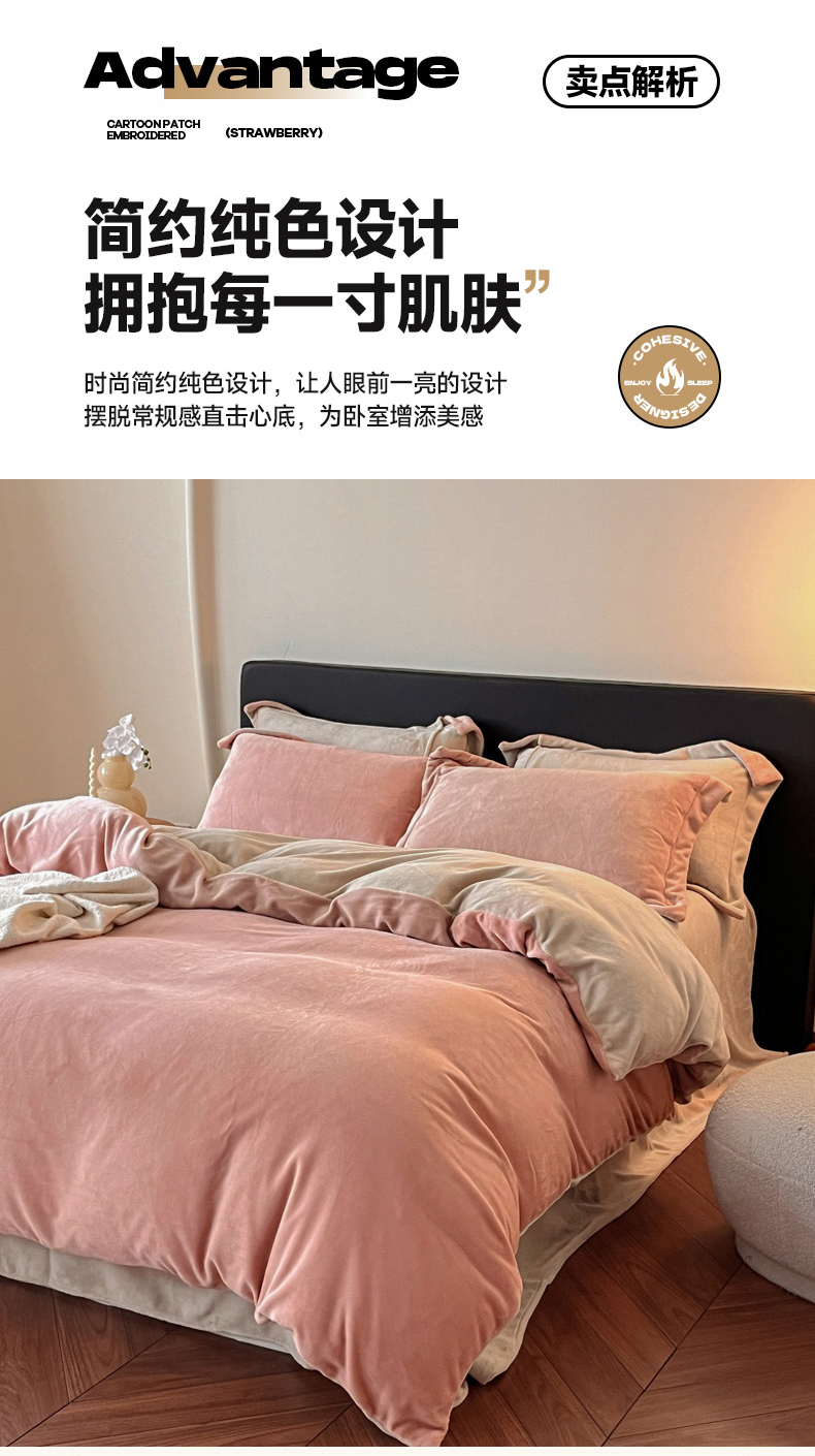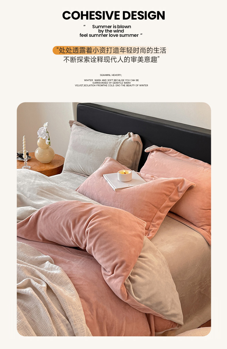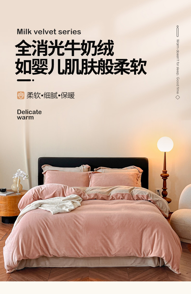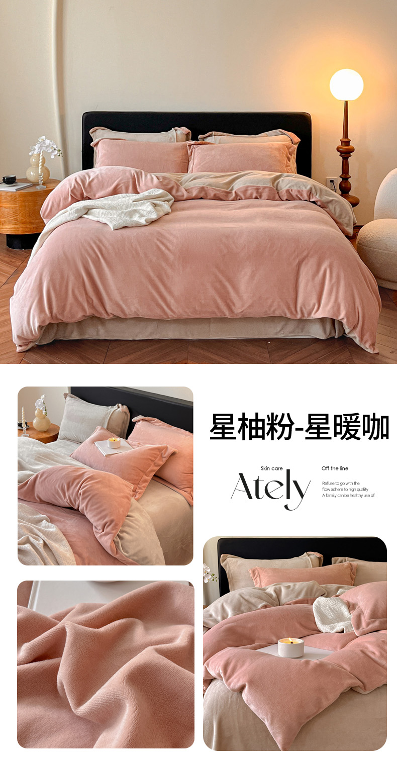 当前位置: 91家纺网 > 商品网购 > 床品套件 > 四件套 > 牛奶绒四件套 > 万盛家纺 2025新款全消光加厚230克牛奶绒拼色四件套 星柚粉-星暖咖