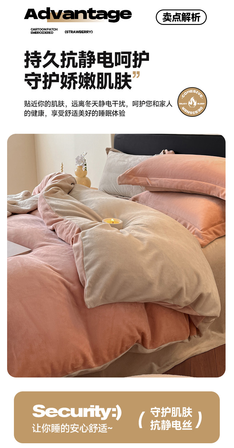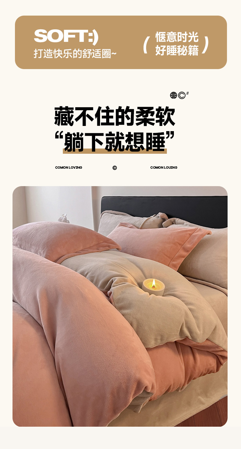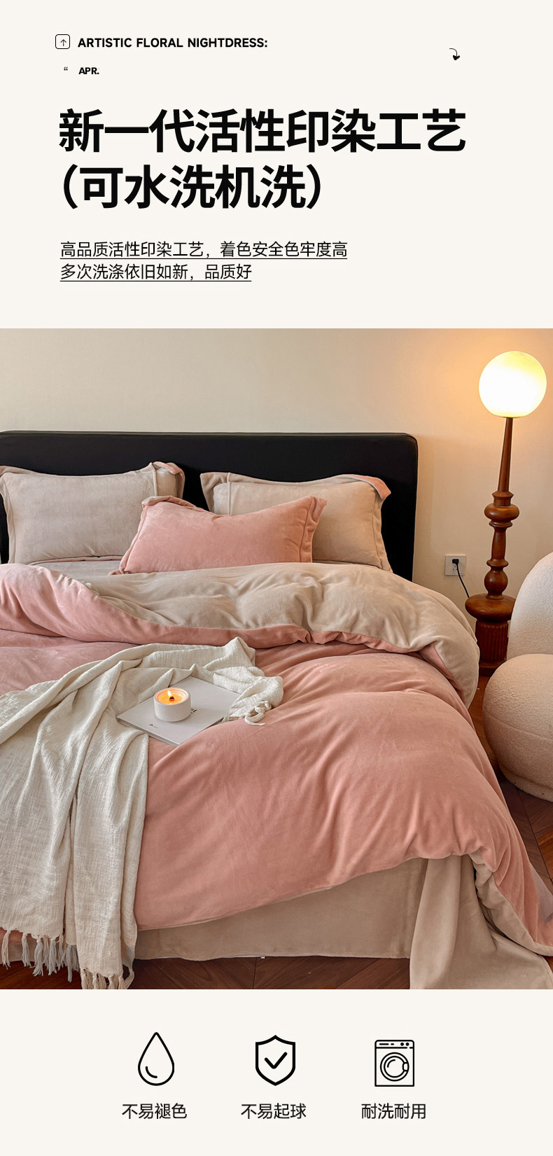 当前位置: 91家纺网 > 商品网购 > 床品套件 > 四件套 > 牛奶绒四件套 > 万盛家纺 2025新款全消光加厚230克牛奶绒拼色四件套 星柚粉-星暖咖