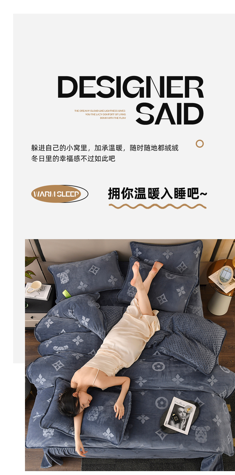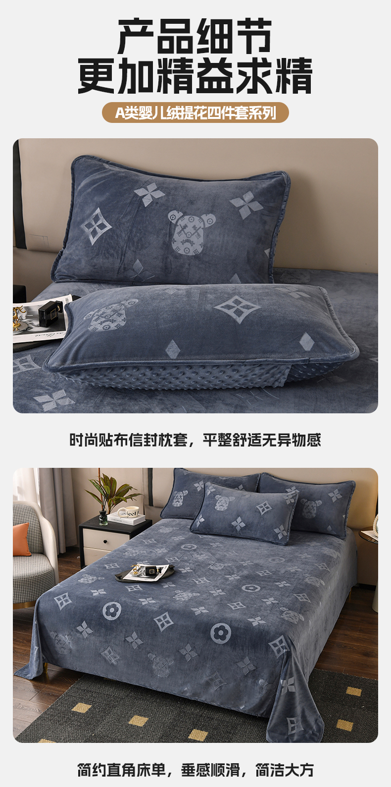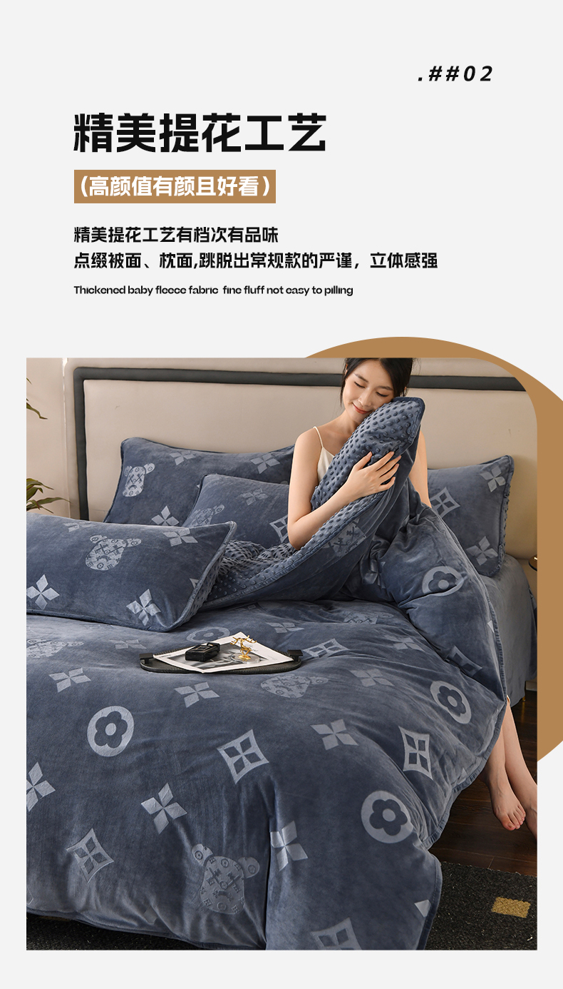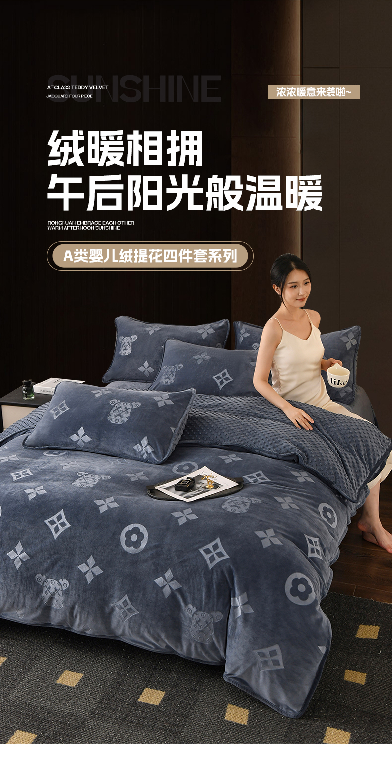 商品名称:满羽家纺 2024新款A类高克重婴儿绒提花牛奶绒四件套 轻奢时代-深蓝