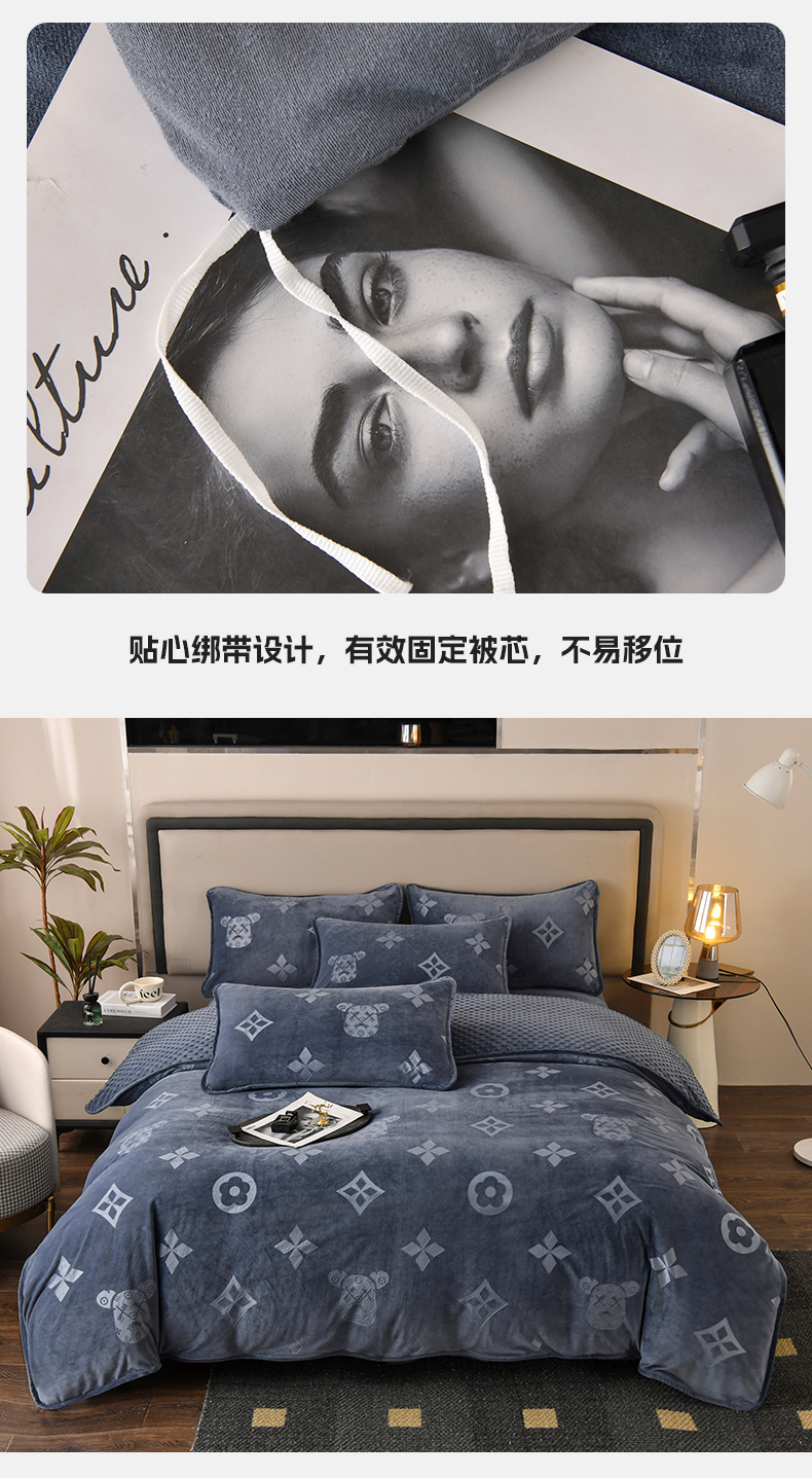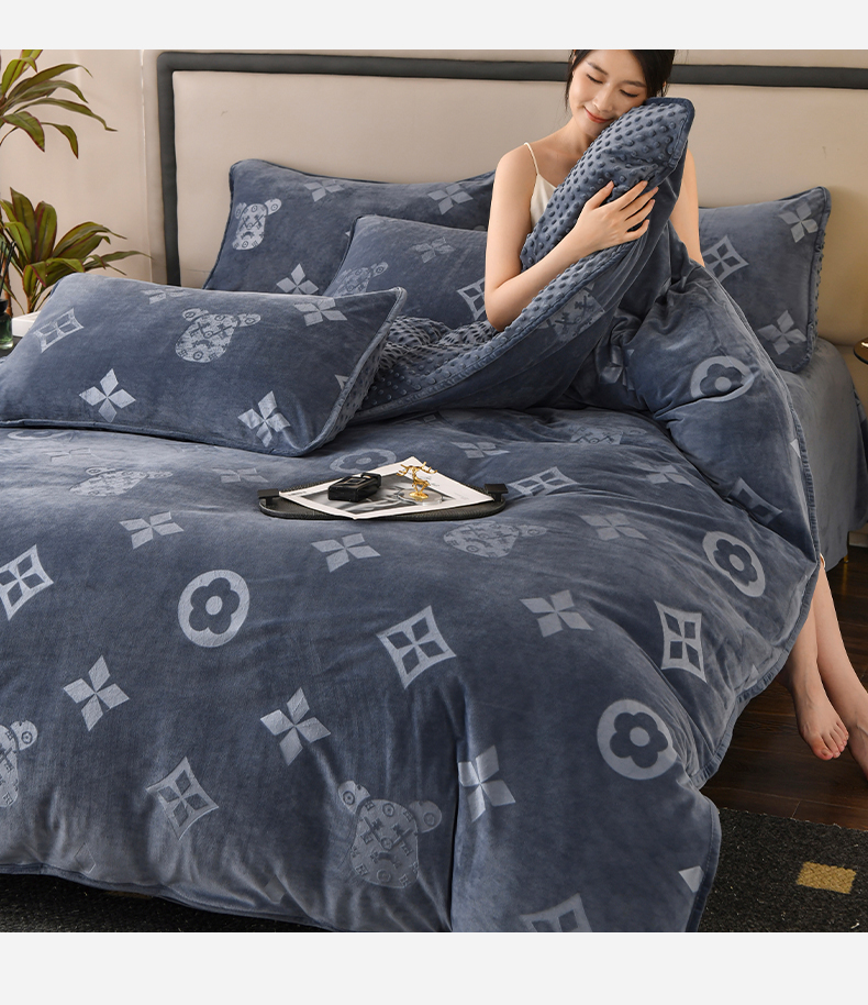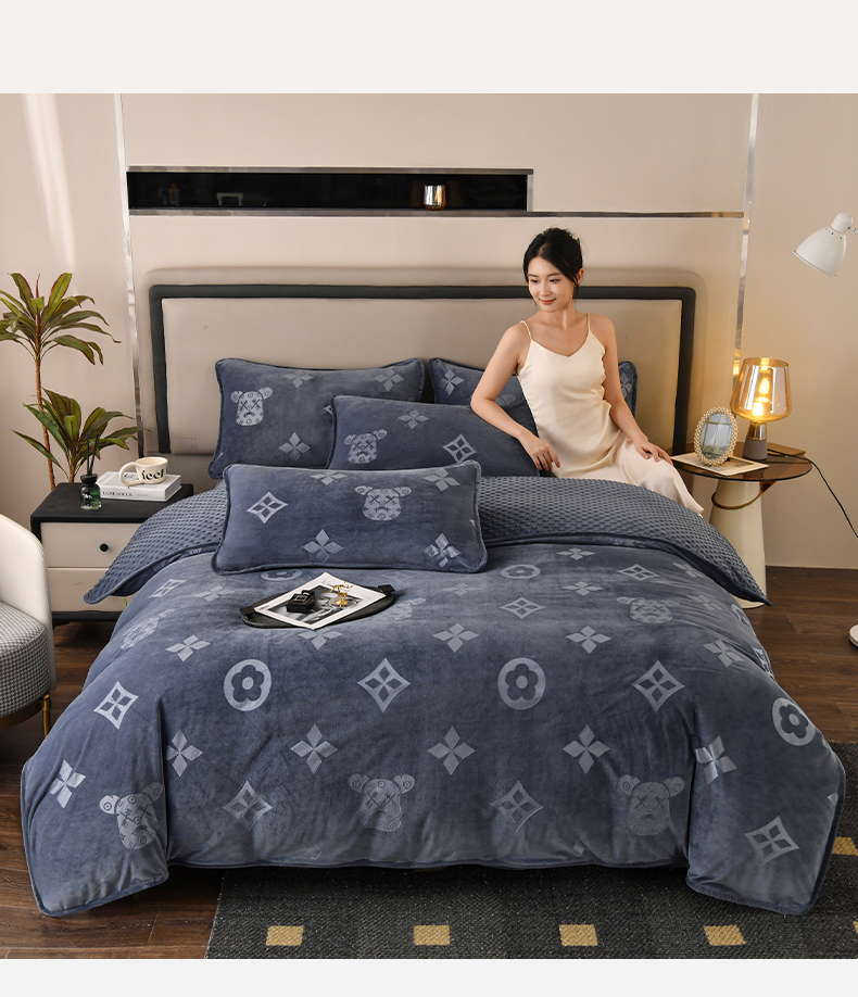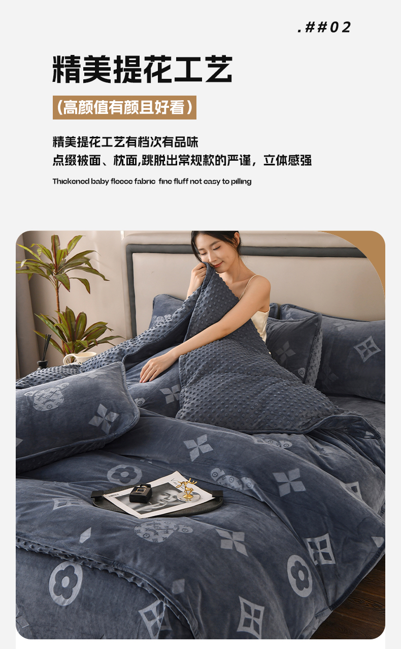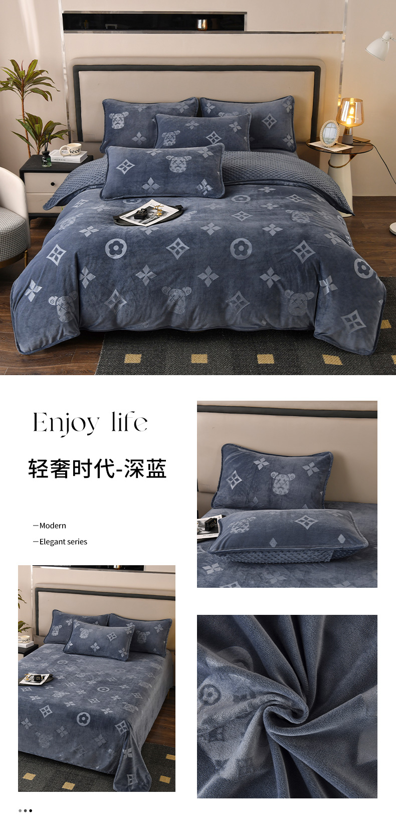 商品名称:满羽家纺 2024新款A类高克重婴儿绒提花牛奶绒四件套 轻奢时代-深蓝