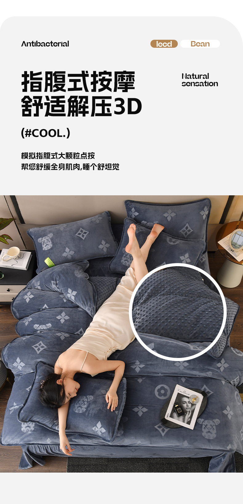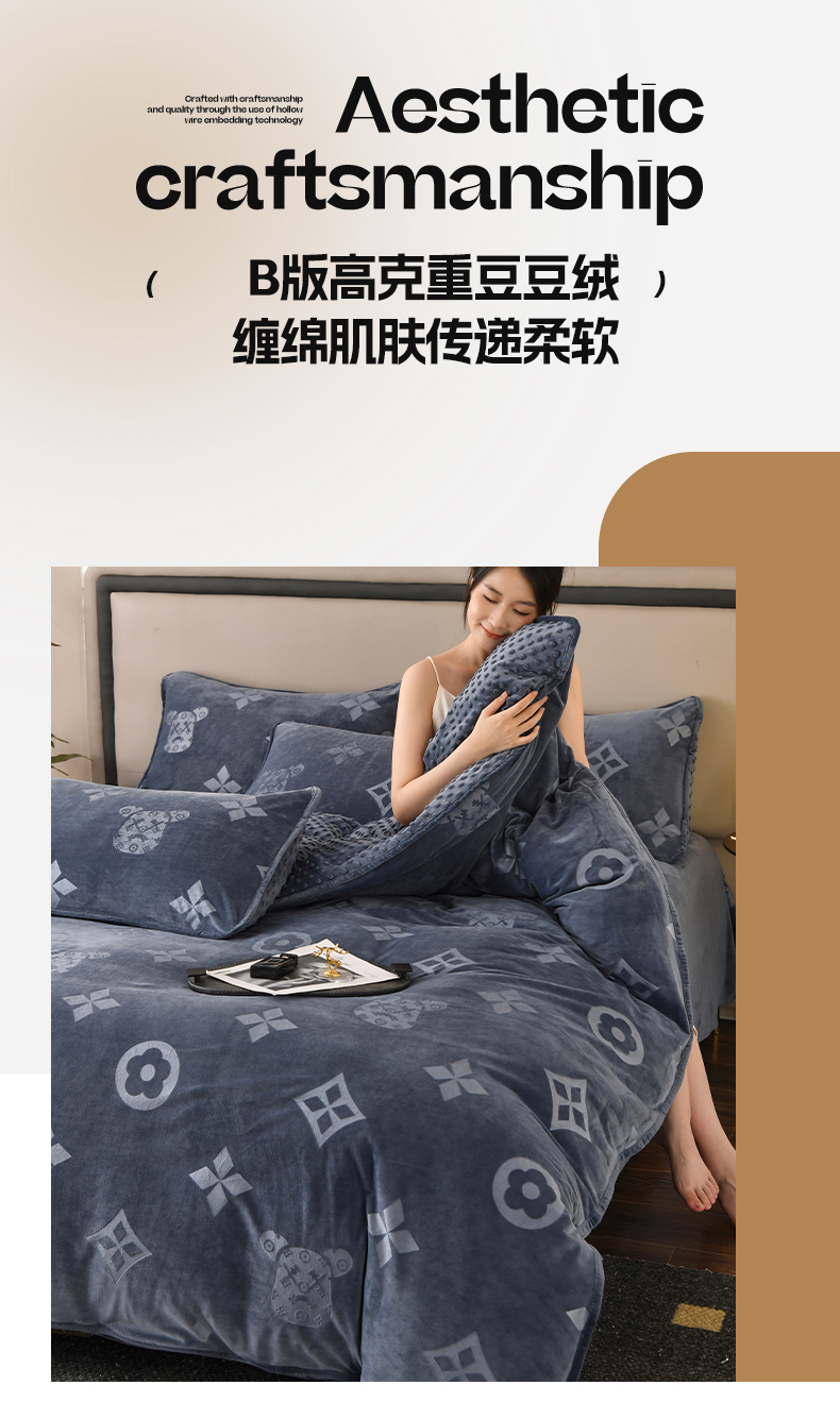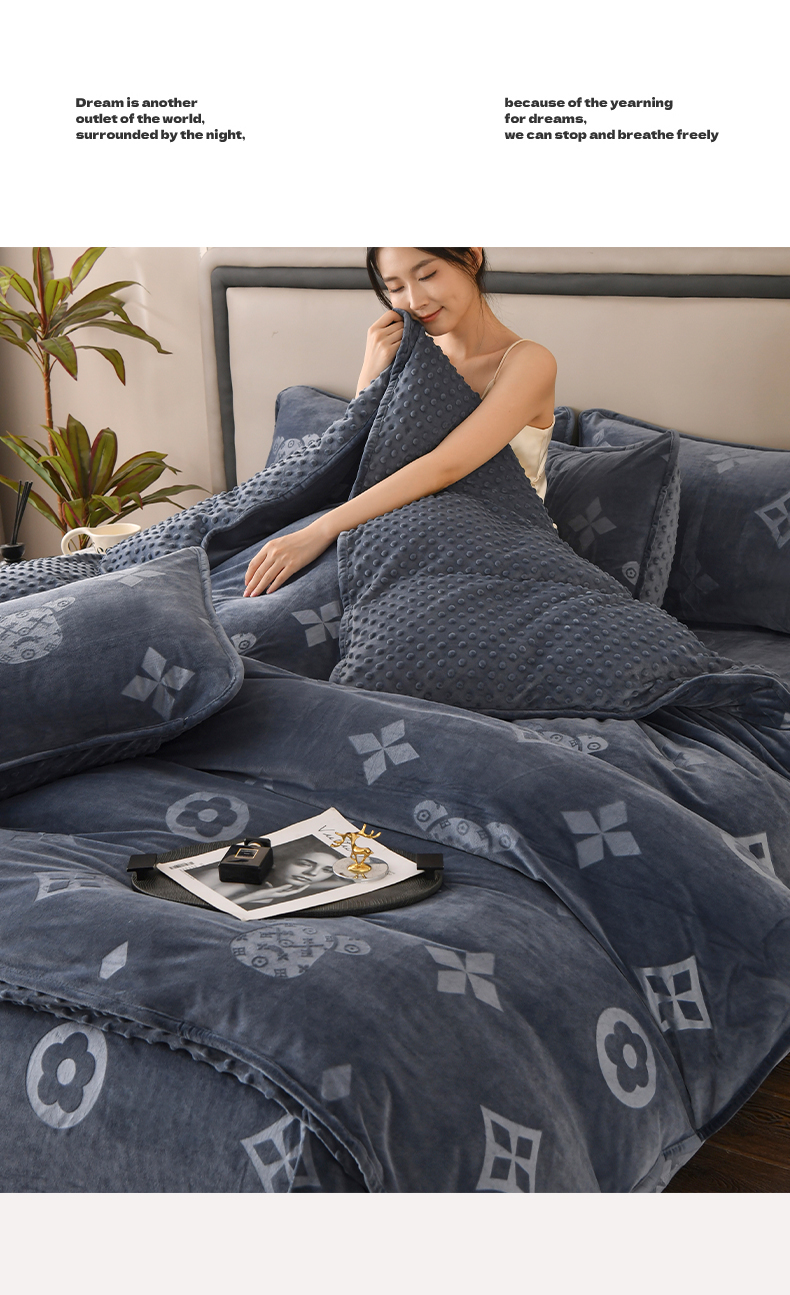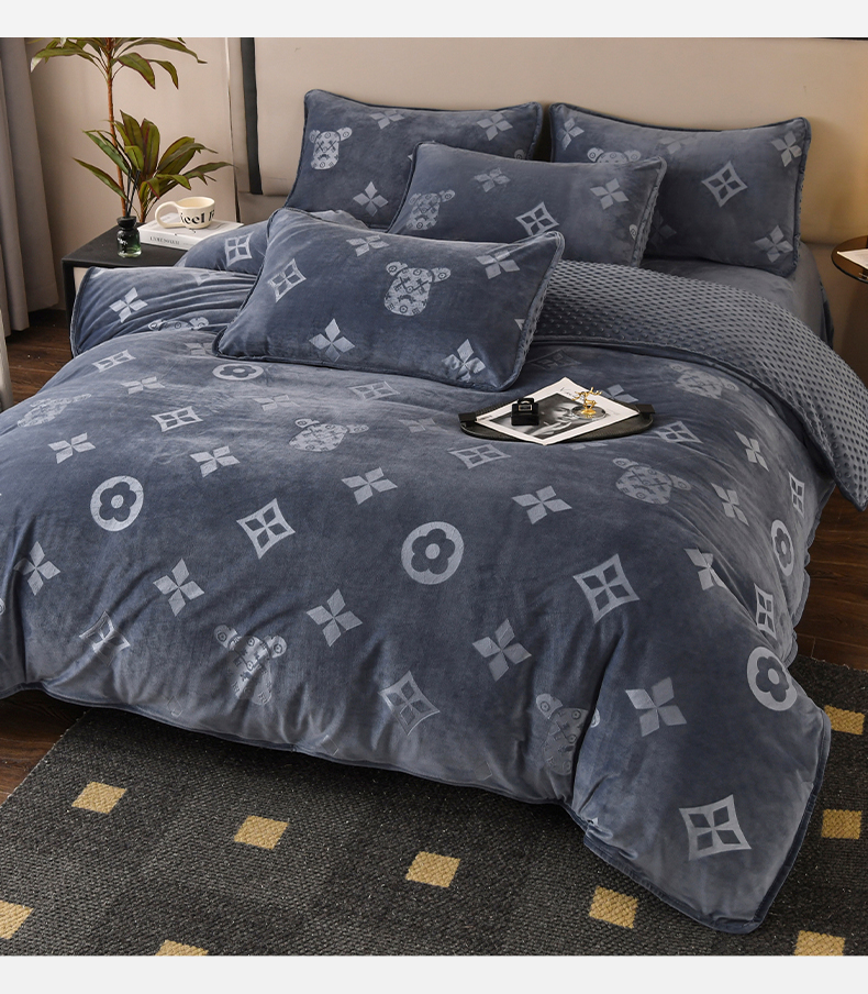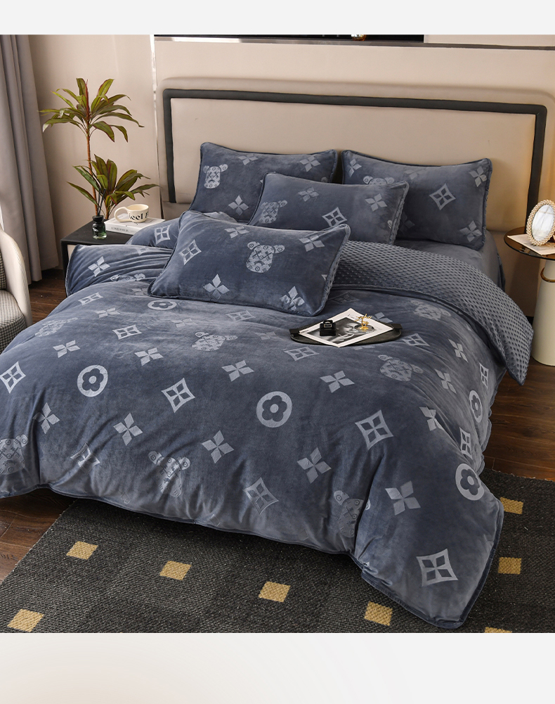 商品名称:满羽家纺 2024新款A类高克重婴儿绒提花牛奶绒四件套 轻奢时代-深蓝