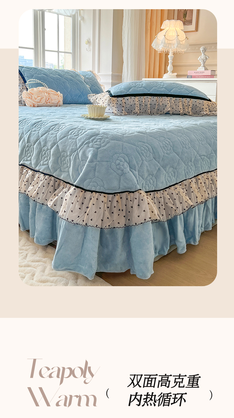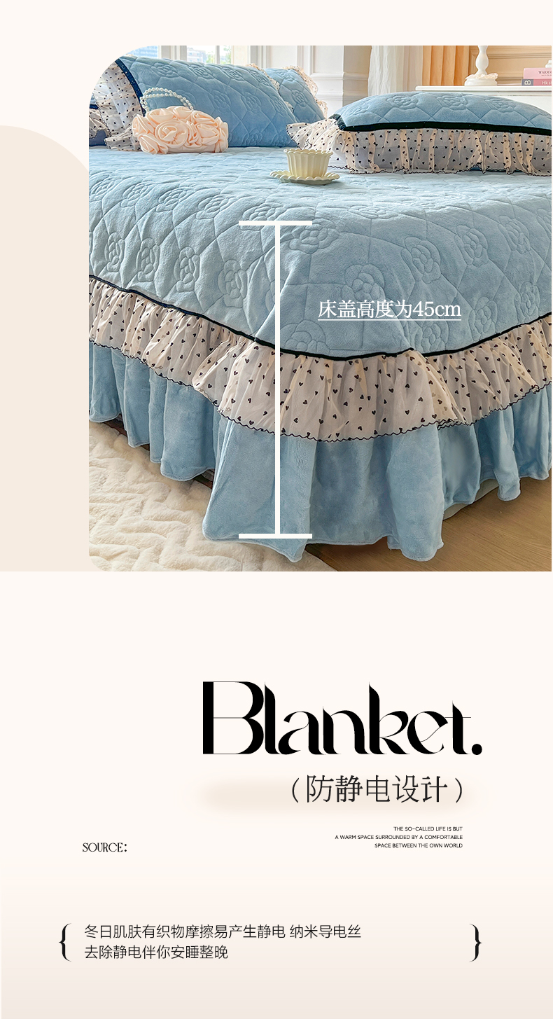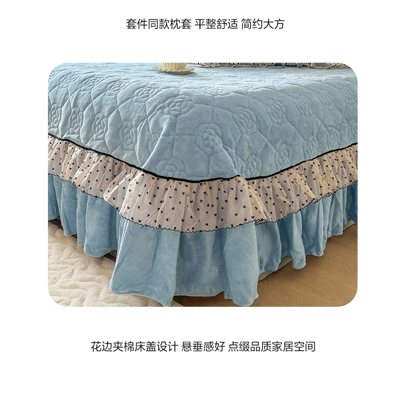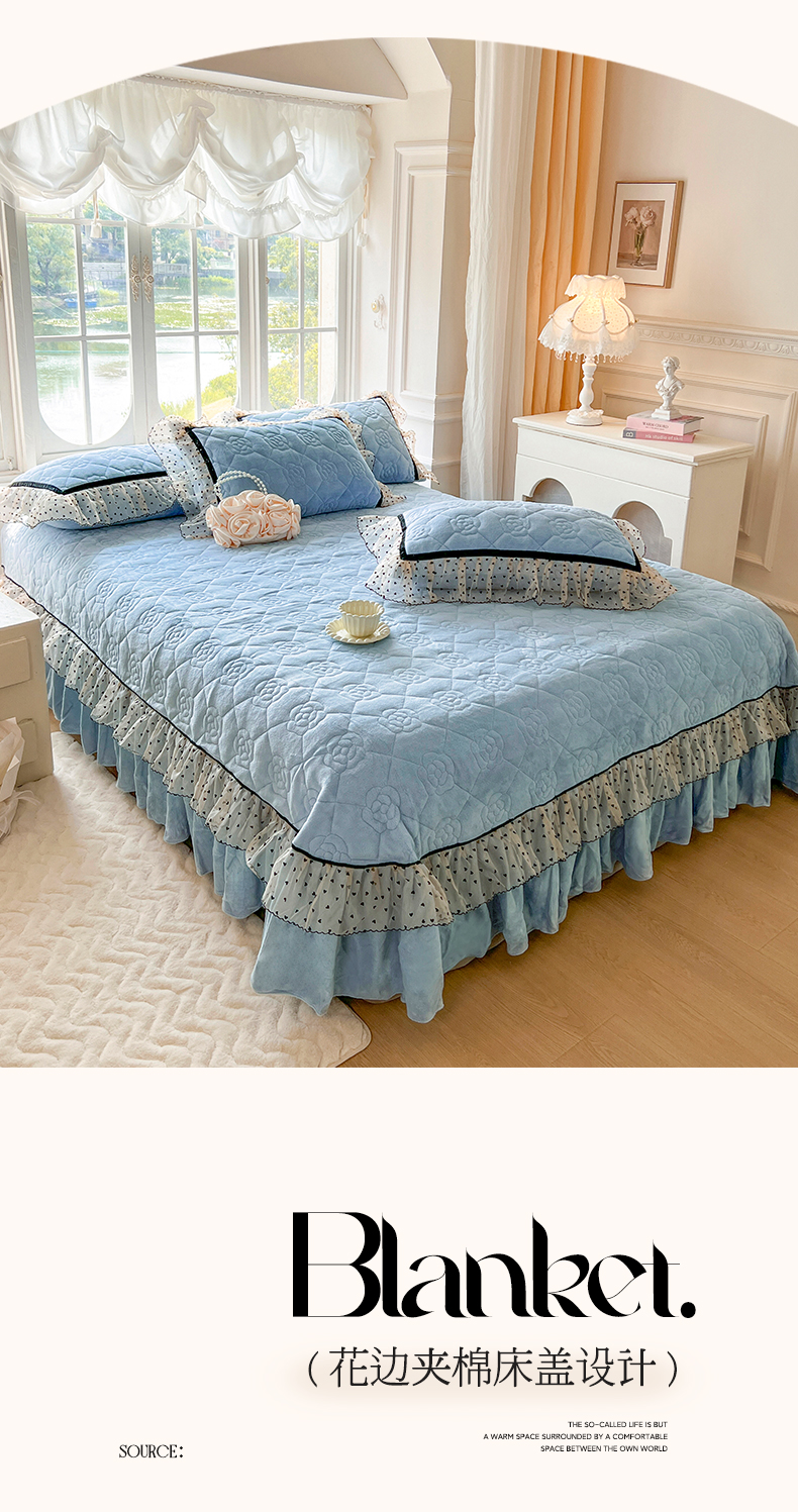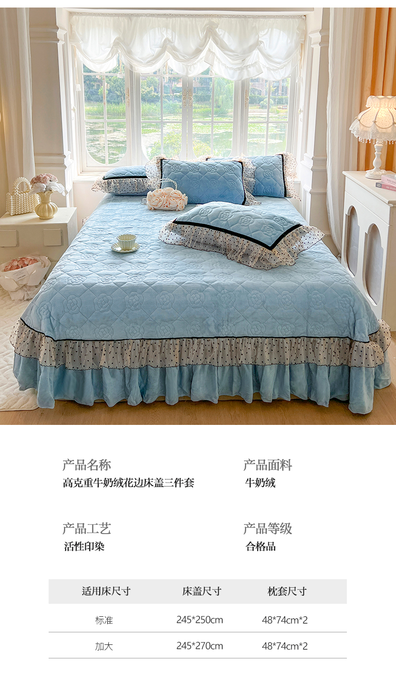 商品名称:网红馆(ck家纺) 2025新款牛奶绒花边床盖三件套-诺蔓 诺蔓-天蓝