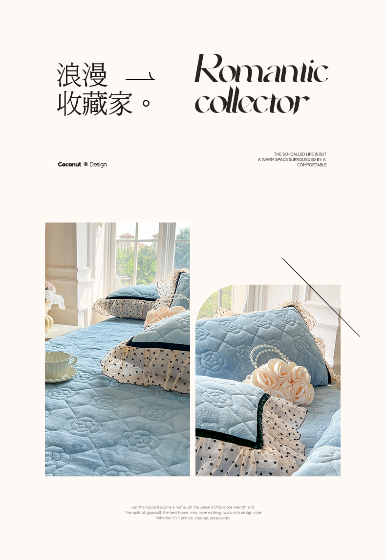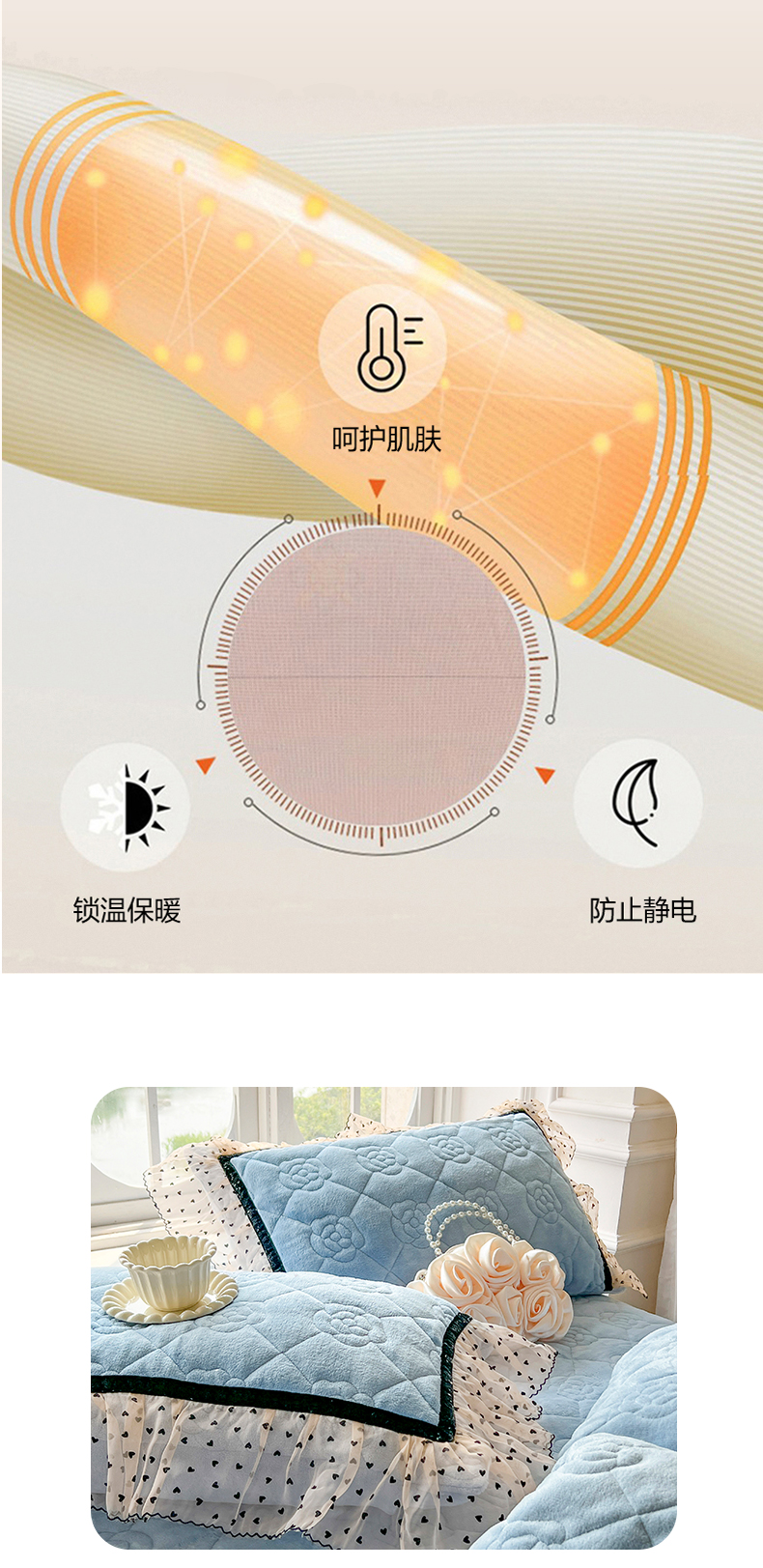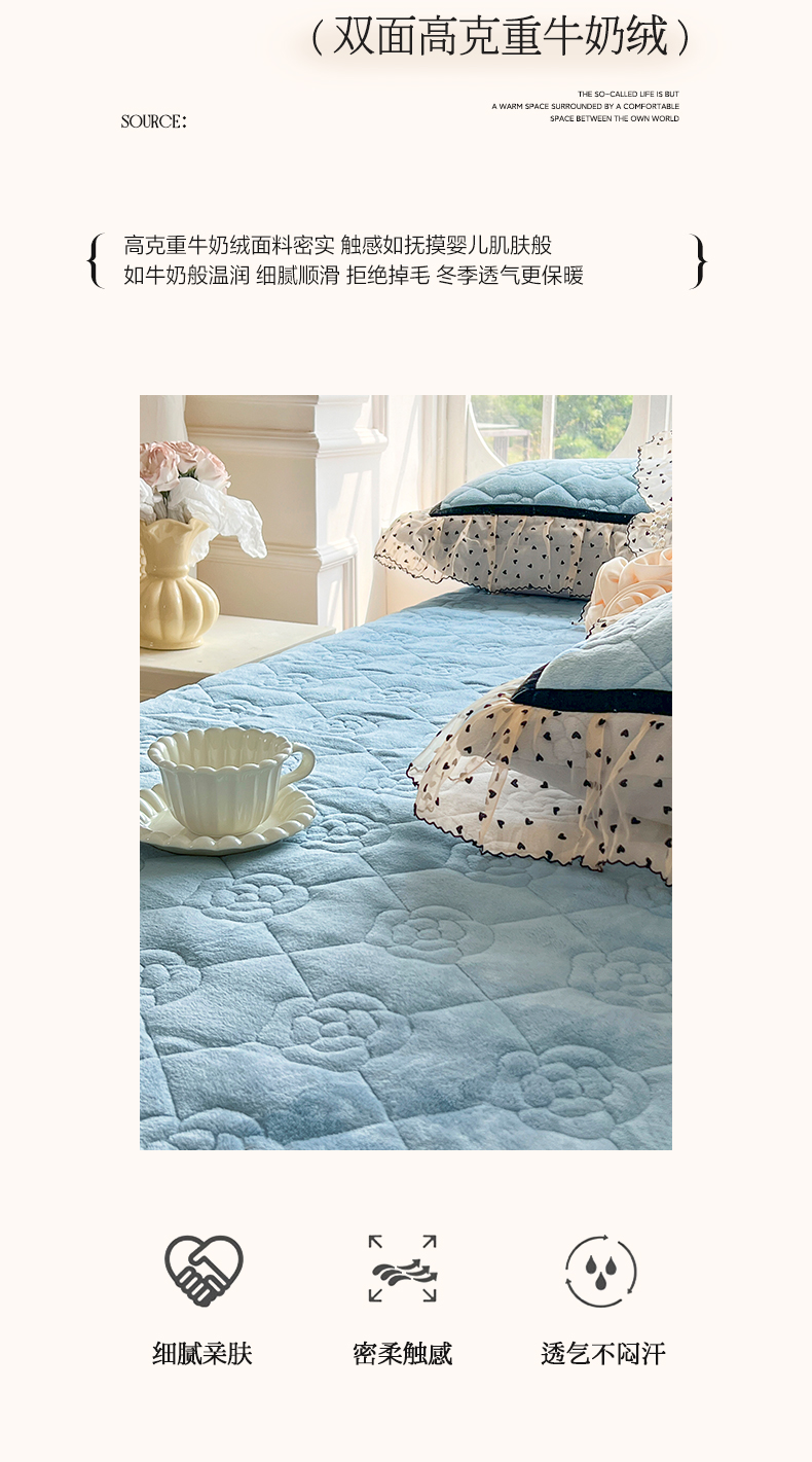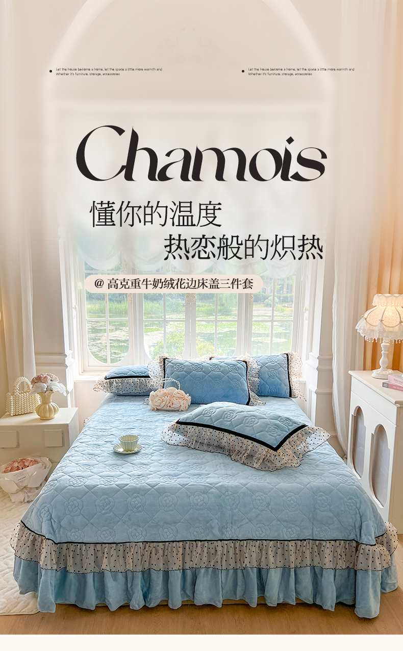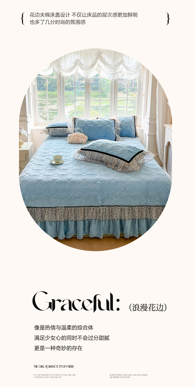 商品名称:网红馆(ck家纺) 2025新款牛奶绒花边床盖三件套-诺蔓 诺蔓-天蓝