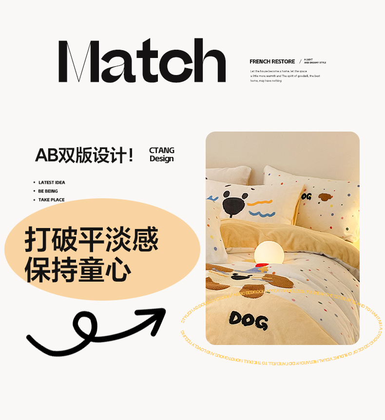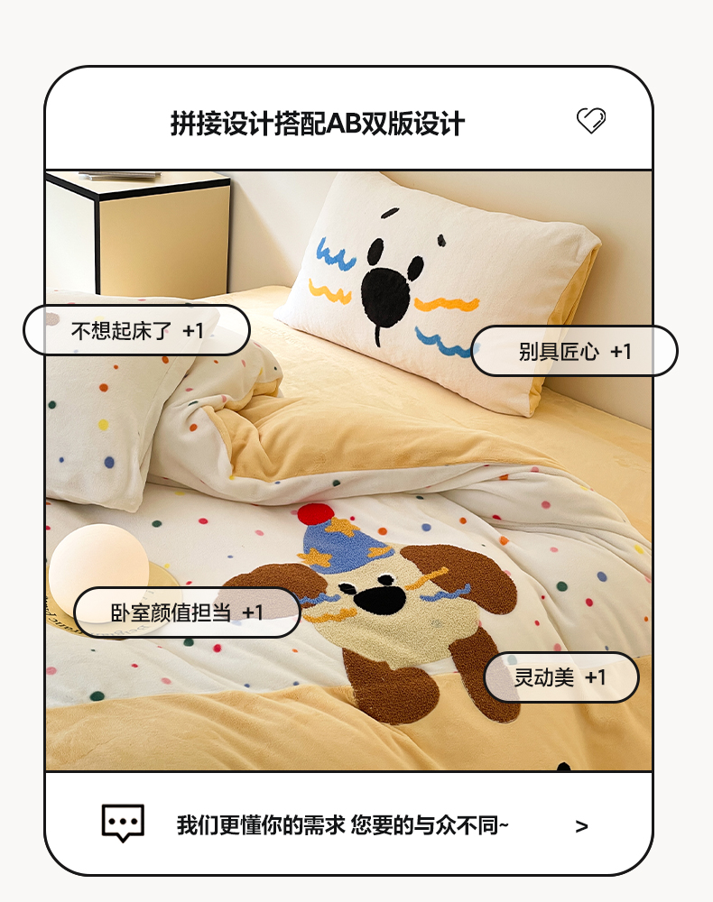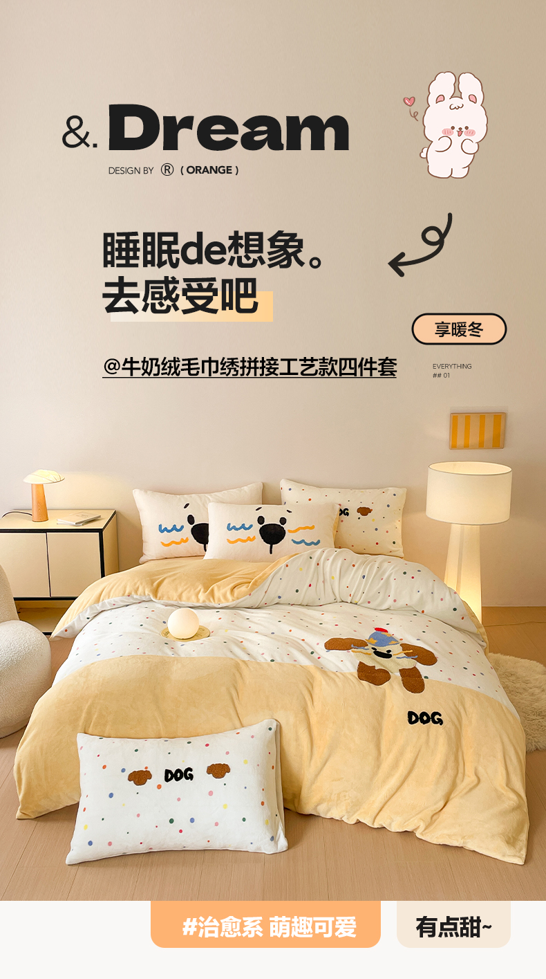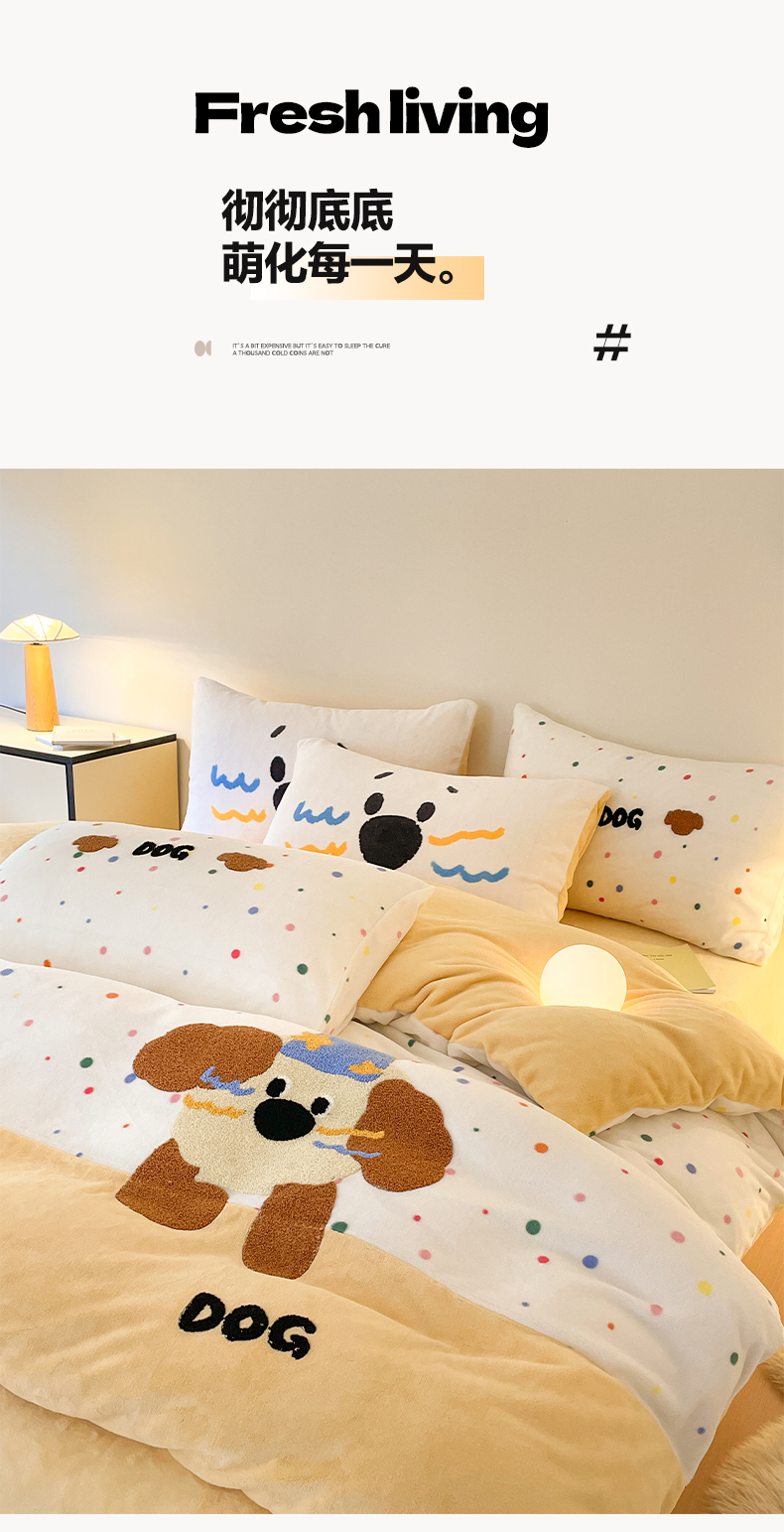 如一 2024新款牛奶绒拼接工艺款贴布绣+毛巾绣四件套 毛巾绣-调皮狗