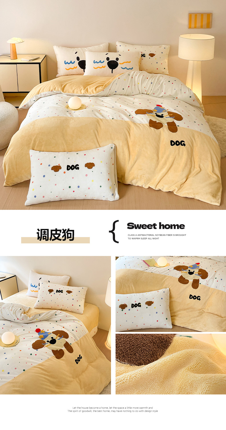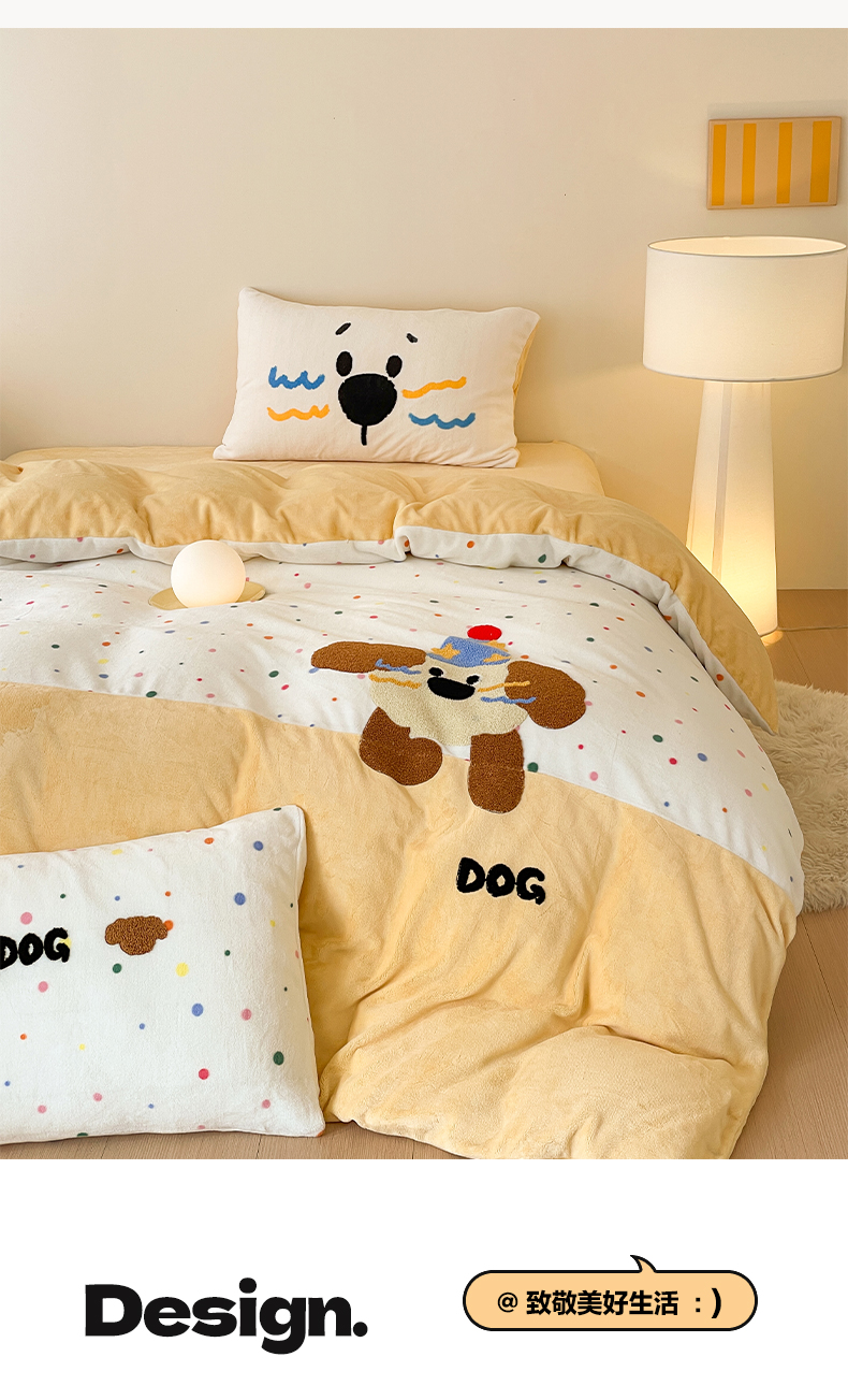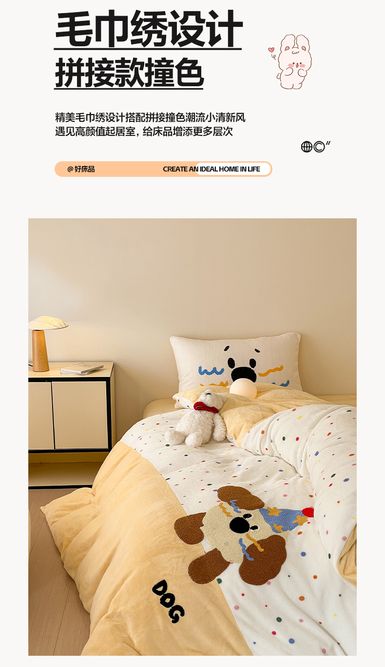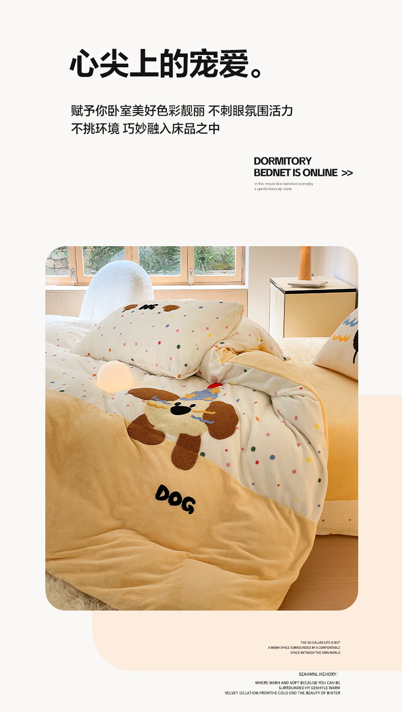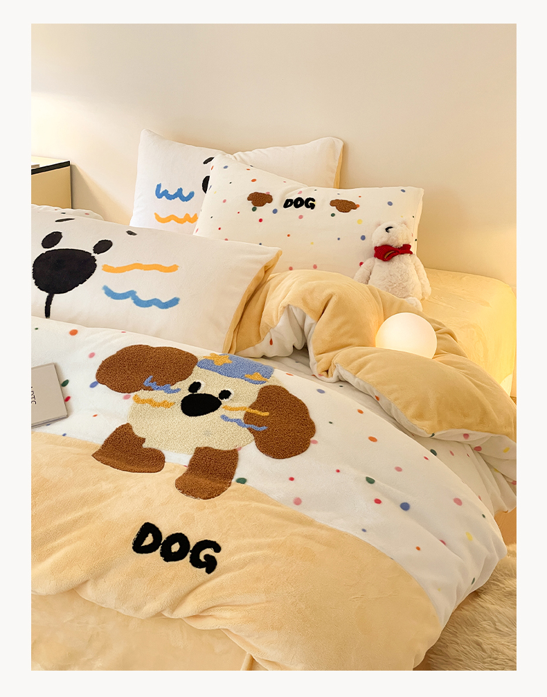 商品名称:如一 2024新款牛奶绒拼接工艺款贴布绣+毛巾绣四件套 毛巾绣-调皮狗