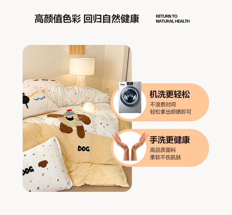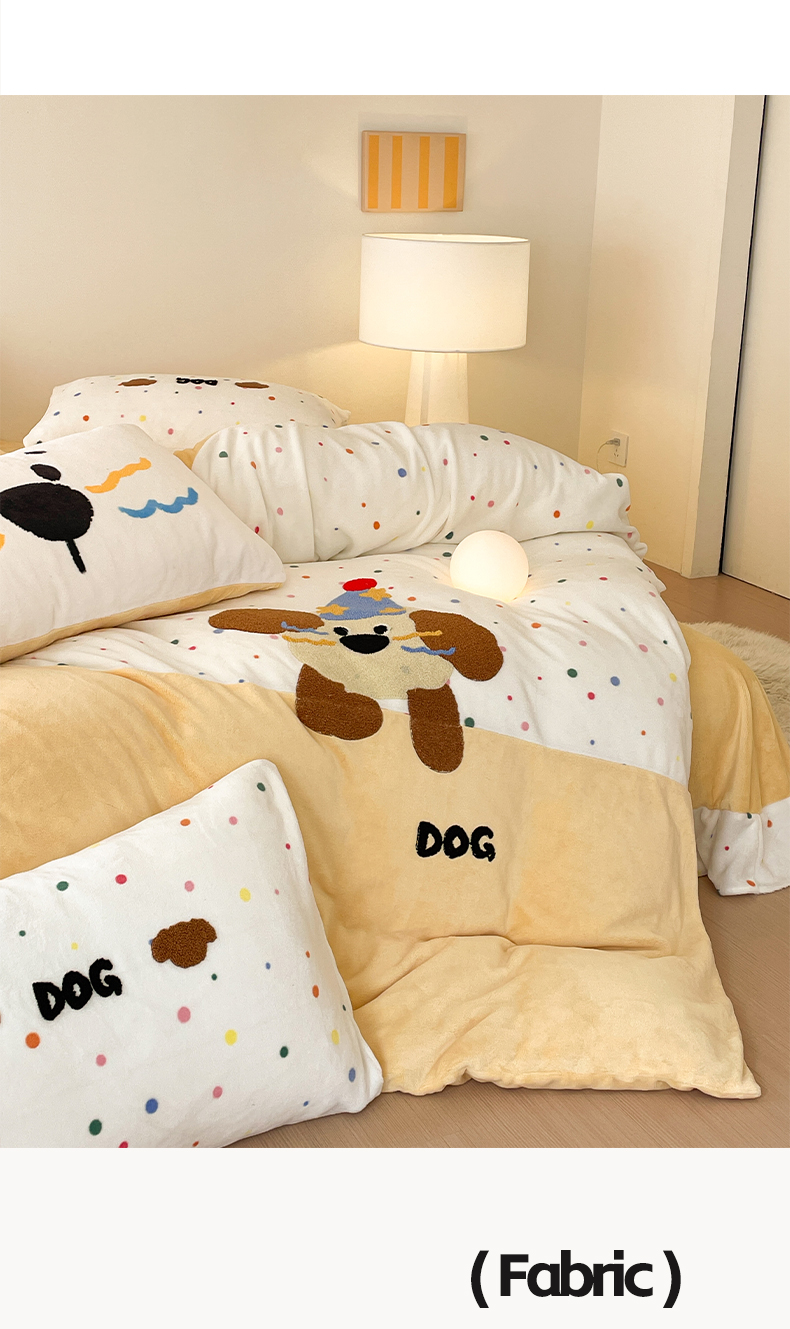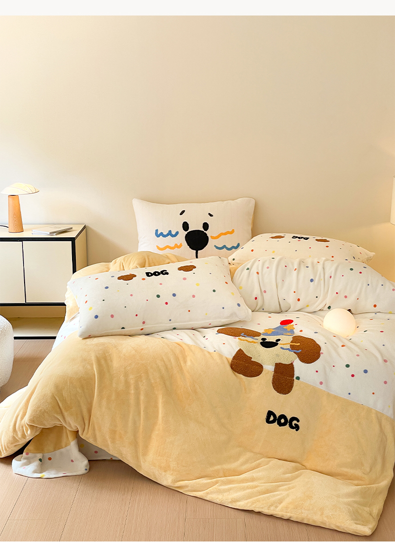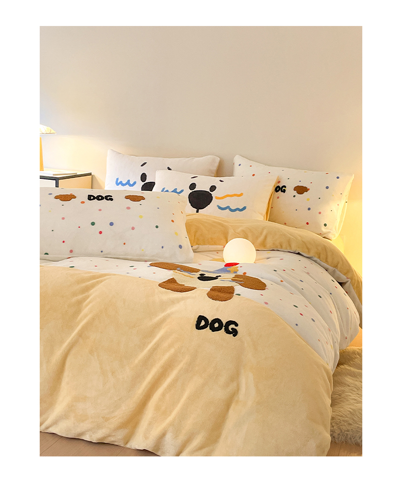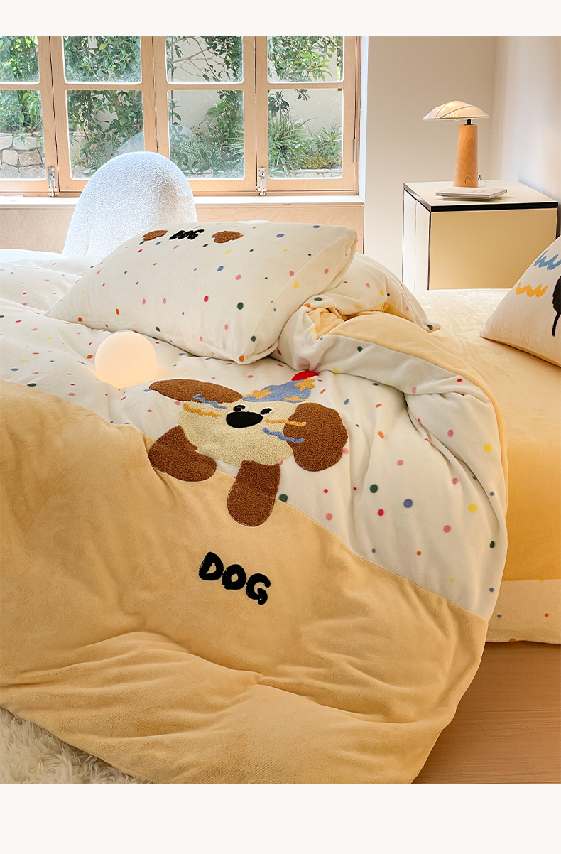 商品名称:如一 2024新款牛奶绒拼接工艺款贴布绣+毛巾绣四件套 毛巾绣-调皮狗