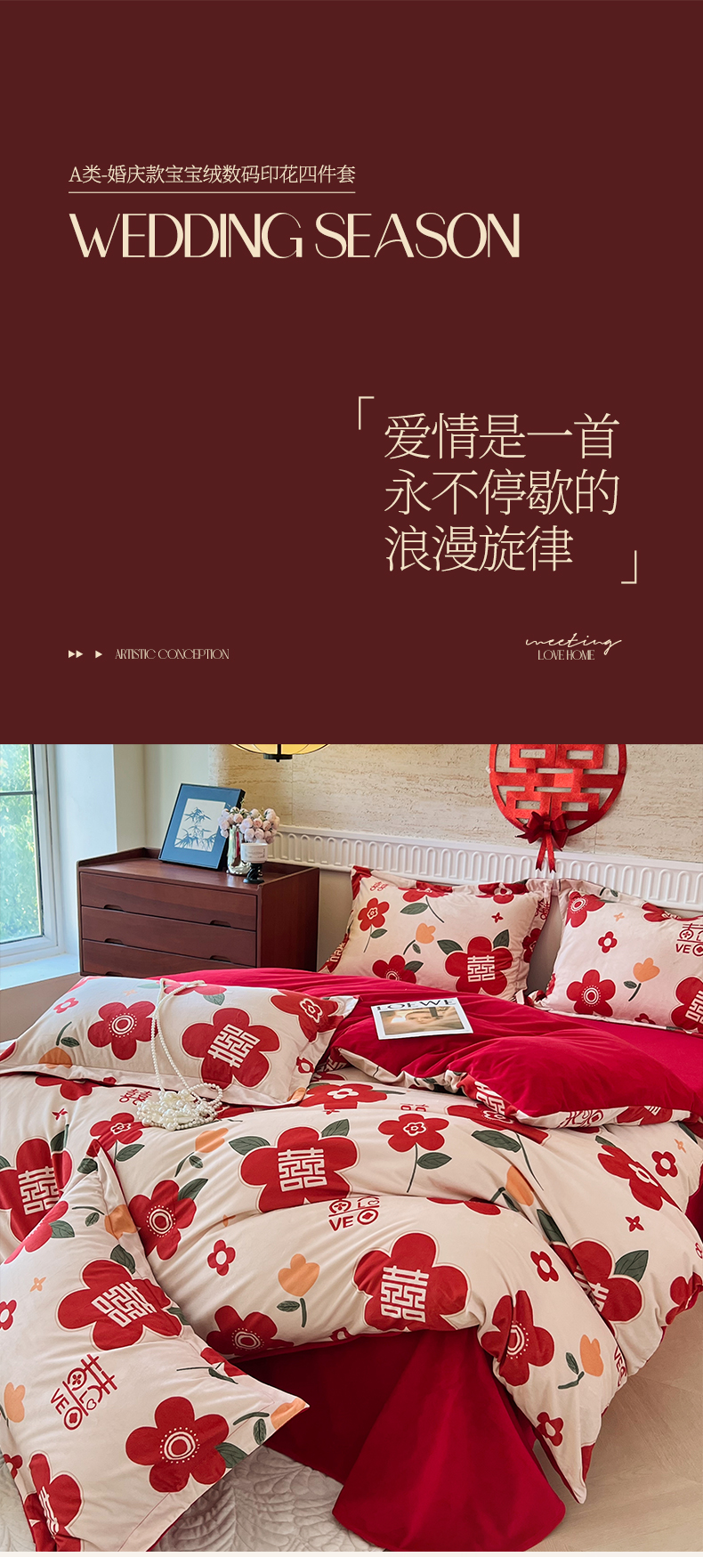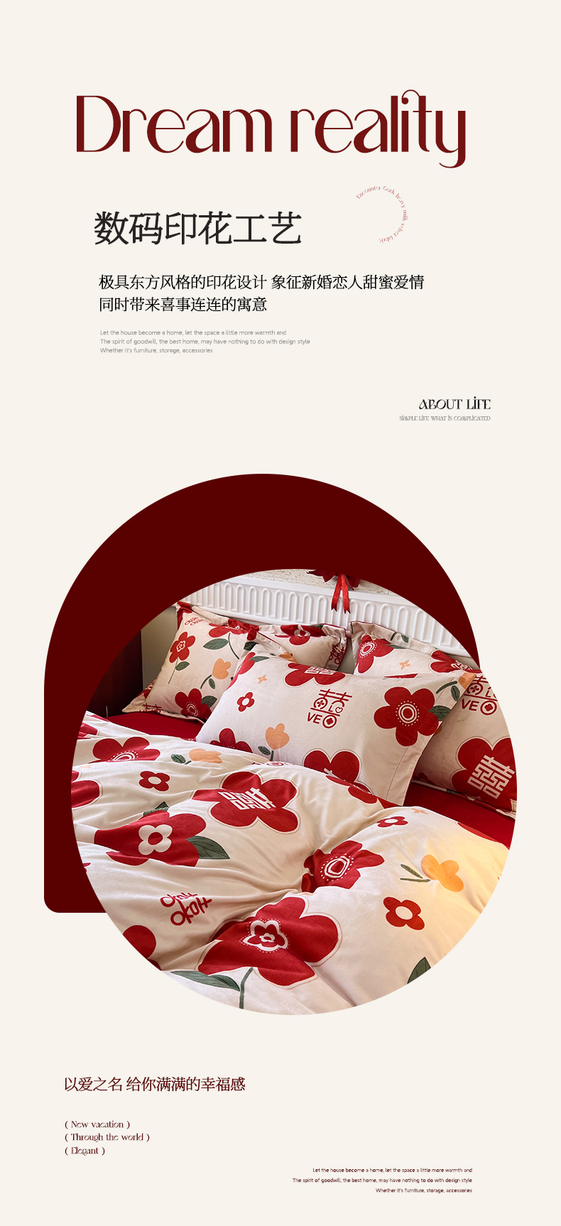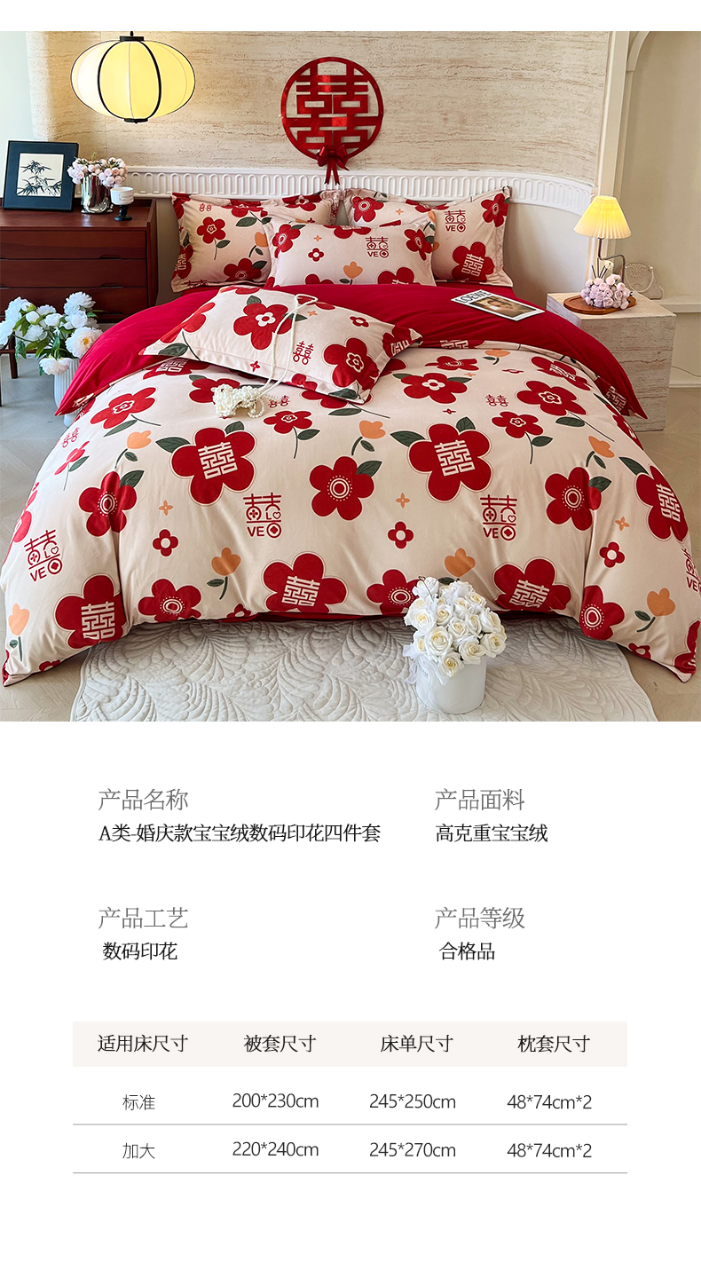 商品名称:慕希家纺 2024新款A类婚庆款宝宝绒数码印花四件套 喜事临门