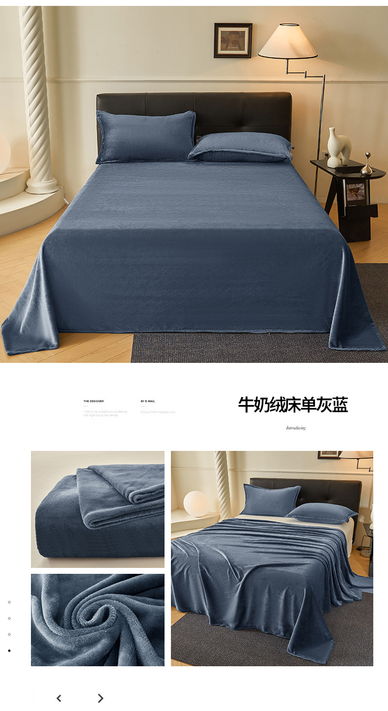 雅萱家纺 2024新款纯色牛奶绒床单 牛奶绒床单灰蓝