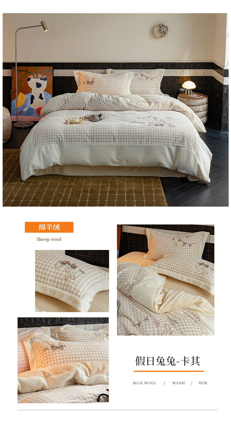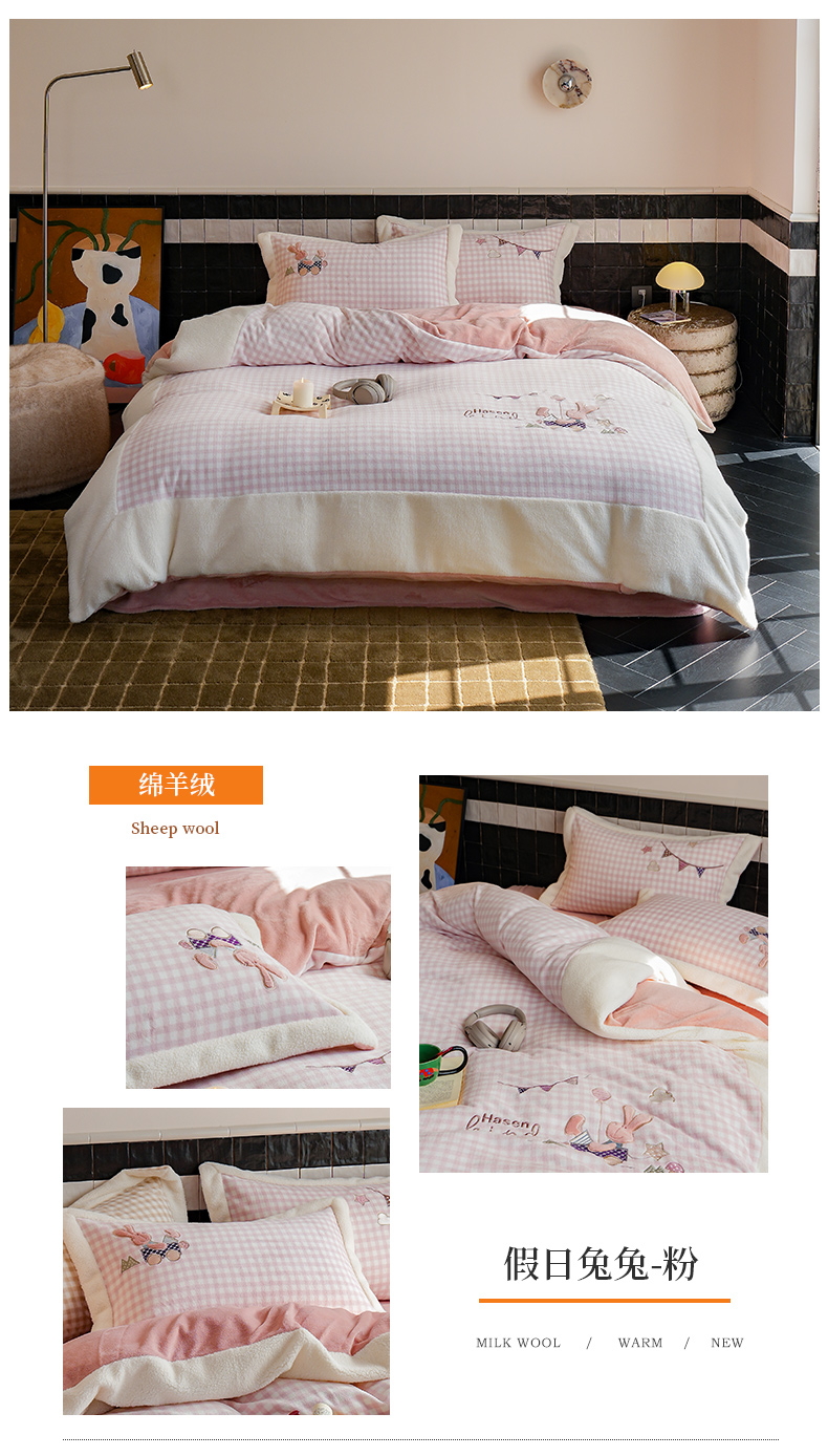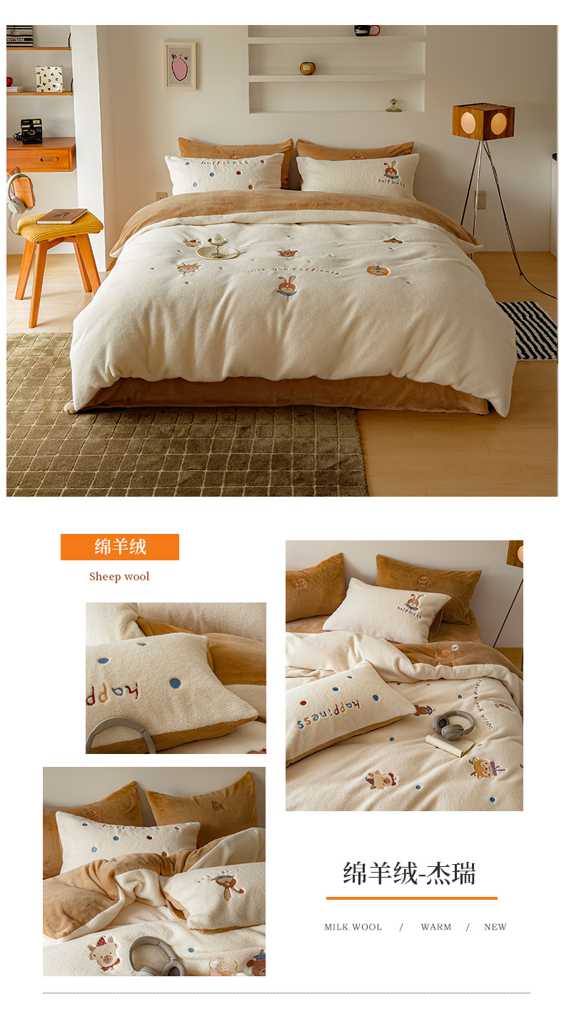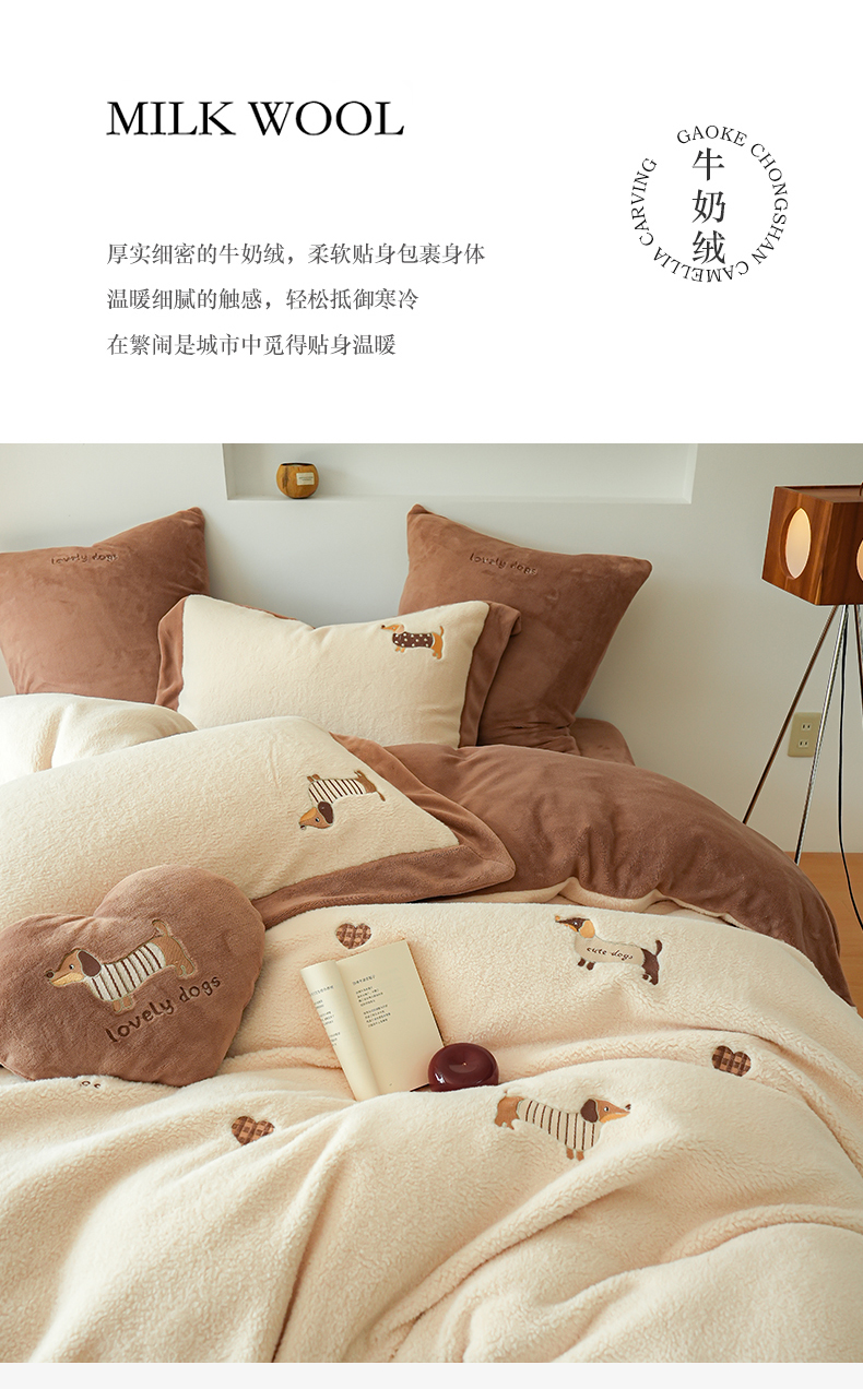 商品名称:(总)沐晴家纺 2024秋冬新品高克重牛奶绒拼色毛巾绣卡通绣花款绵羊绒四件套