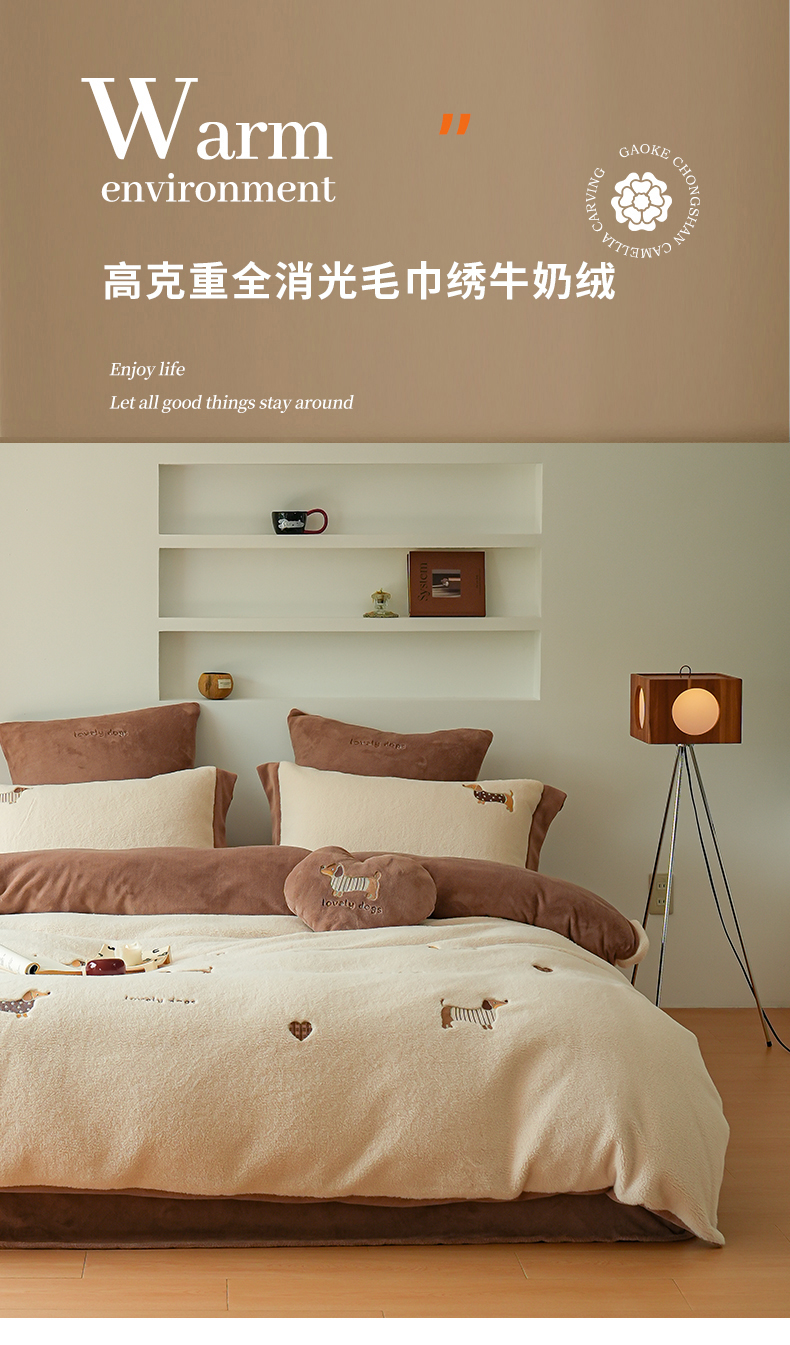 (总)沐晴家纺 2024秋冬新品高克重牛奶绒拼色毛巾绣卡通绣花款绵羊绒四件套