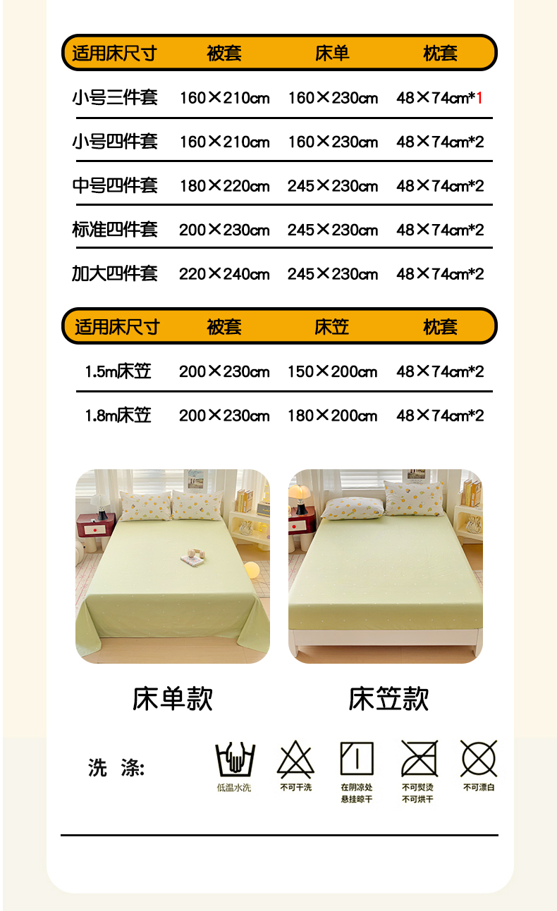 小号三件套【被套160*210,床单160*230,枕套48*74一只】 | ¥72.00 |