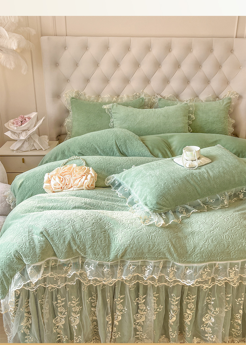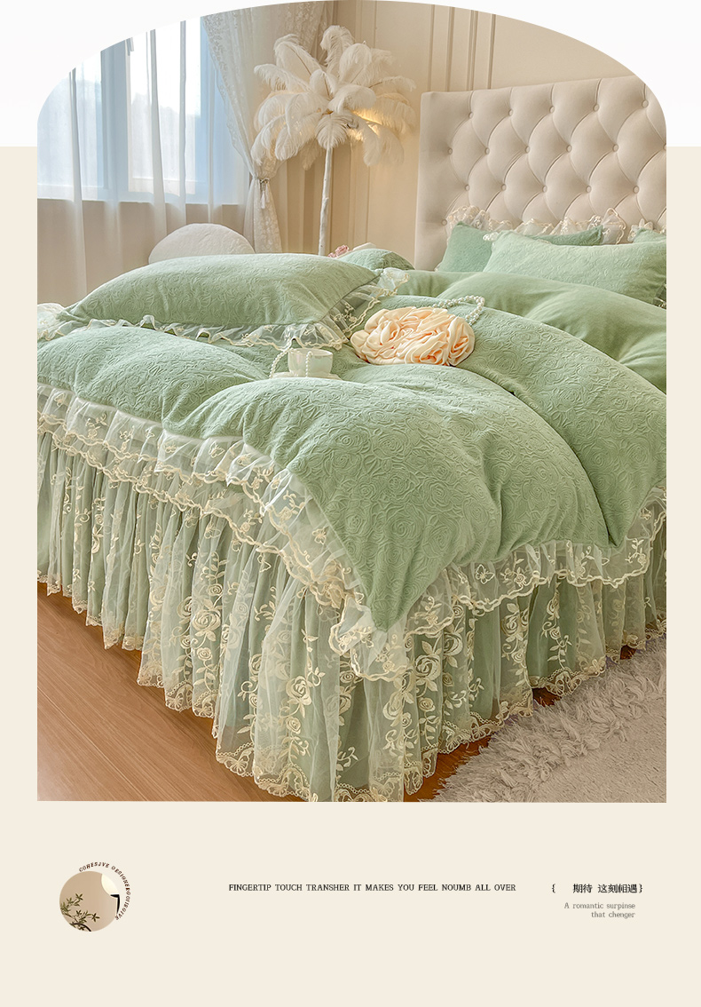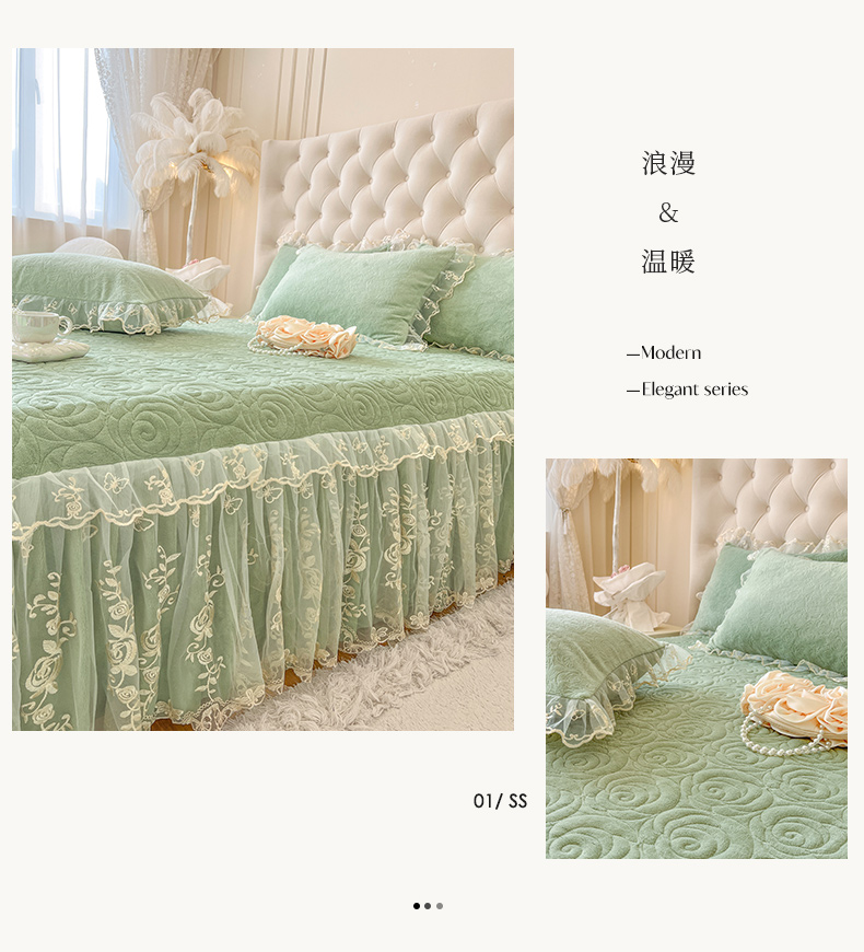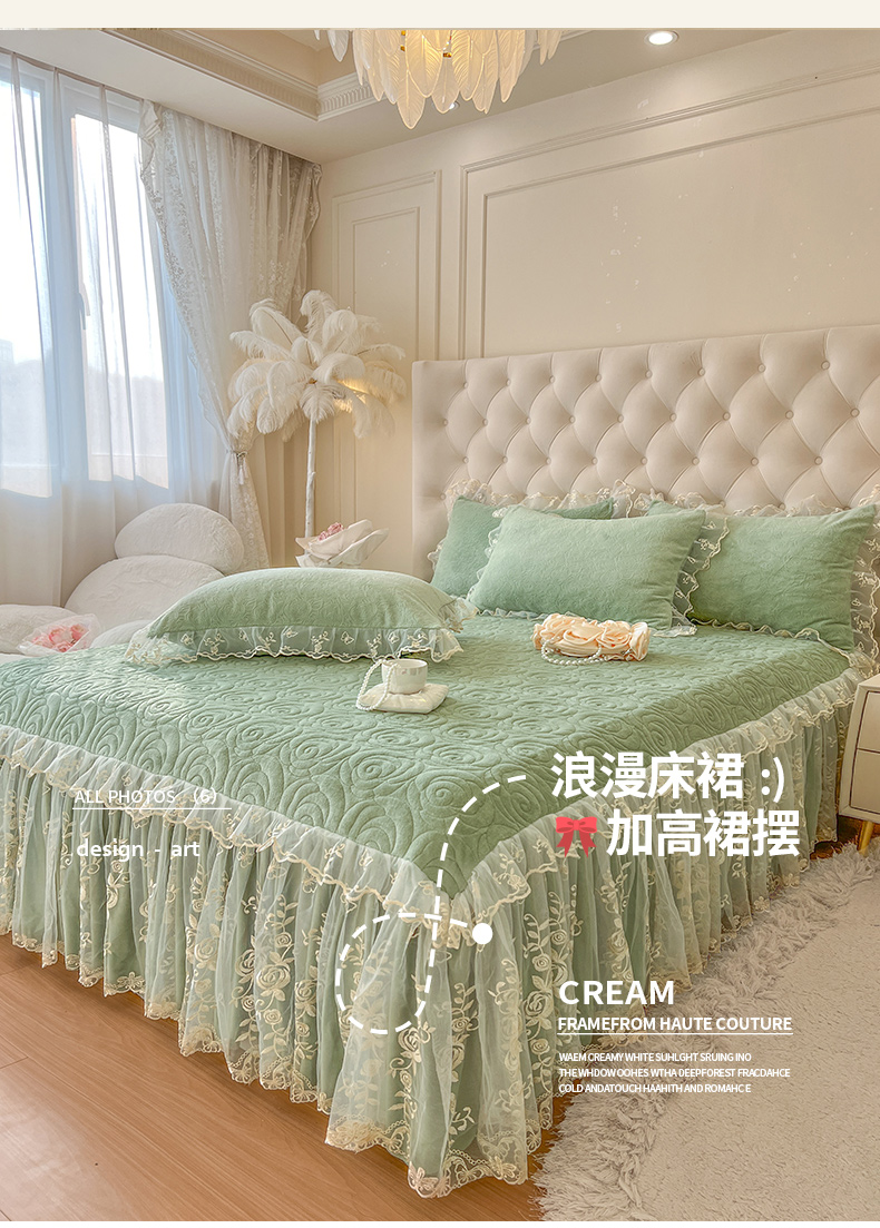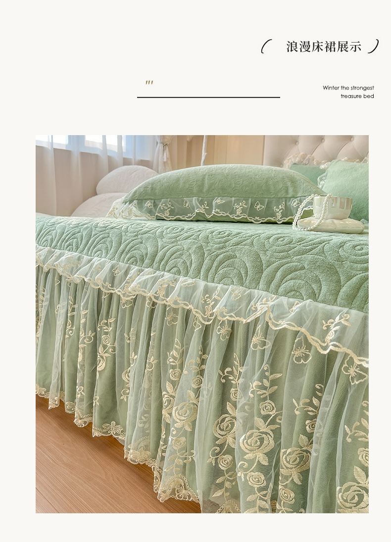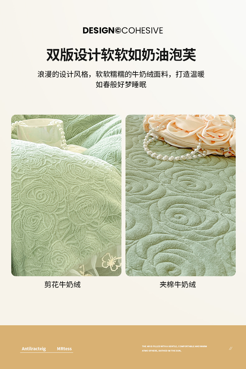 当前位置: 91家纺网 > 商品网购 > 床品套件 > 四件套 > 牛奶绒四件套 > 恋尚 2024新款高克重牛奶绒剪花夹棉床裙四件套--爱莎 爱莎-香草绿