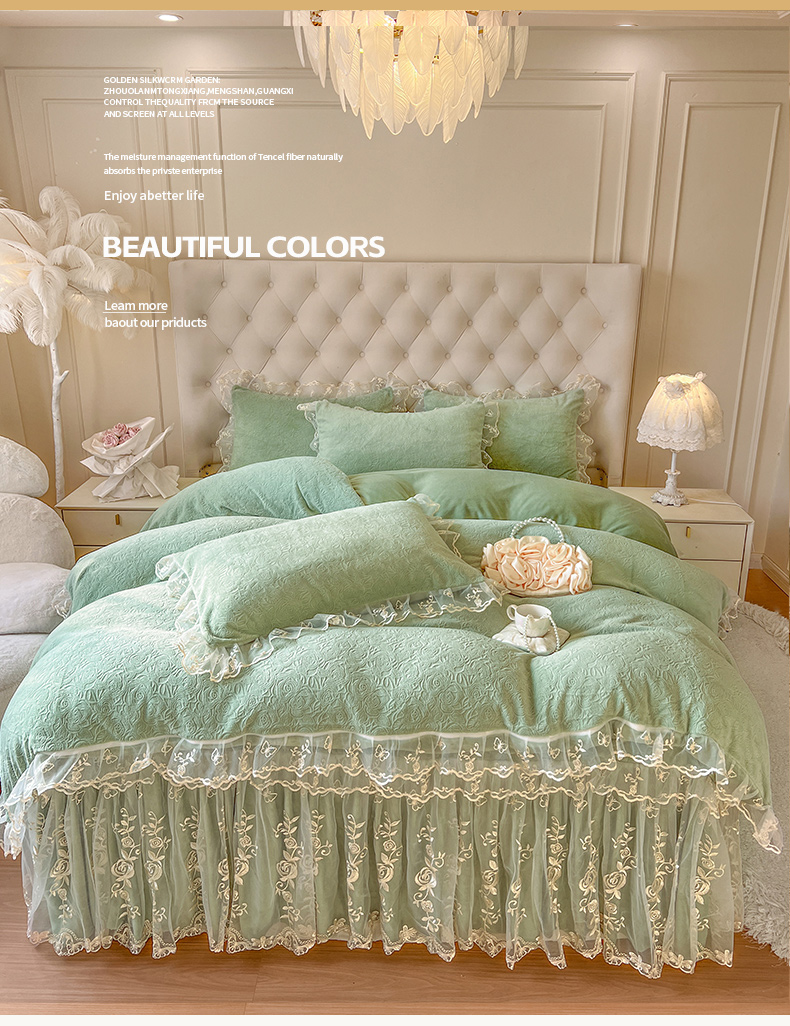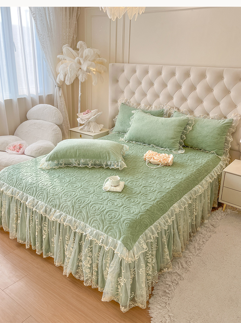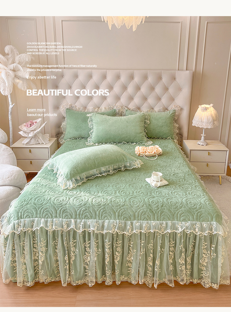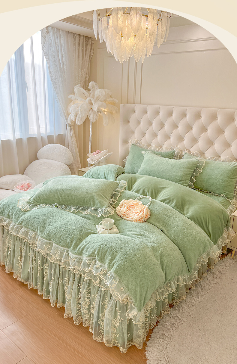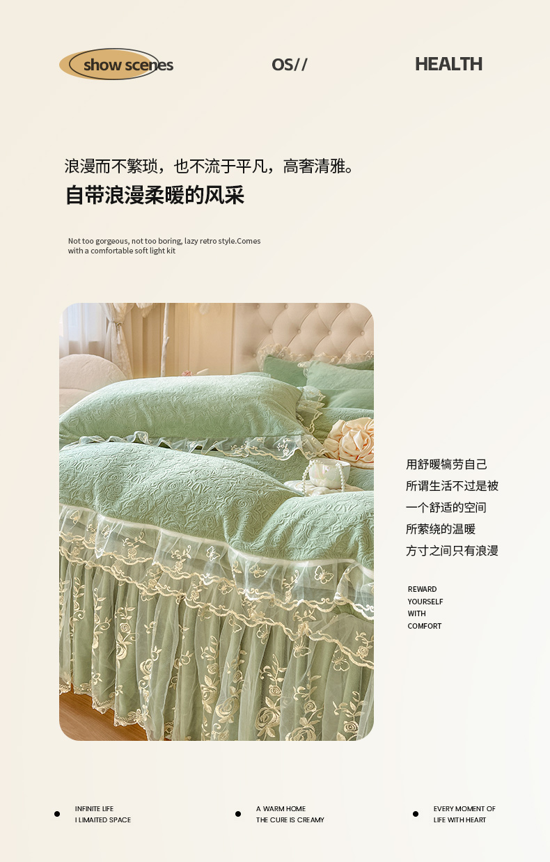 当前位置: 91家纺网 > 商品网购 > 床品套件 > 四件套 > 牛奶绒四件套 > 恋尚 2024新款高克重牛奶绒剪花夹棉床裙四件套--爱莎 爱莎-香草绿