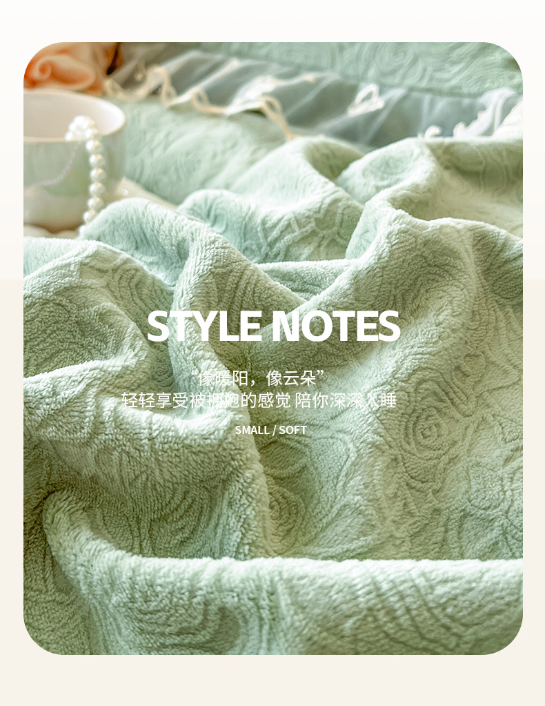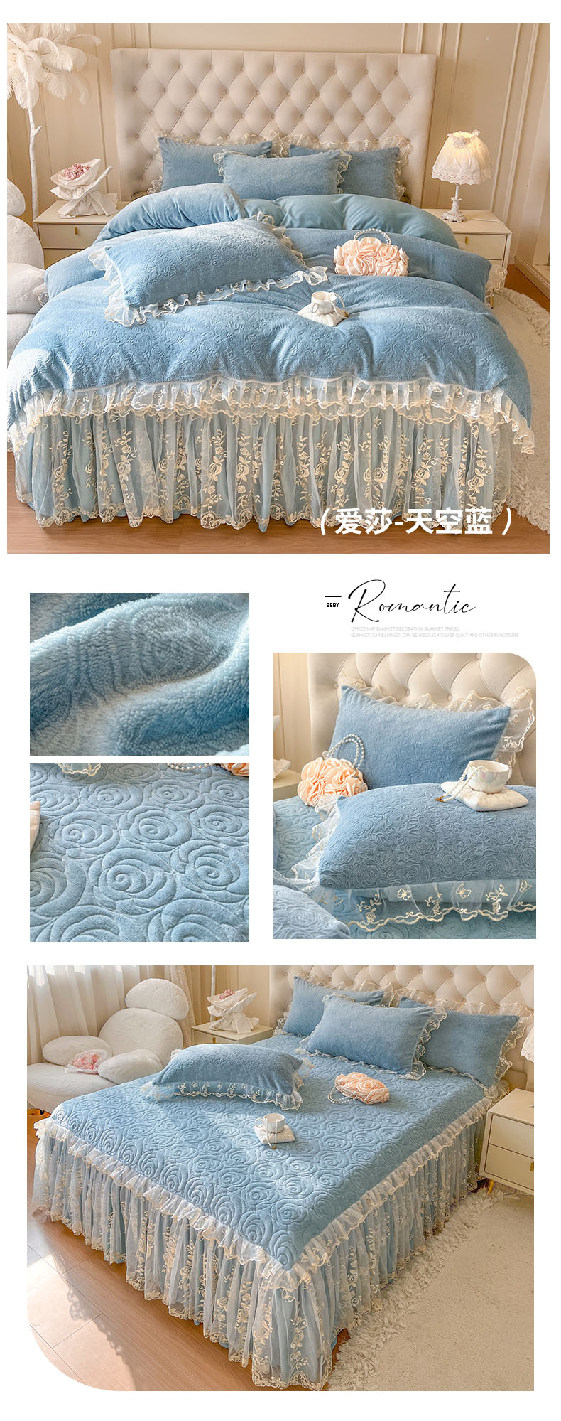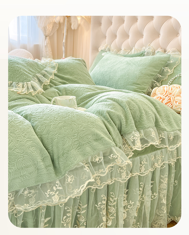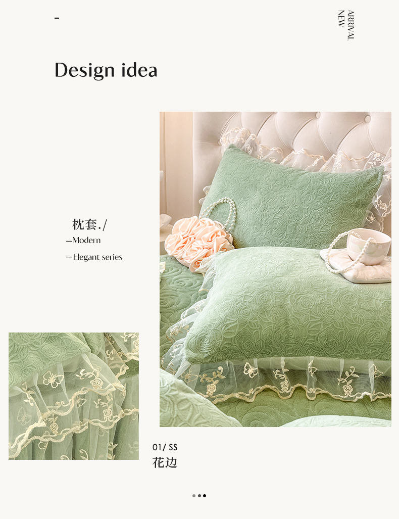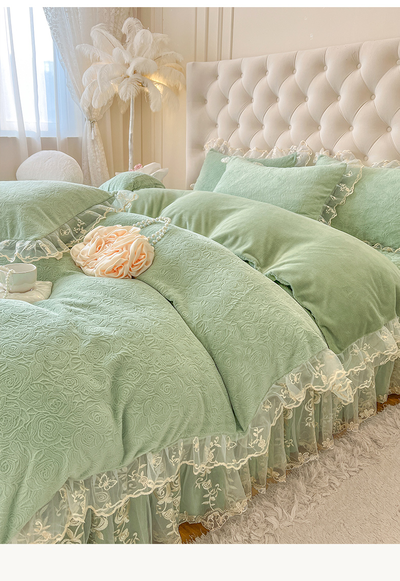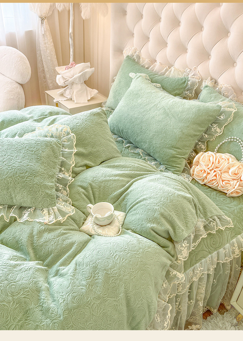 当前位置: 91家纺网 > 商品网购 > 床品套件 > 四件套 > 牛奶绒四件套 > 恋尚 2024新款高克重牛奶绒剪花夹棉床裙四件套--爱莎 爱莎-香草绿