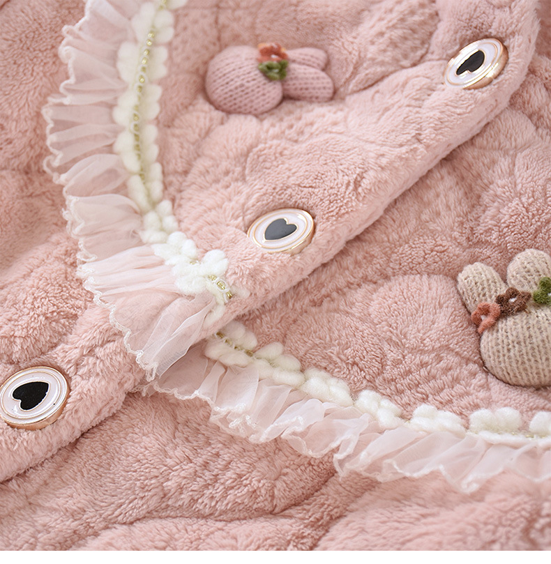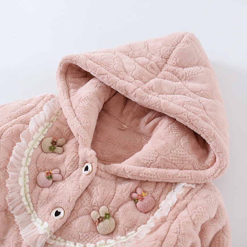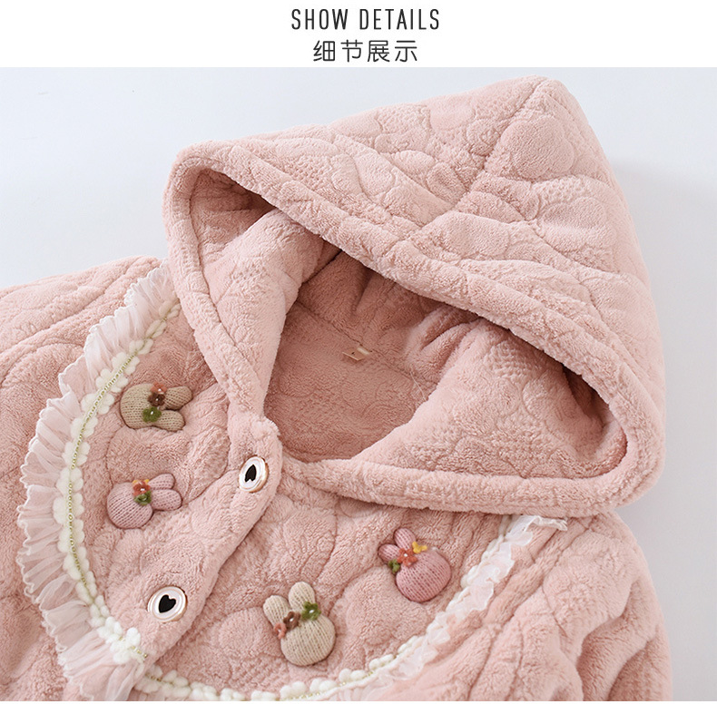(总)粉色连帽睡衣女士珊瑚绒秋冬季夹棉加厚加绒保暖法兰绒家居服