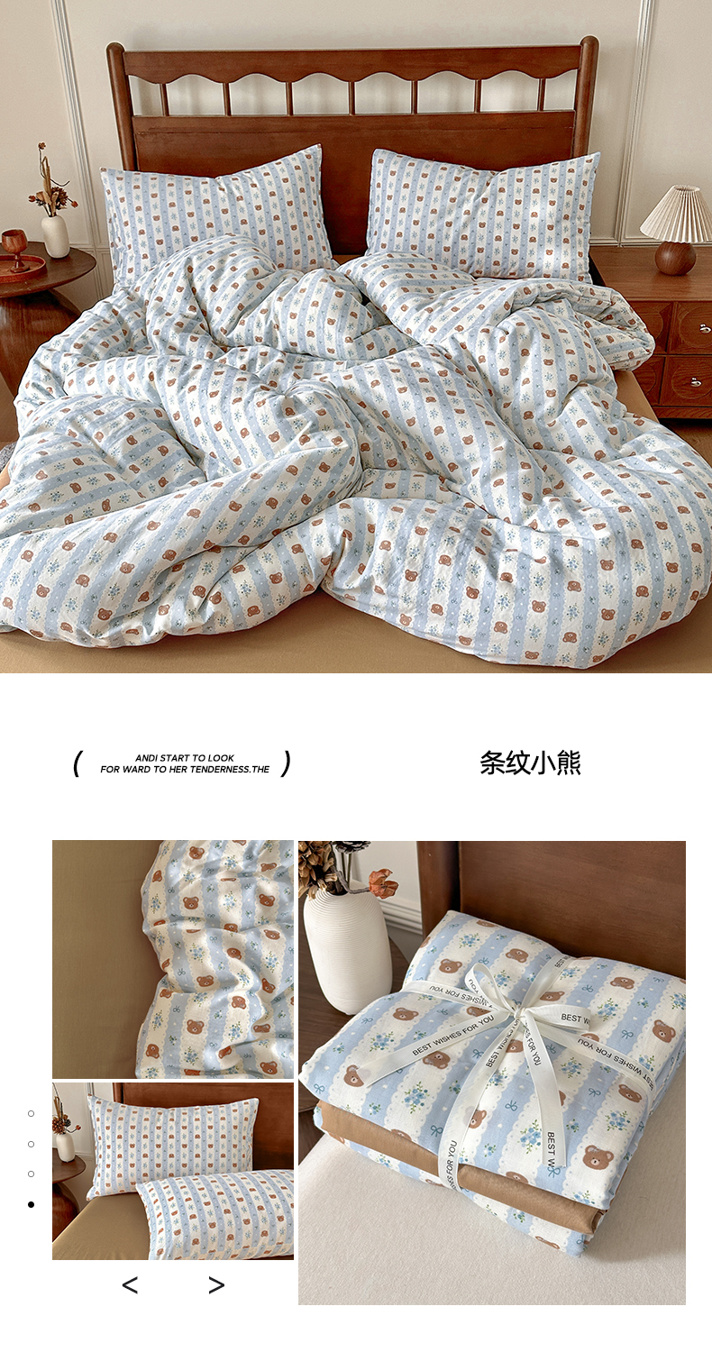 商品名称:呗旺鹿 2025新款A类母婴级全棉有氧双层纱印花四件套 条纹小熊