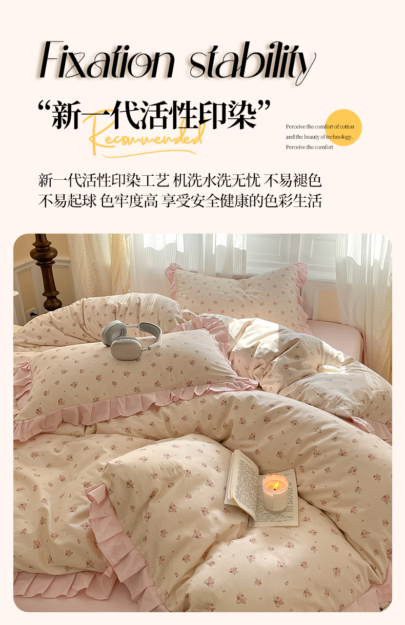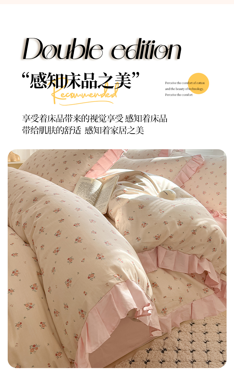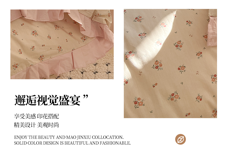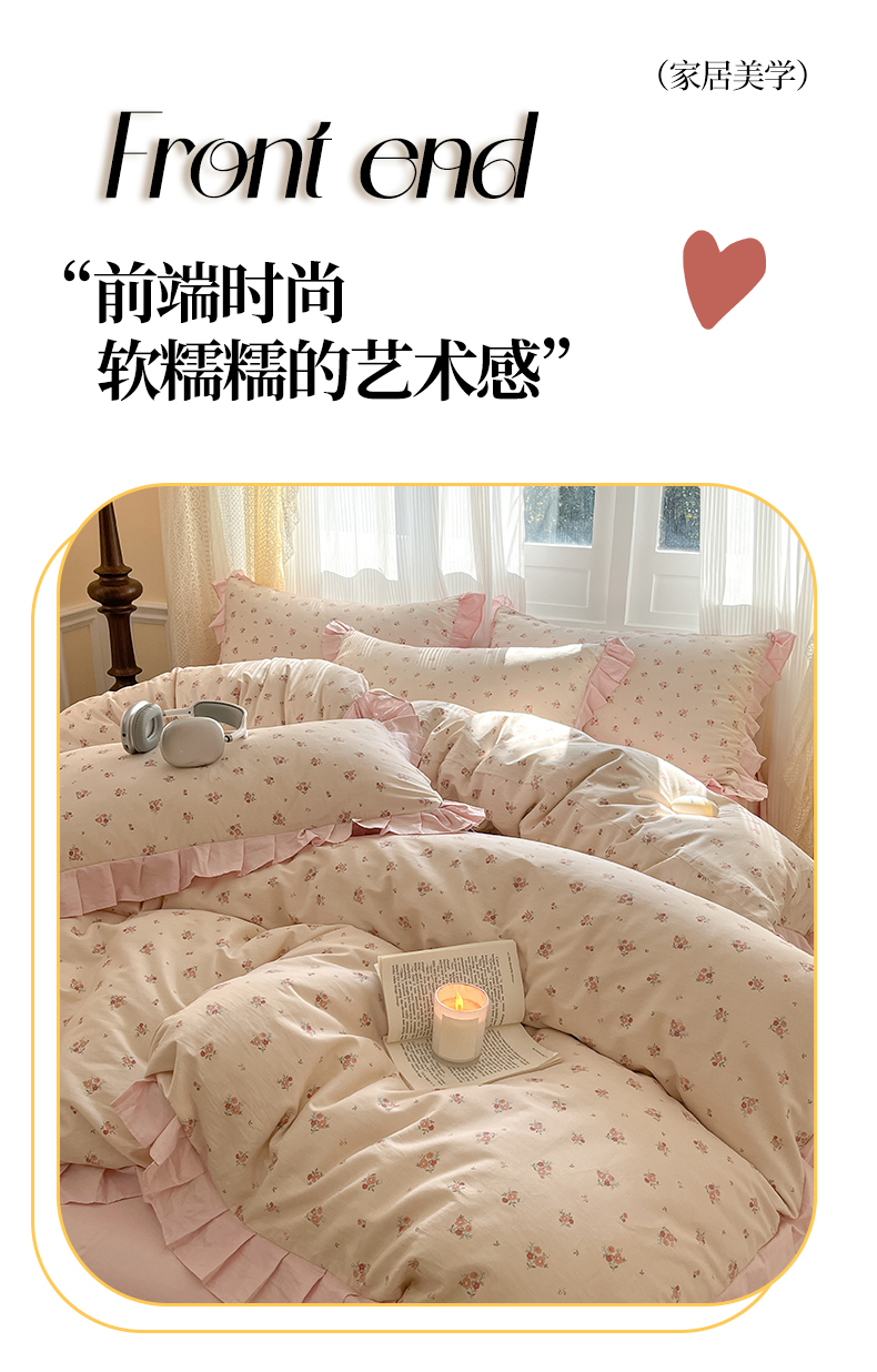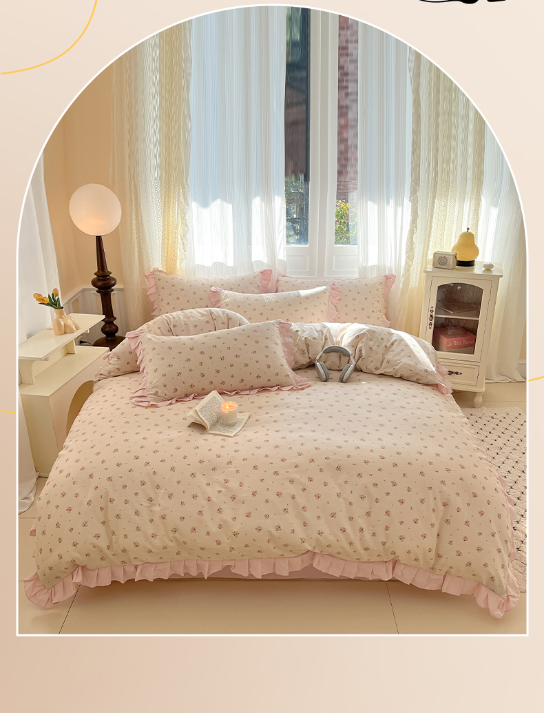 商品名称:(总)羚羊语家纺 2025新款春夏ins40支全棉韩式花边款轻法式13372小清新喷气印花纯棉四件套被套床单床笠三件套