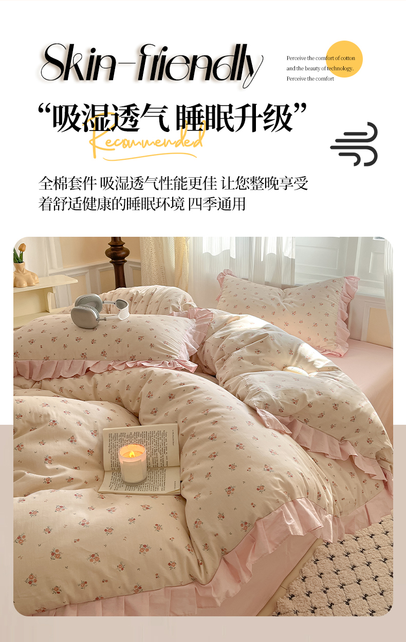 (总)羚羊语家纺 2025新款春夏ins40支全棉韩式花边款轻法式13372小清新喷气印花纯棉四件套被套床单床笠三件套