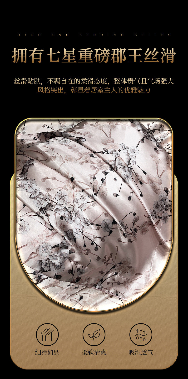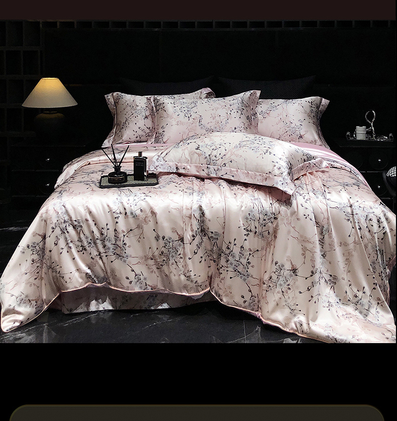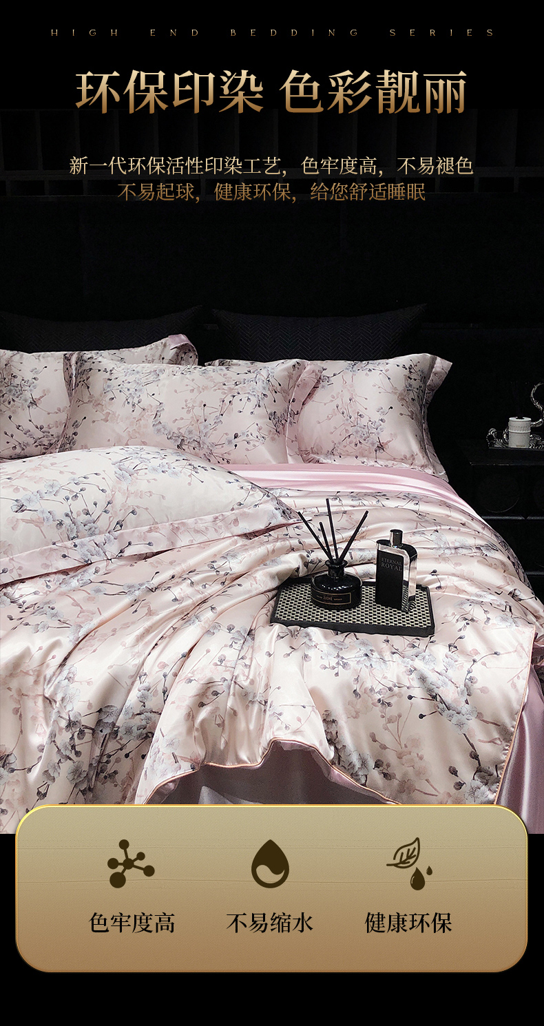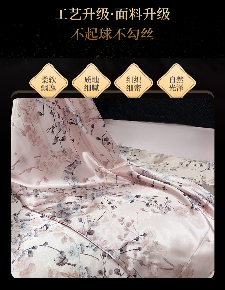 商品名称:黄鹂鸟 2025新款高端轻奢丝滑裸睡丝绸数码印花水洗真丝天丝四件套系列 -风格三 桃林秘境