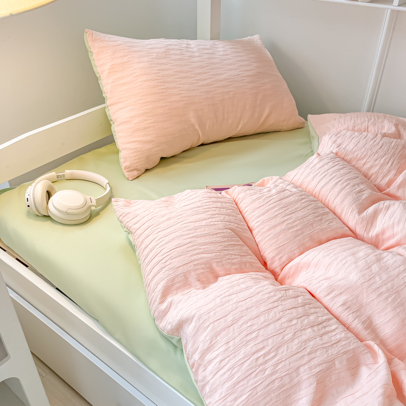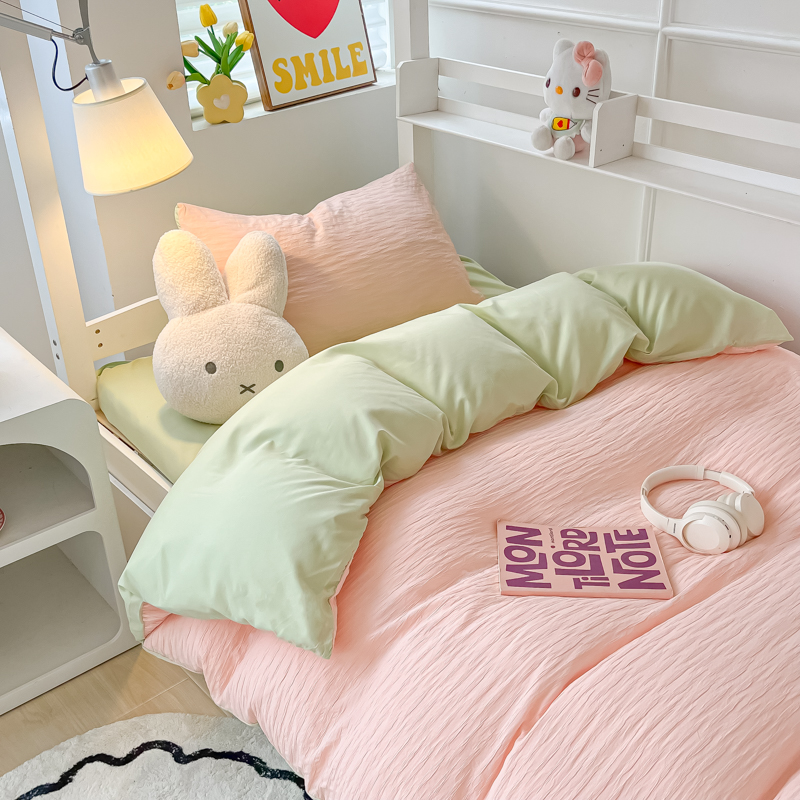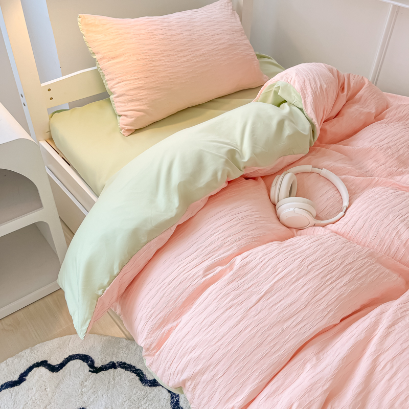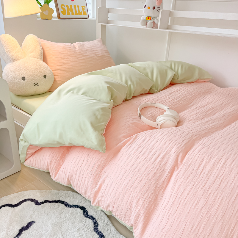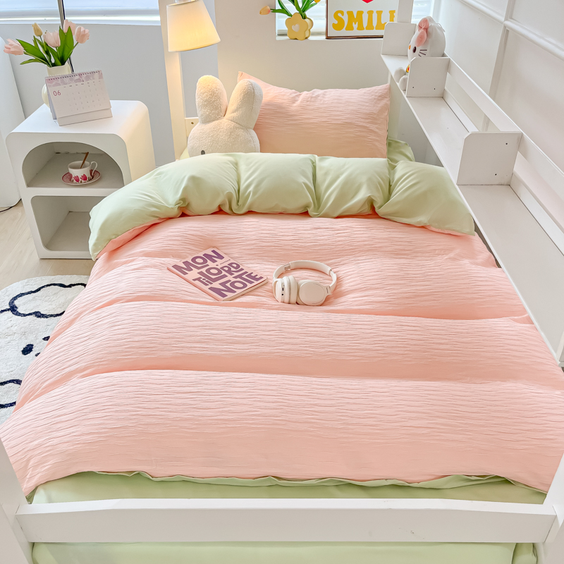 • 91家纺网 家纺一手货源 找家纺 悦织湾2025新款水洗棉泡泡纱系列三件套学生宿舍单人三件套轻奢时尚床上用品四件套 泡泡纱-粉+果绿
