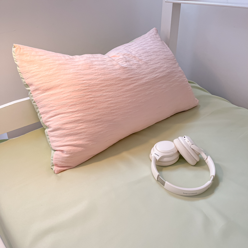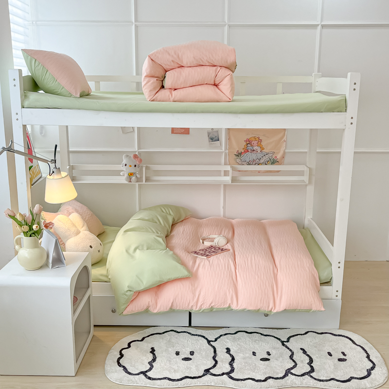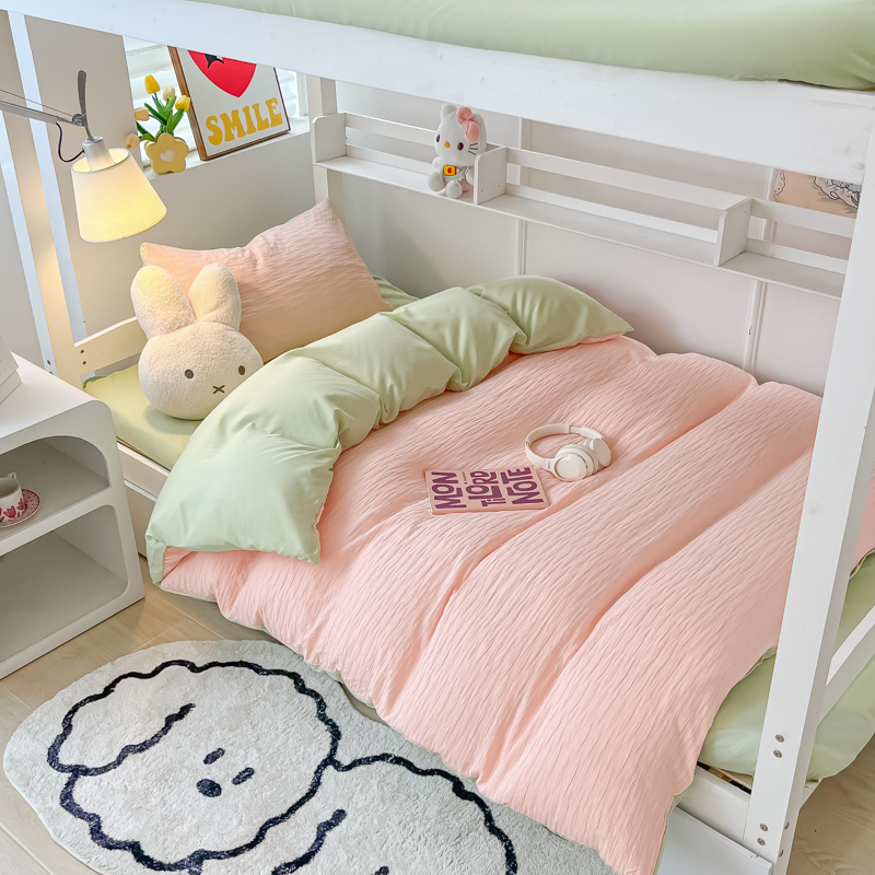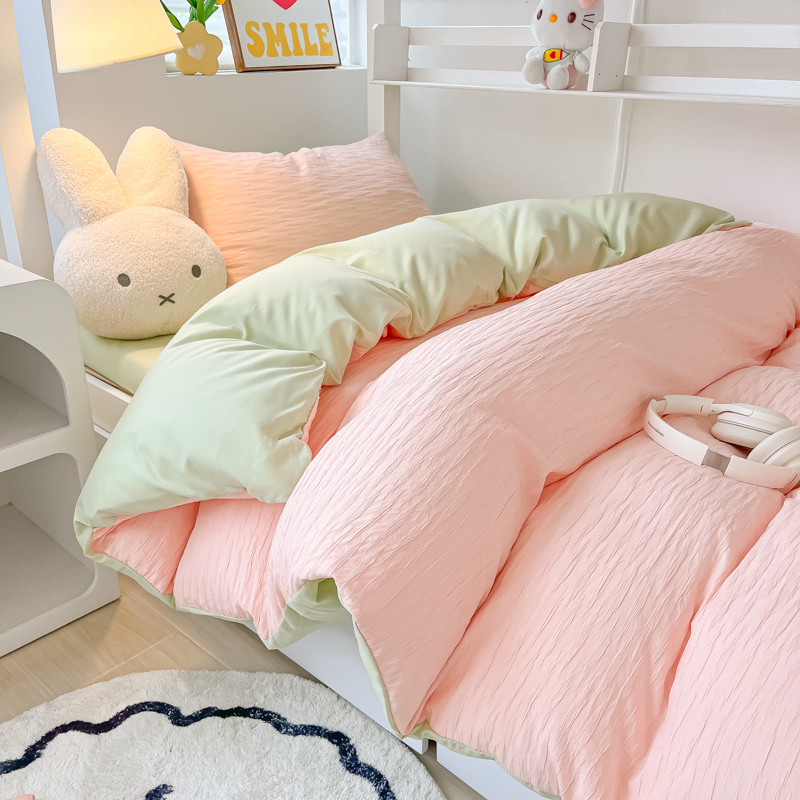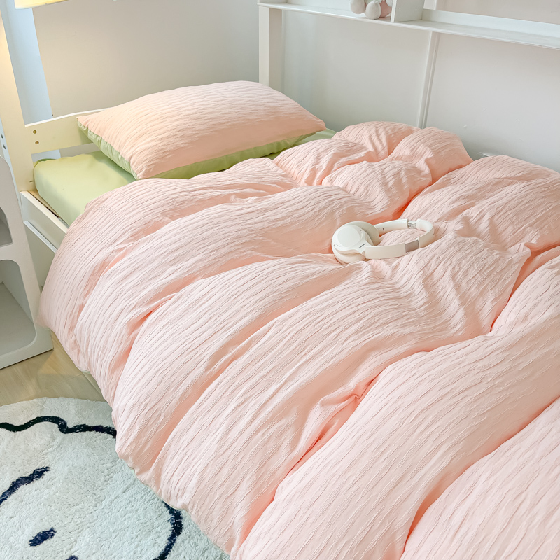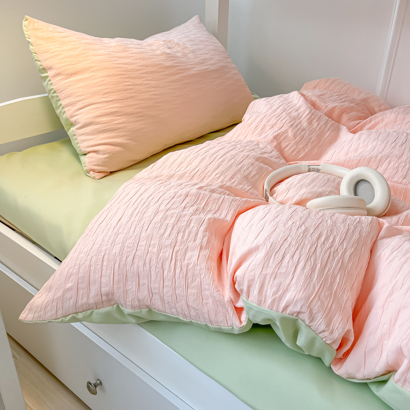 • 91家纺网 家纺一手货源 找家纺 悦织湾2025新款水洗棉泡泡纱系列三件套学生宿舍单人三件套轻奢时尚床上用品四件套 泡泡纱-粉+果绿