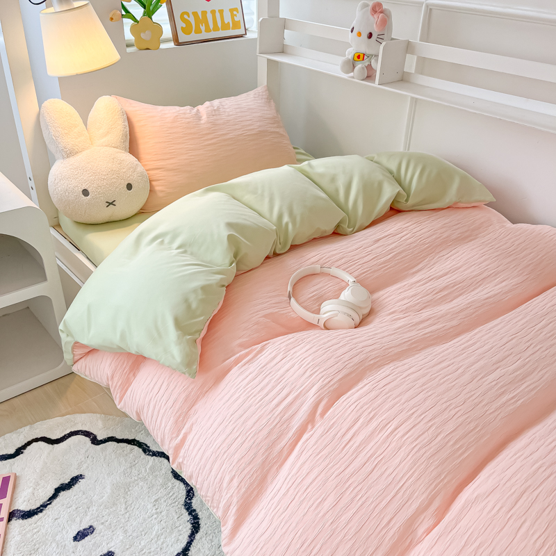 悦织湾2025新款水洗棉泡泡纱系列三件套学生宿舍单人三件套轻奢时尚床上用品四件套 泡泡纱-粉+果绿