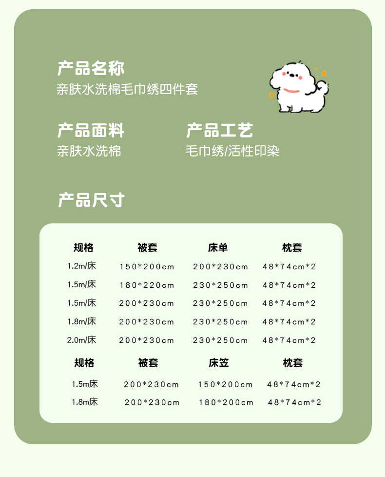 商品名称:(总)韩都家居 2025新款春夏新款水洗棉卡通毛巾绣四件套-西高地(包含买家秀)