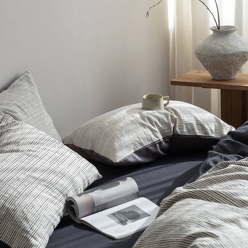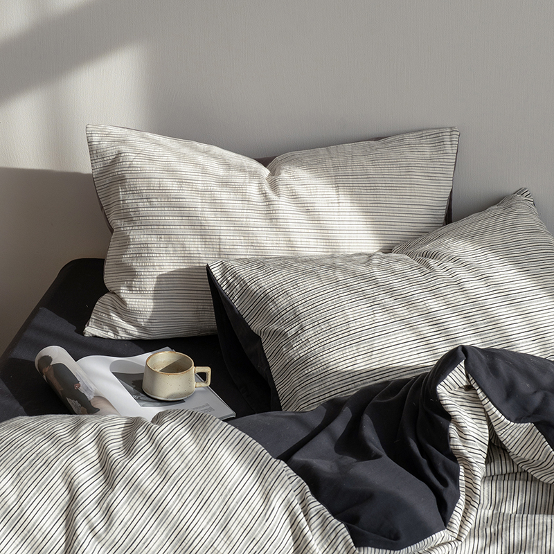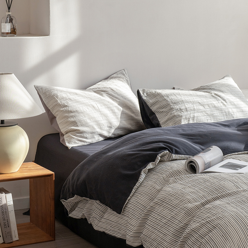 (总)小春日和 2025新款纯棉棉麻民宿中性风四件套高端全棉人字纹条纹被套加大纯色床单1.8床笠男士四件套,木笙-黑,木笙-米