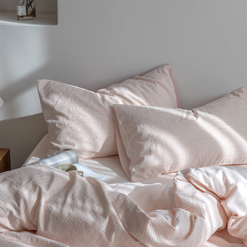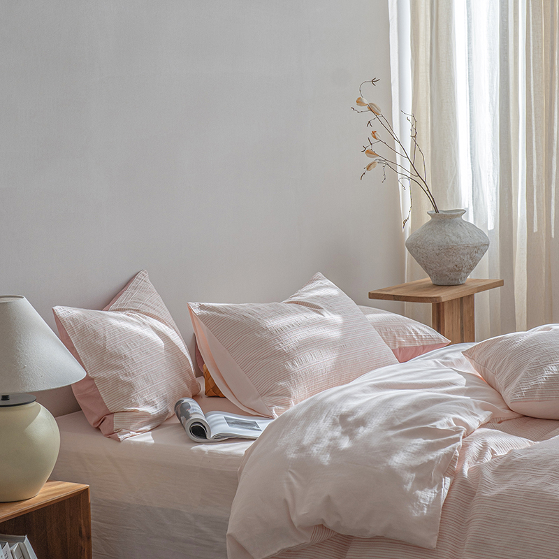 (总)小春日和 2025新款纯棉提花条纹四件套全棉简约民宿高端床品四件套水洗提花人字纹床单1.8床笠加大床单,喜又-粉,喜又-蓝