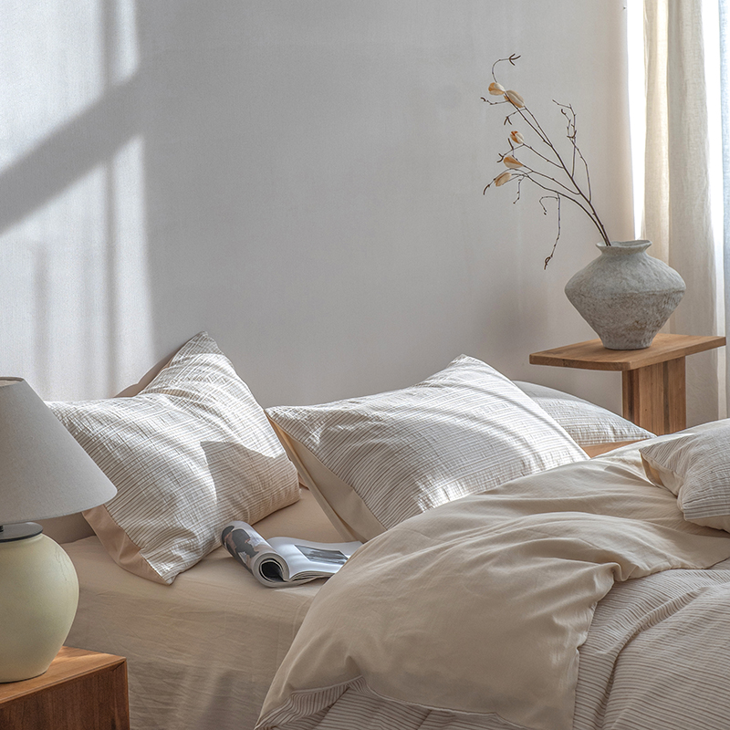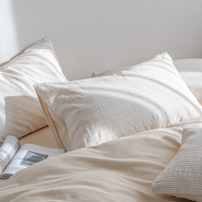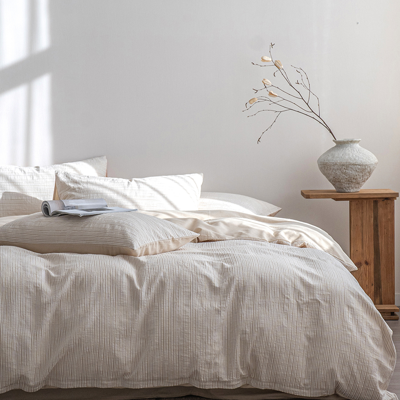 商品名称:小春日和 2025新款高端民宿风纯棉四件套特殊工艺全棉被套人字纹棉1.8床笠纯色双人床单加大笠 岛屿-驼