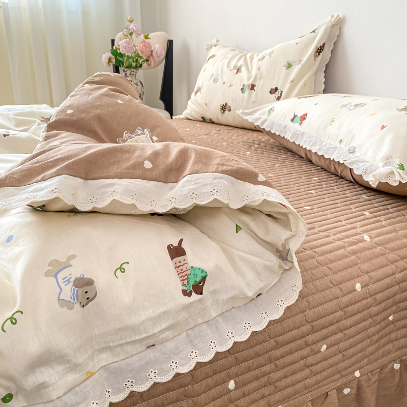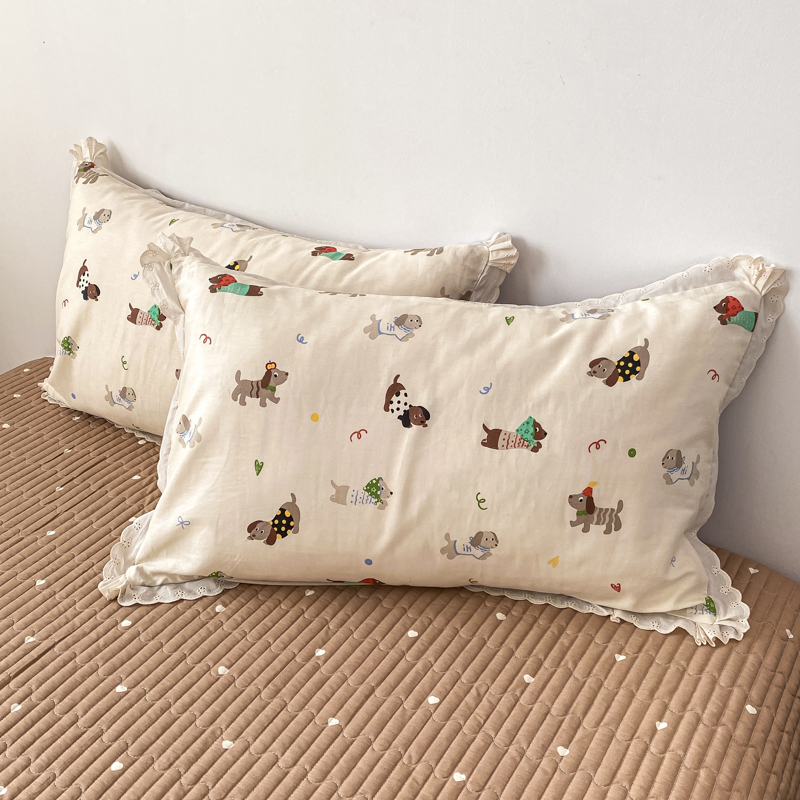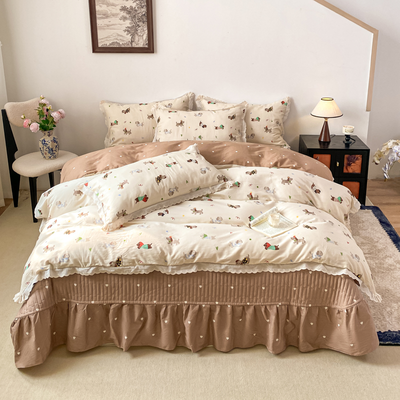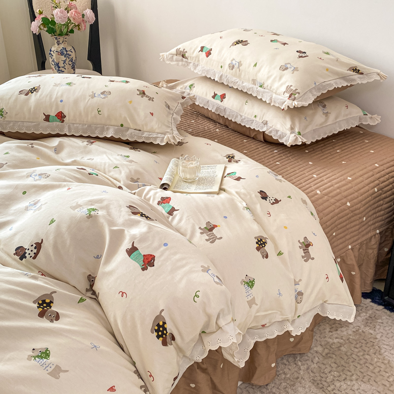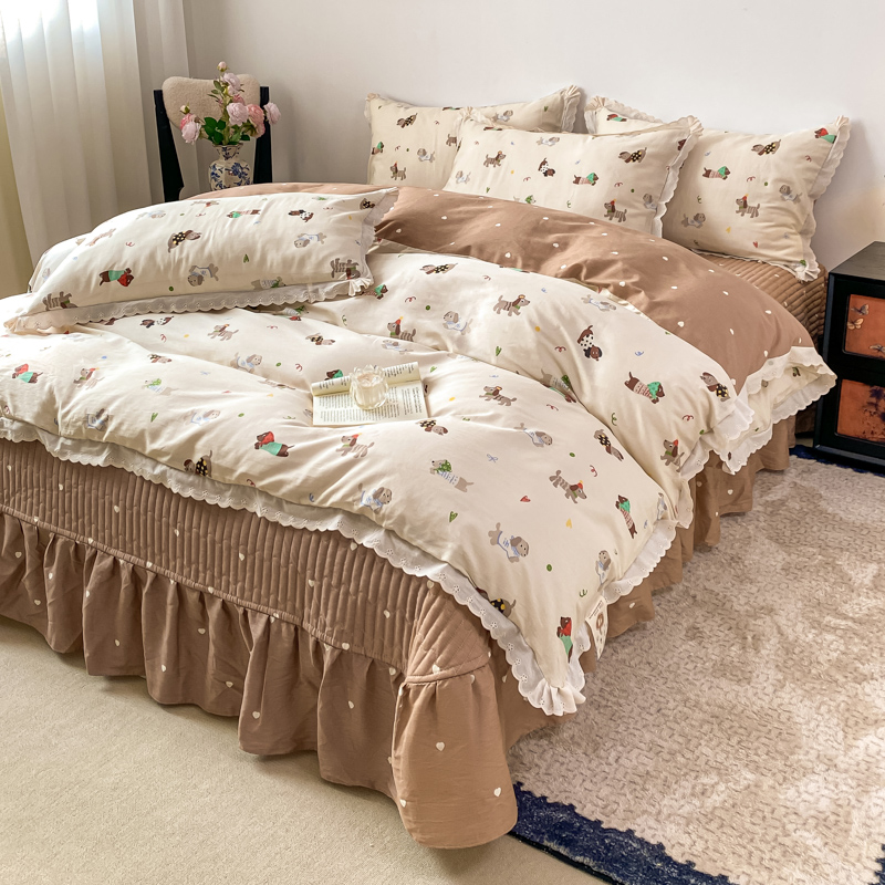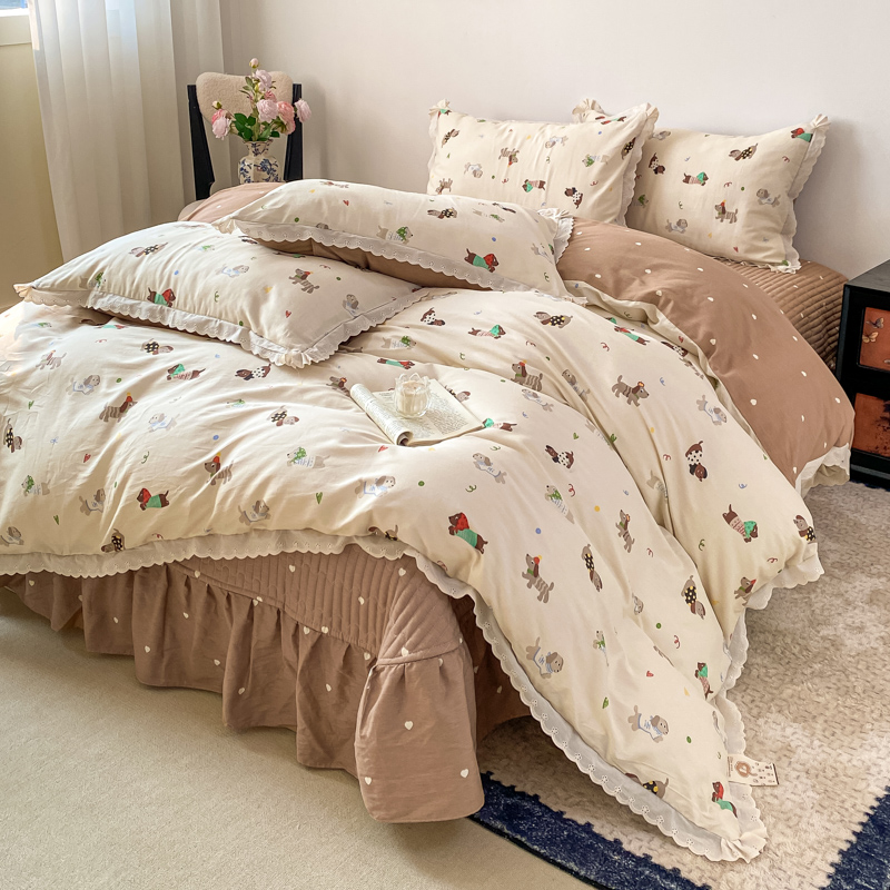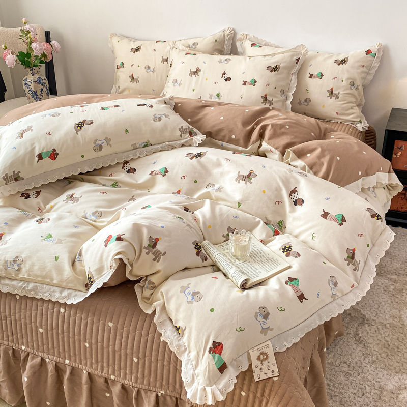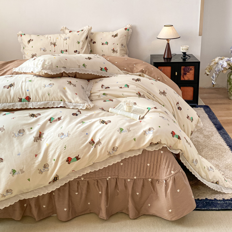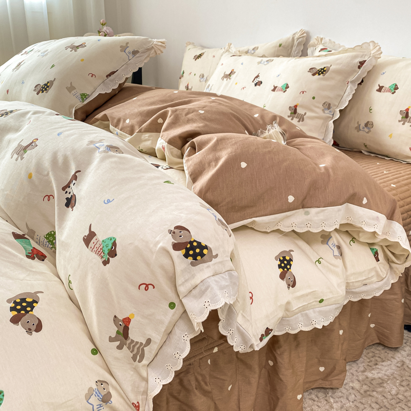 梦可莱家居 2025新款全棉韩版蕾丝边床盖四件套 腊肠狗