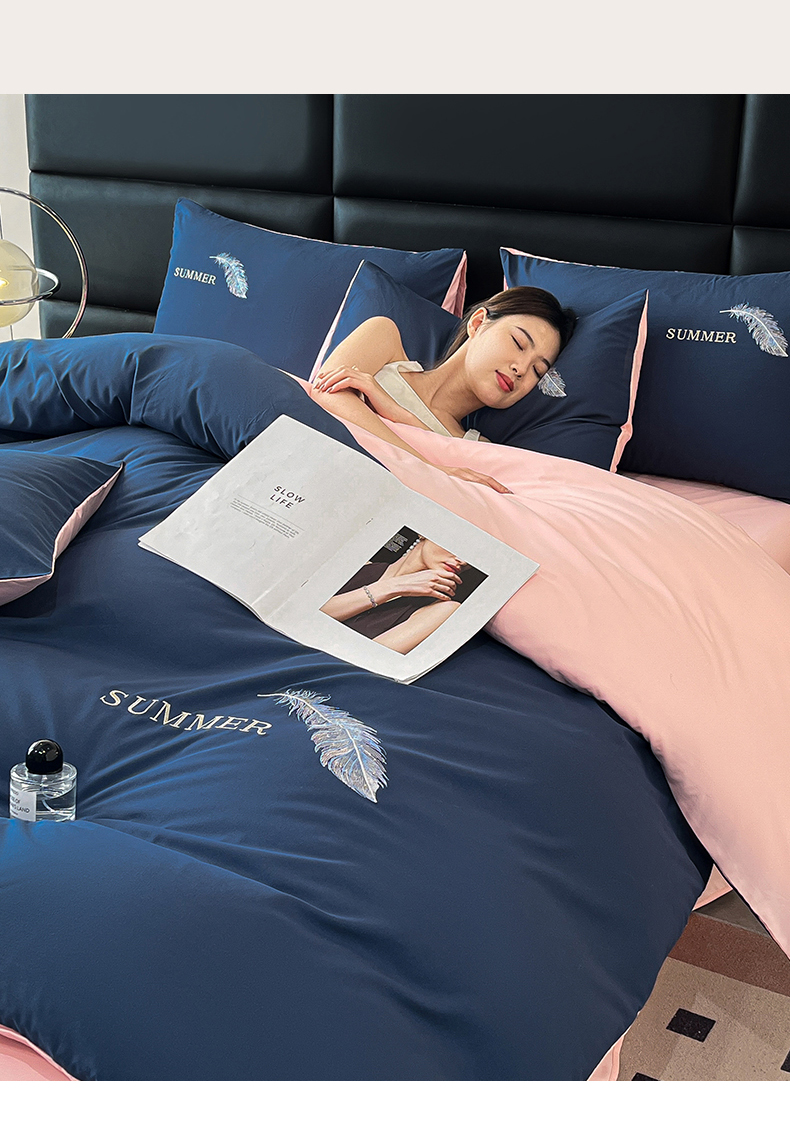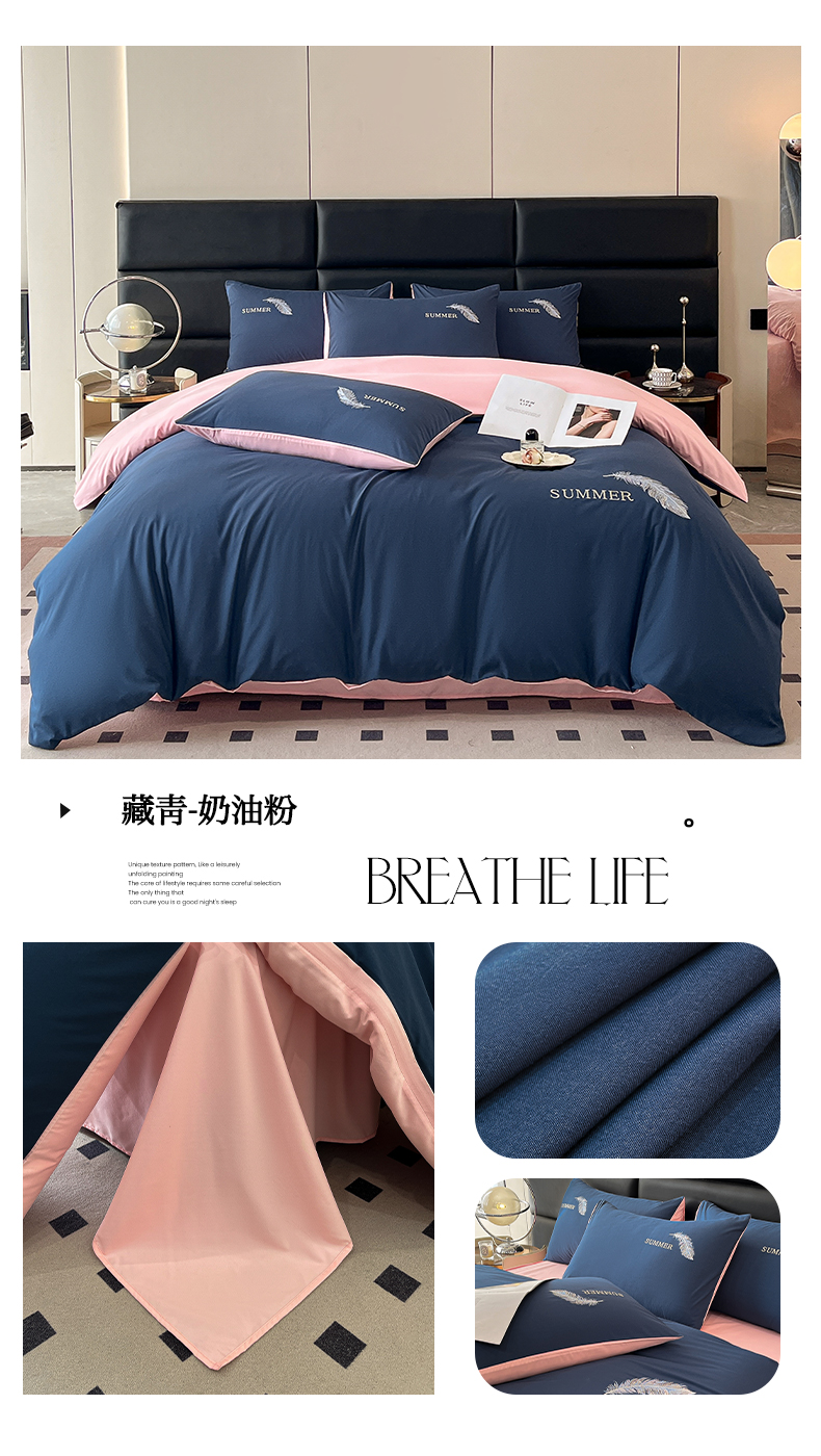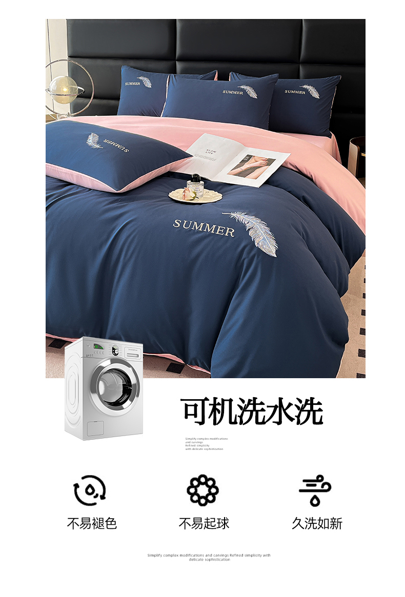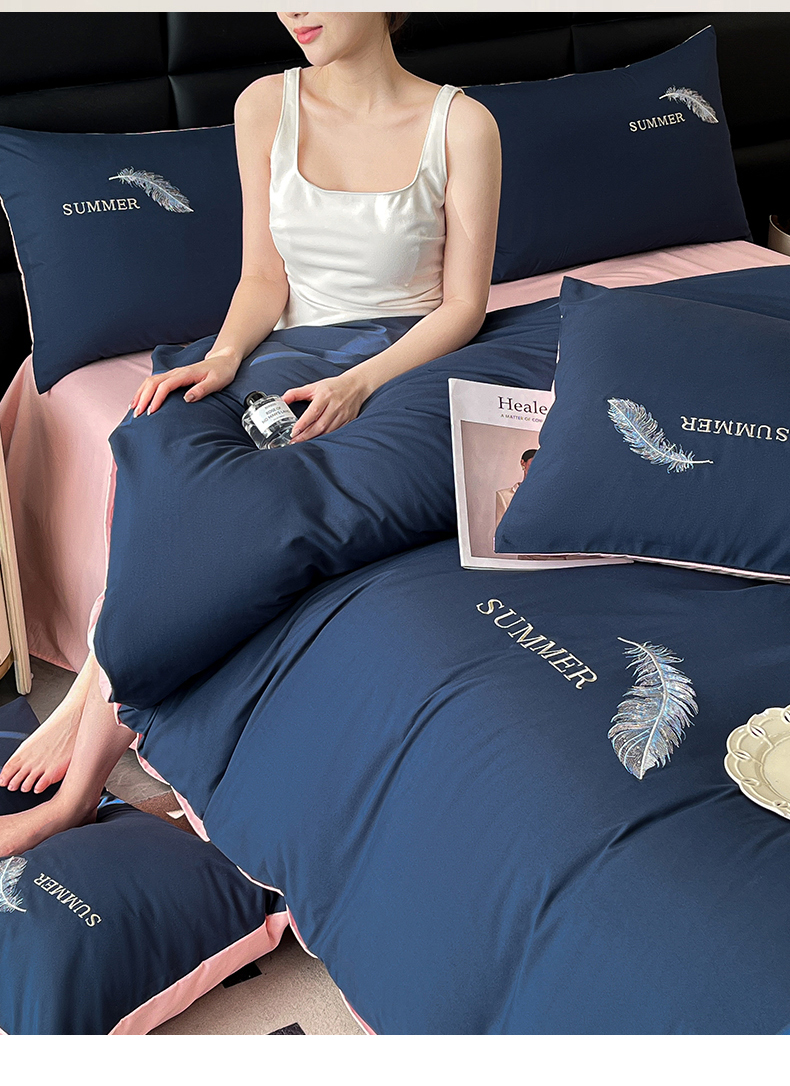 当前位置: 91家纺网 > 商品网购 > 床品套件 > 四件套 > 水洗棉四件套 > 火麒麟 2025新款亲肤水洗棉轻奢刺绣四件套-彩羽系列 彩羽-藏青-奶油粉