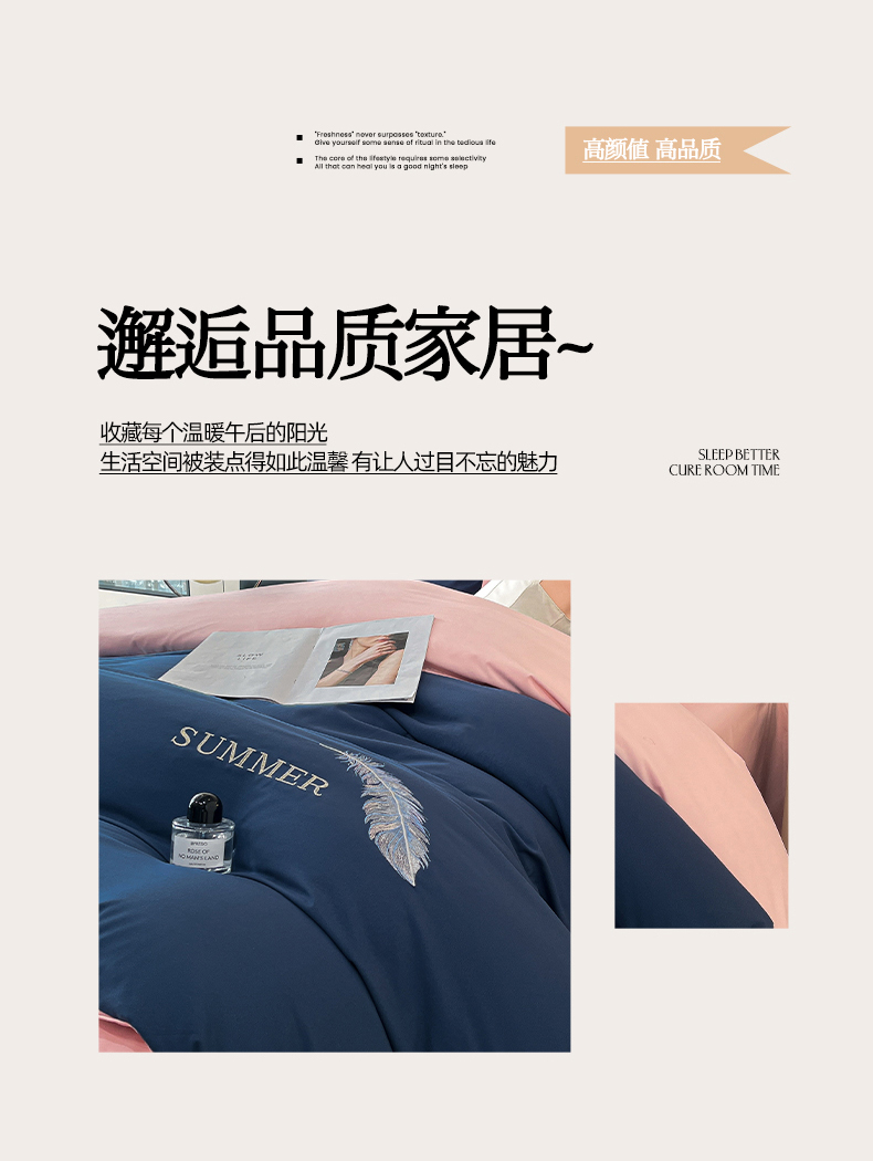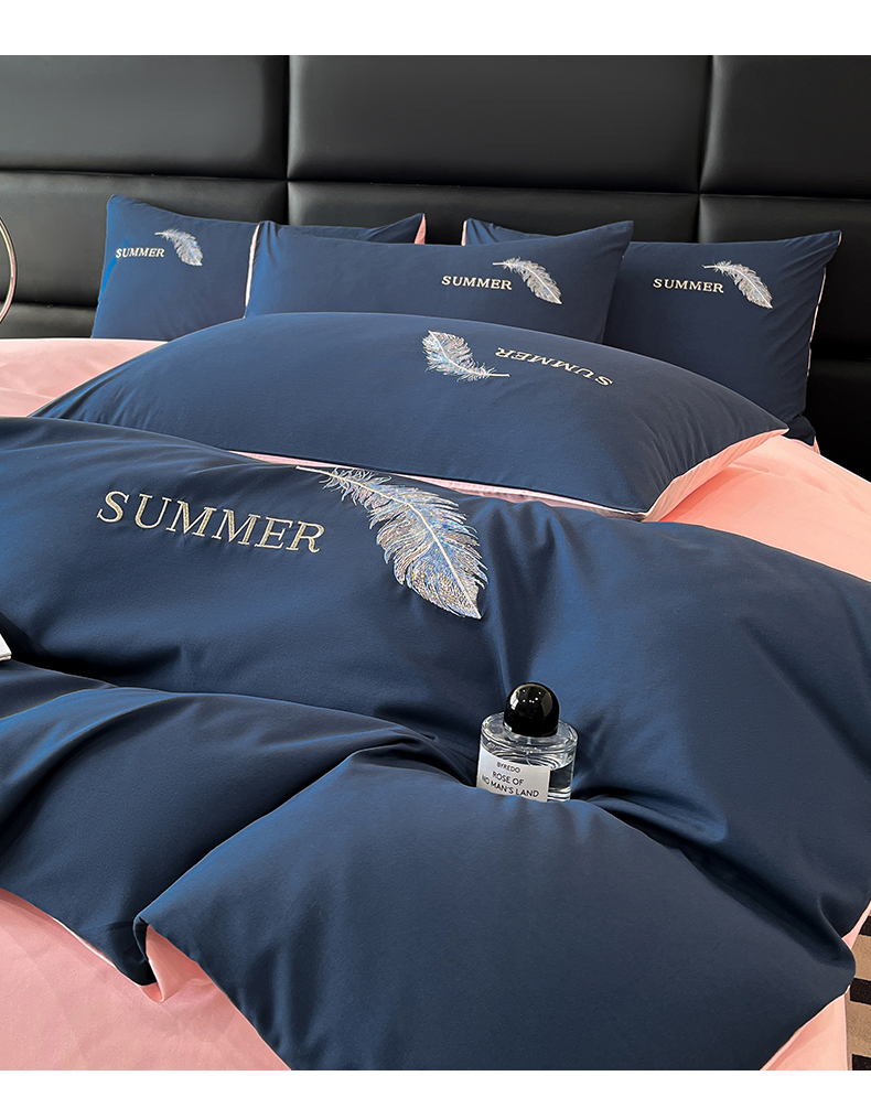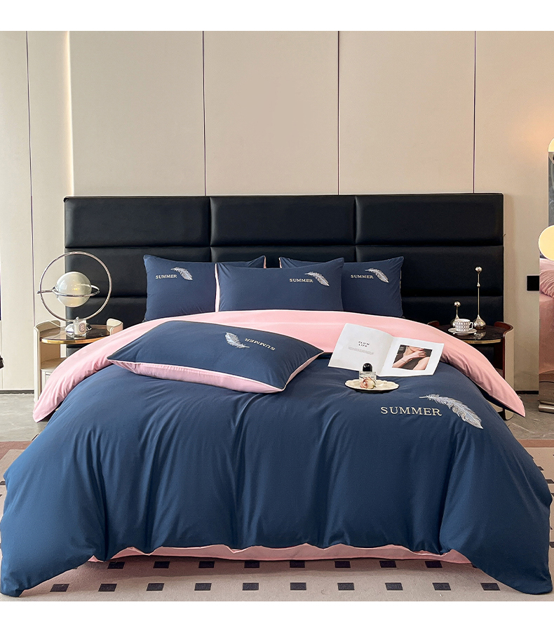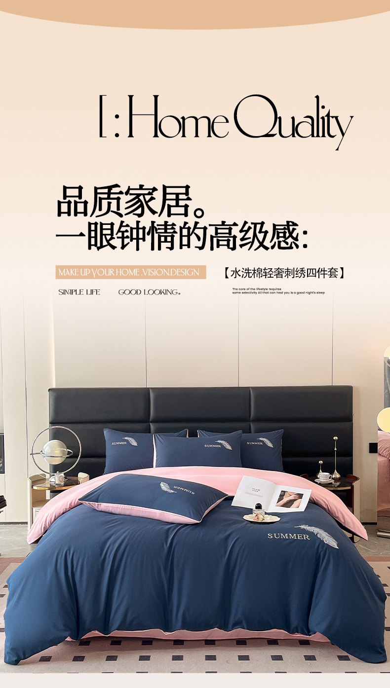 当前位置: 91家纺网 > 商品网购 > 床品套件 > 四件套 > 水洗棉四件套 > 火麒麟 2025新款亲肤水洗棉轻奢刺绣四件套-彩羽系列 彩羽-藏青-奶油粉