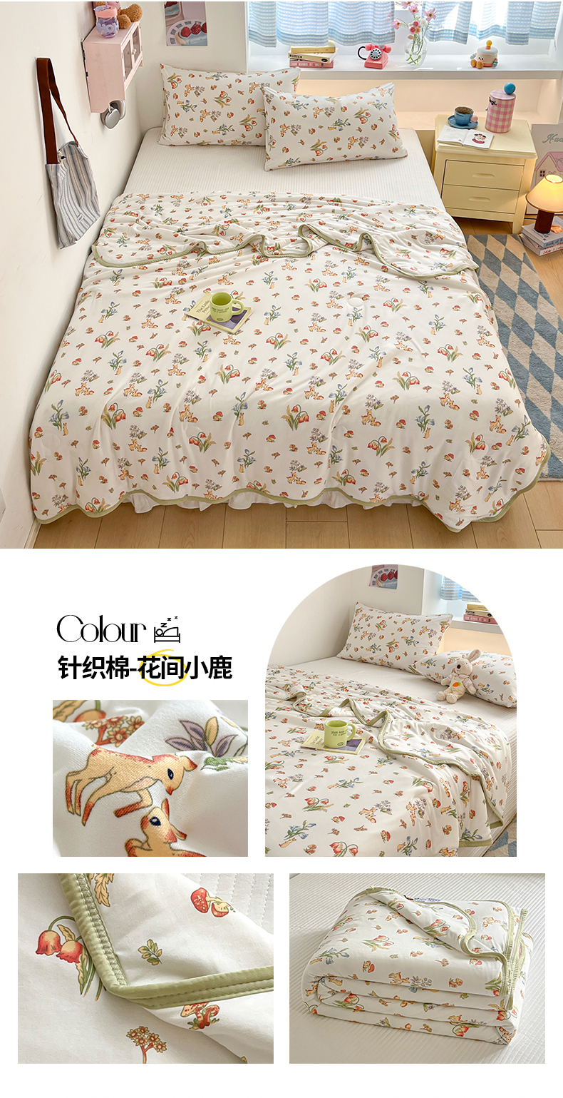 商品名称:桃子家居 2025新款A类高品质牛奶针织棉软糯大豆夏被 针织棉-花间小鹿