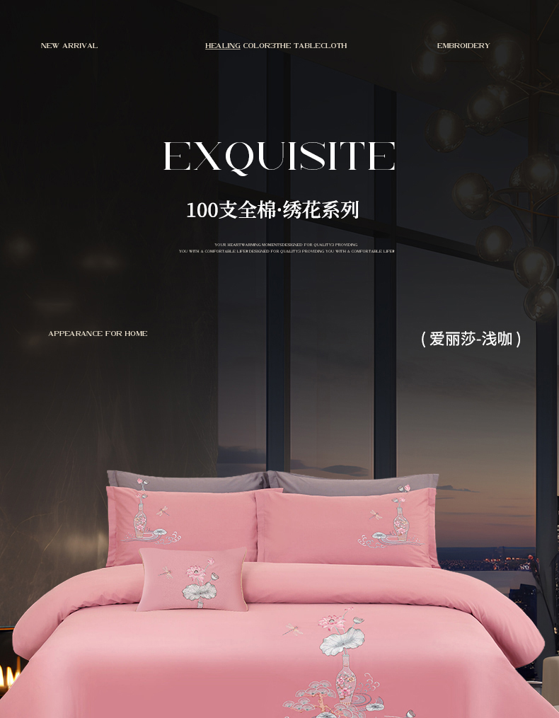 (总)浩情国际婚庆供货中心 2026新品-100支全棉长绒棉磨毛高端刺绣系列四件套,轻曼-豆沙,轻曼-湖兰,轻曼-米驼,轻曼-浅绿,轻曼-浅玉,轻曼-银灰,山水情-豆沙,山水情-粉玉,山水情-湖兰,山水情-米驼,山水情-浅灰,山水情-水兰